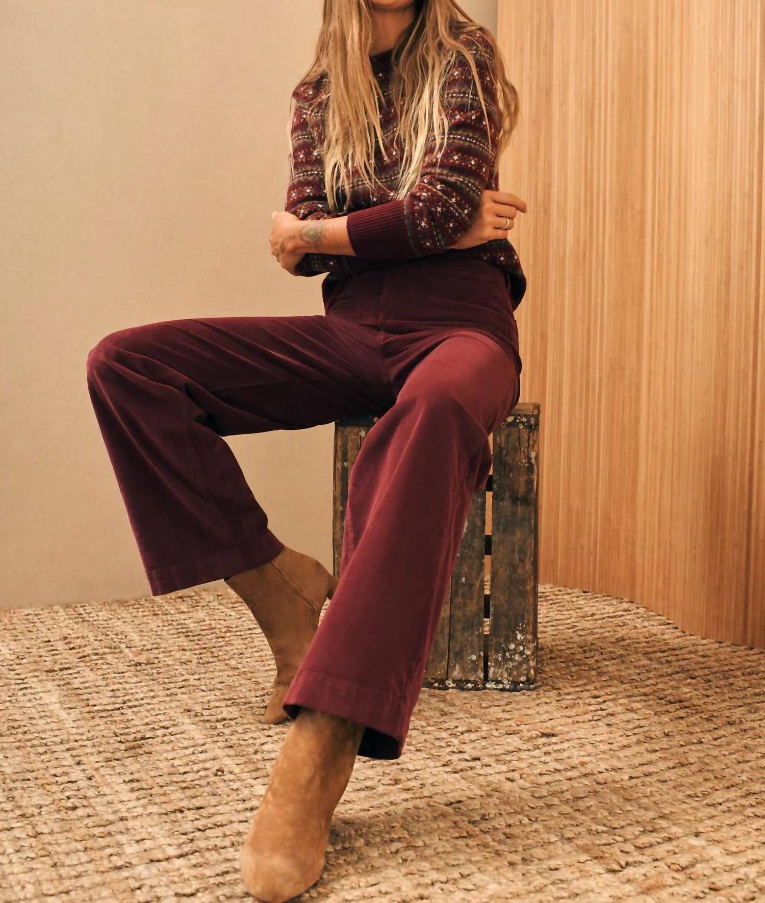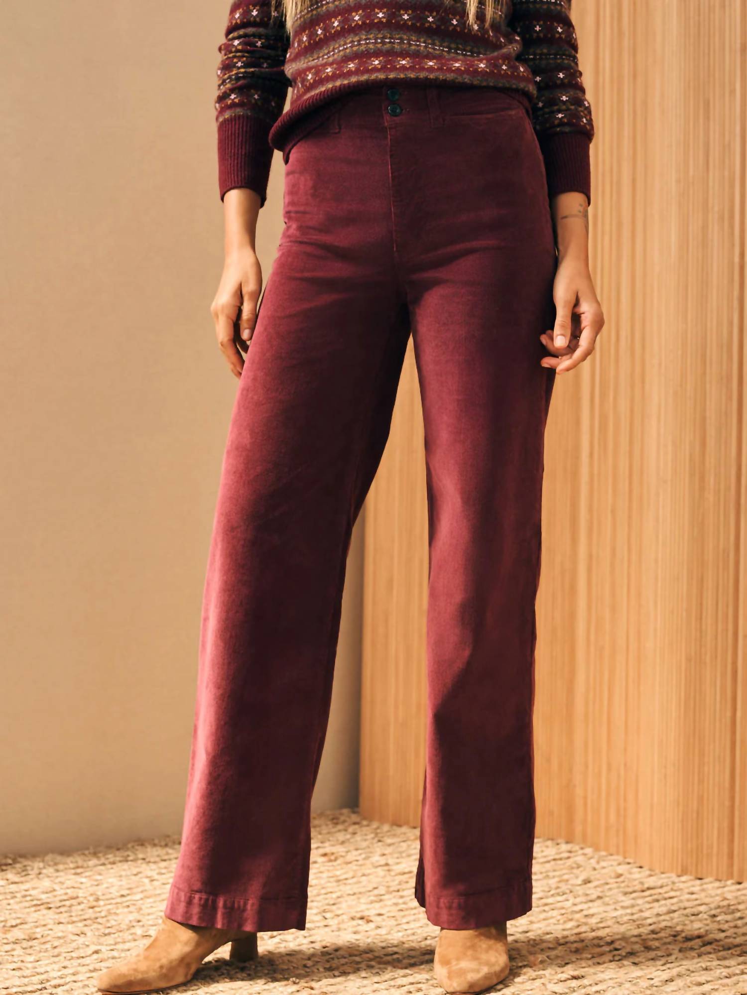 Introducing the Stretch Cord Wide Leg Pant by Faherty, a chic addition to any wardrobe in a maroon banner hue. These trousers feature a flattering wide leg fit with an 11 1/4-inch rise and a 32-inch inseam, perfect for creating a retro-inspired silhouette. Crafted from 73% organic cotton, 23% lyocell, and 2% elastane, the buttery soft stretch corduroy offers both comfort and durability. With a tall waistband, decorative stitching, button closure, and practical front patch pockets, these pants effortlessly transition from outdoor adventures to polished occasions. For care, close all zippers before washing, turn inside out, machine wash cold with like colors, and tumble dry low.