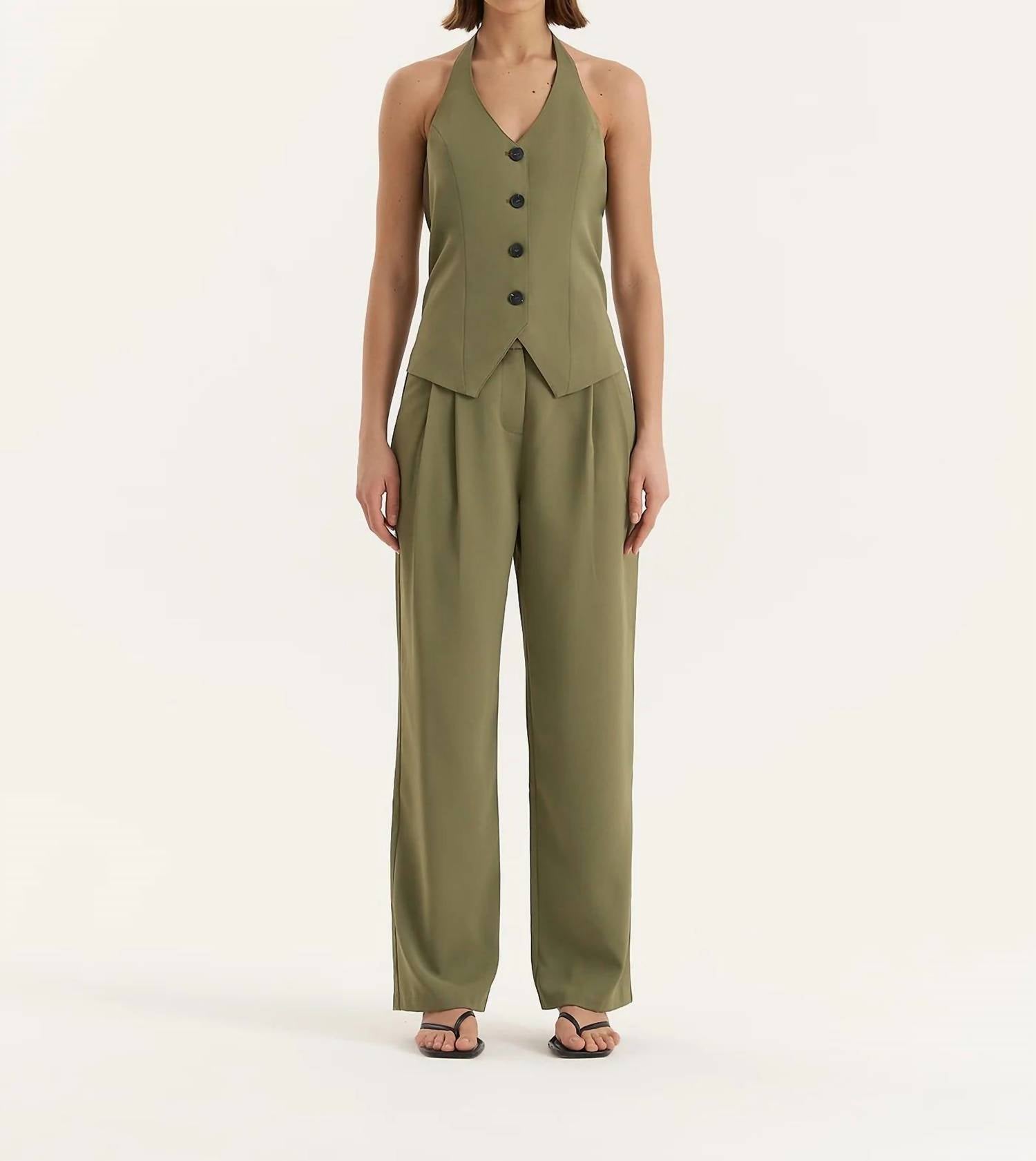 Embrace transitional style with the Sabrina Trouser by 4th & Reckless, crafted in a calming forest hue. These high-rise, straight-leg trousers feature a relaxed fit, tailored pleats, and practical pockets, enhancing both style and functionality. Made from 85% viscose, 15% polyester, they are finished with a button-up fastening and belt loops, perfect for versatile styling. Ideal for pairing with the matching Sabrina Vest or an oversized shirt, they're a must-have for your summer wardrobe.