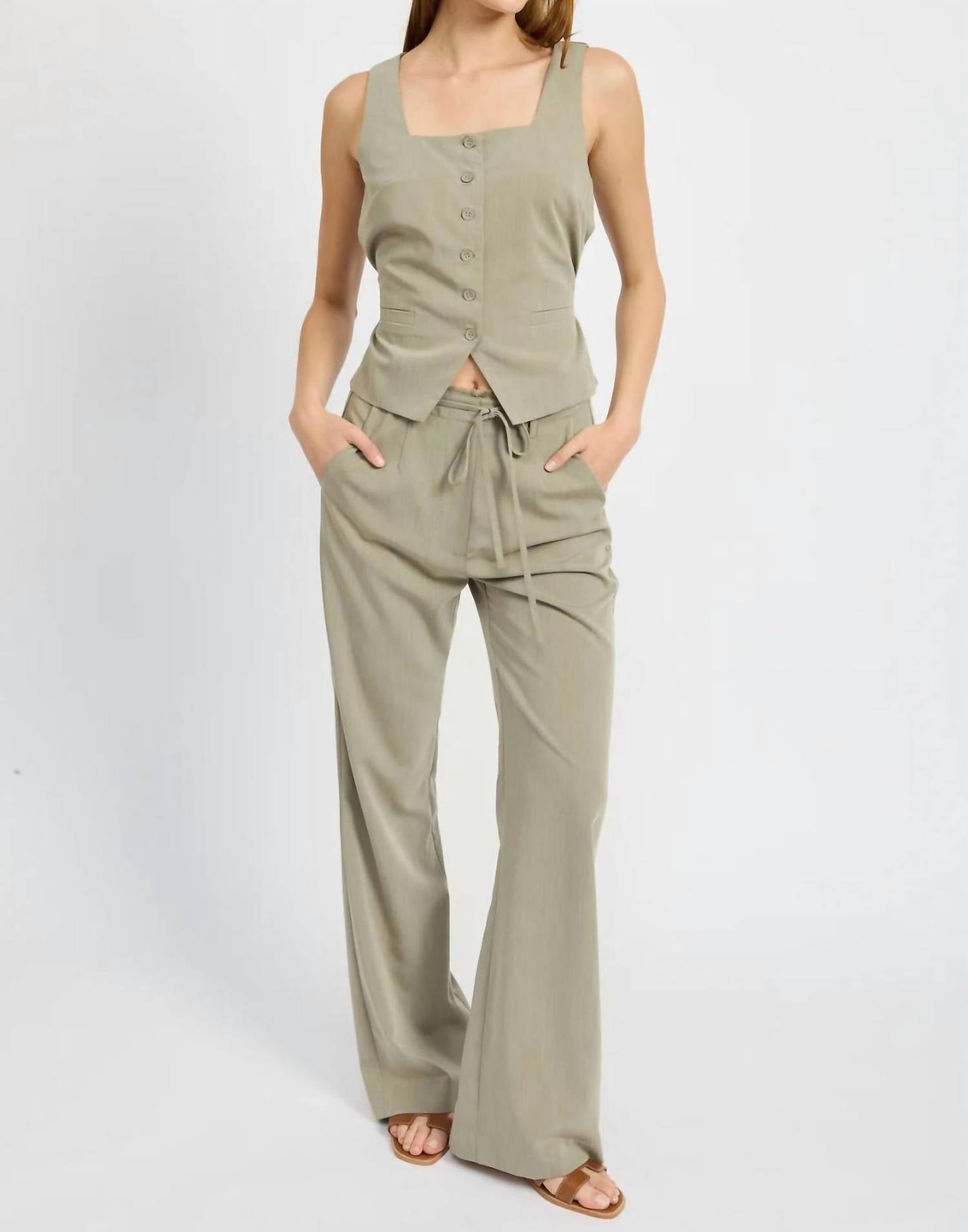 Elevate your wardrobe with the Roan Trouser by En Saison, featuring a wide-leg style and a chic lichen color for a minimalist vibe. The trousers are crafted from a blend of 77% polyester, 19% rayon, and 4% spandex with a polyester and spandex lining, offering both comfort and durability. They have a convenient zipper and hook closure, with pockets adding functional style. Designed for effortless sophistication, these trousers are perfect for spring dinners and Thanksgiving occasions. Care: Machine washable.