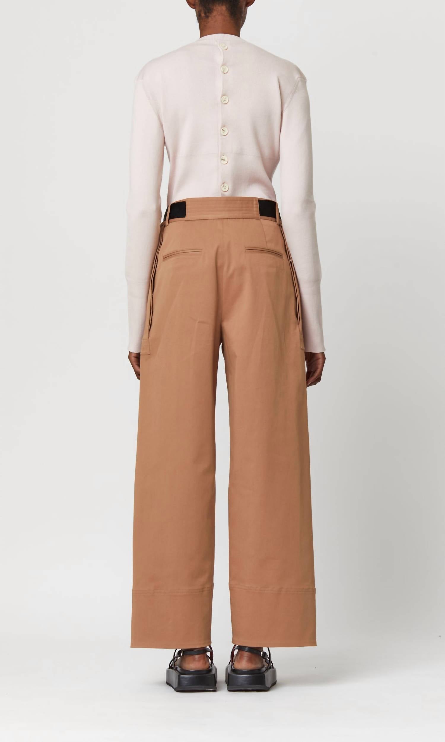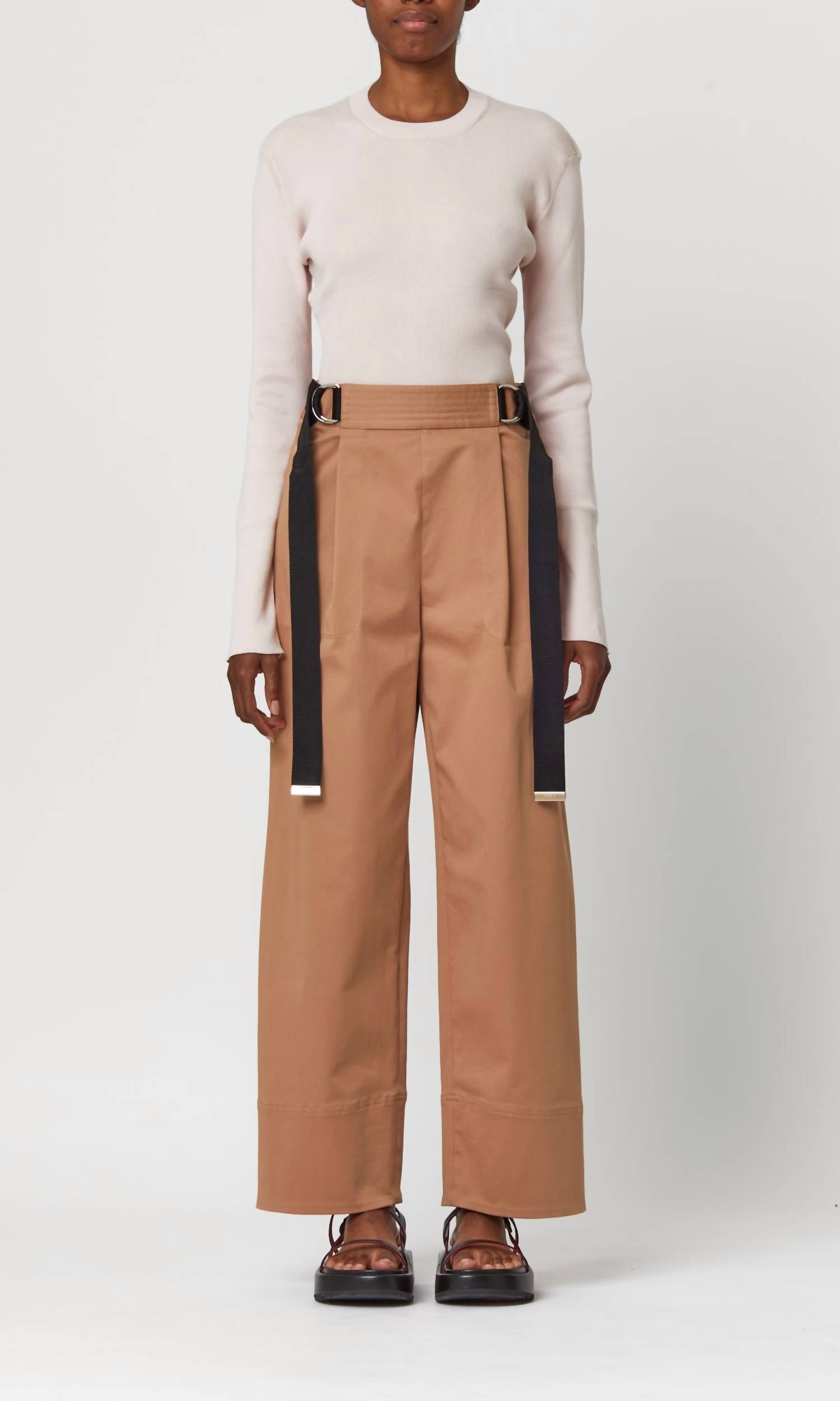 This Wide Leg Trouser features a high-rise waist, snap closures, and D-ring belts. Made in Italy from 97% cotton and 3% elastane, it offers a comfortable yet tailored fit.