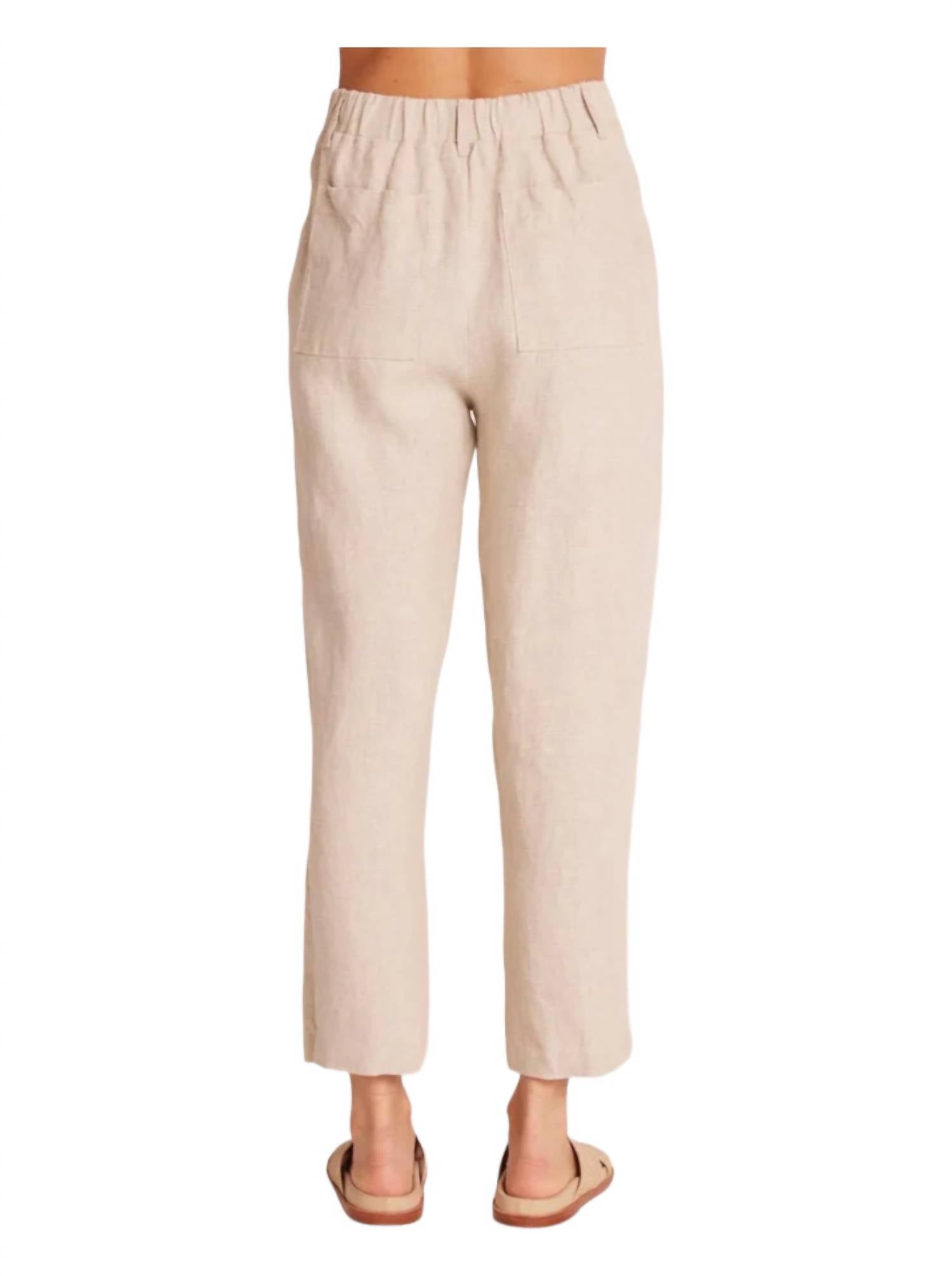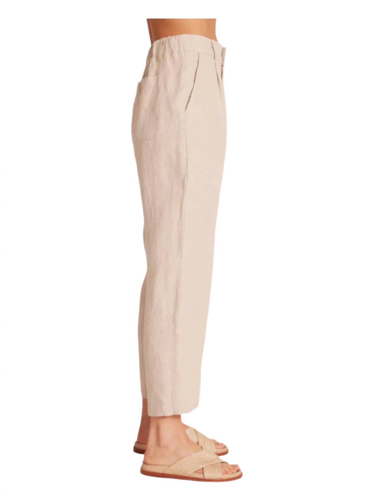 Relaxed fit. Pleat front trouser. Front zipper closure with front pockets. Elastic back waist. 100% Linen.