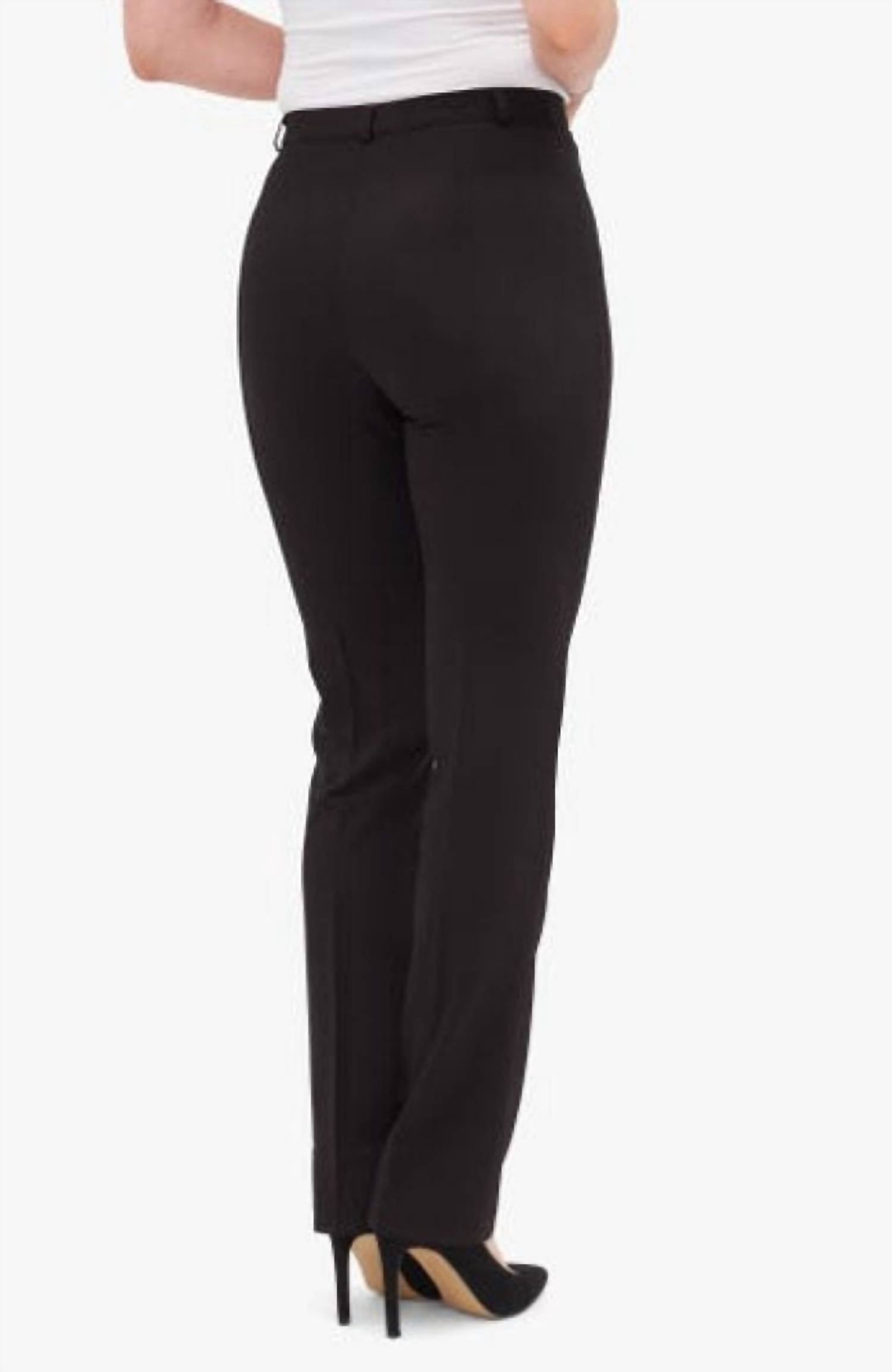 The TRIBAL Women's Petite Flatten It Trouser in classic black offers a sleek professional look with its mid-rise cut and straight leg design. Constructed from a soft twill blend of 75% Polyester, 20% Rayon, and 5% Spandex, it features a versatile trouser-style fit with an exclusive built-in tummy-control panel to shape and flatten. Designed for comfort and style, this Canadian-made piece includes practical pockets and a button closure. The petite fit ensures a flattering silhouette for a polished appearance.