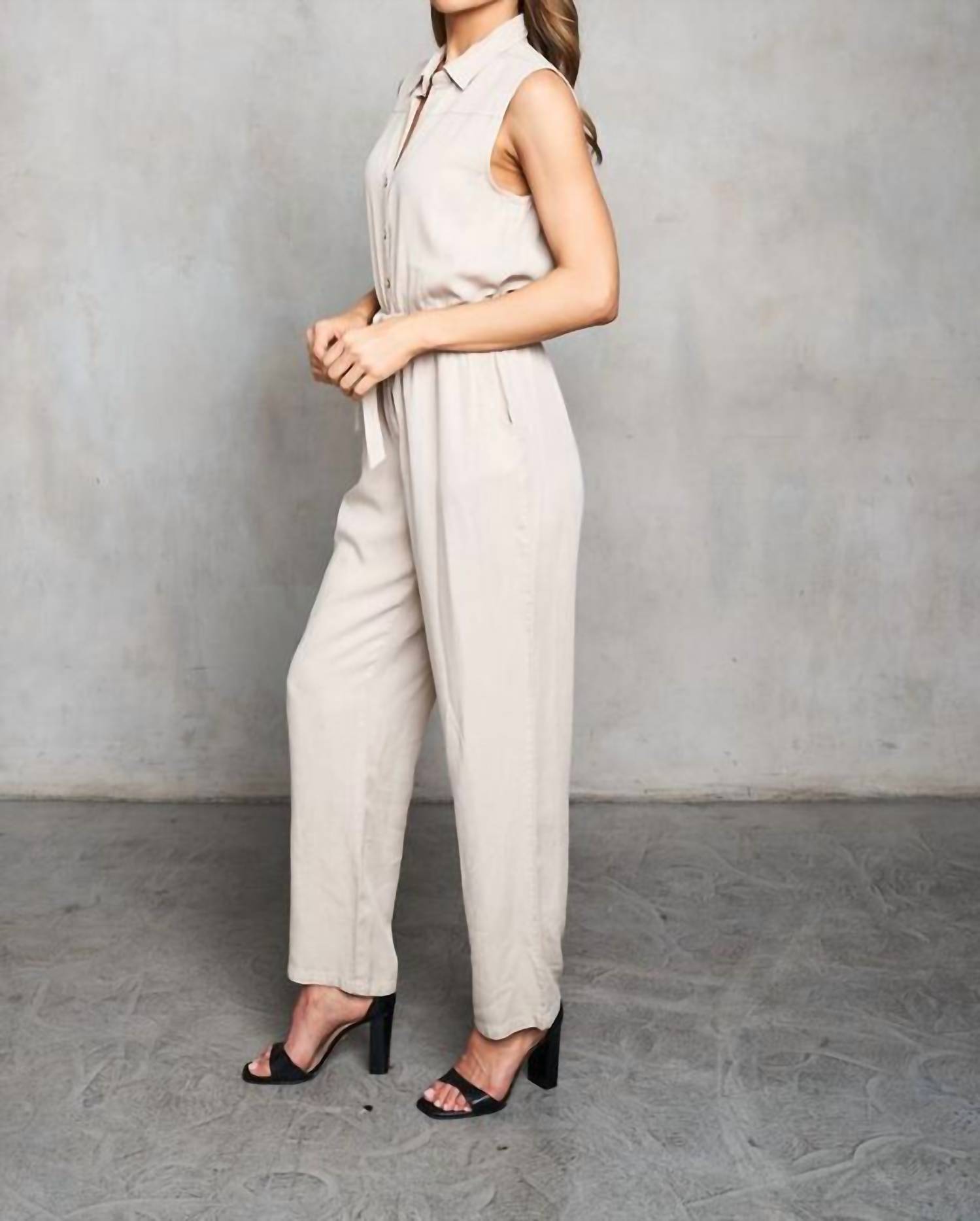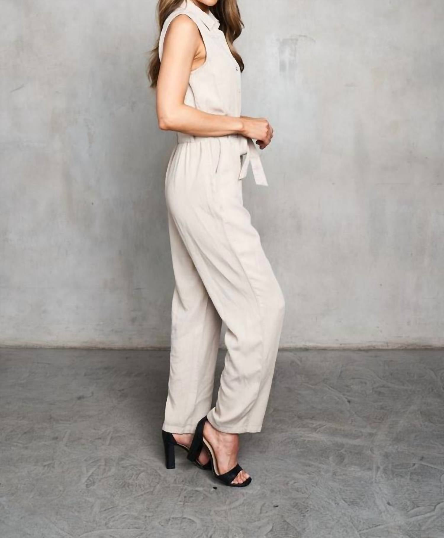 Elevate your vacation style with the Women's Slub Jumpsuit by PAPARAZZI, a minimalist must-have in a versatile khaki hue. Designed for comfort and style, this sleeveless jumpsuit features a snap front placket with a collar and yoke shoulder for a tailored look. The elastic waist, complete with a self-belt, enhances your silhouette, while the straight leg design adds a touch of sophistication. Closure: Pull On. Ideal for summer vacations, this jumpsuit includes inseam side pockets for practicality, perfect for the on-the-go woman.