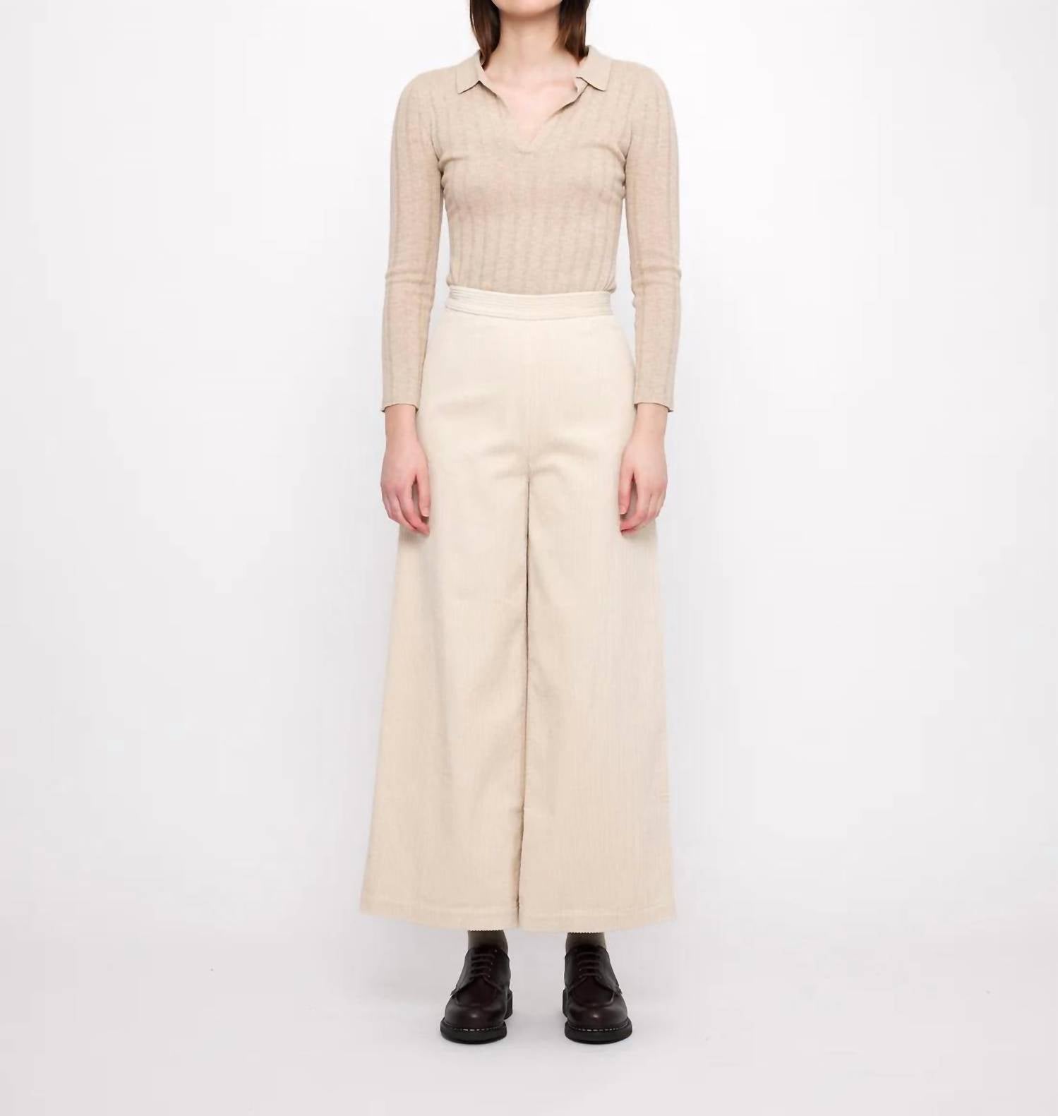Experience superior comfort and style with the Classic Wide Legged Trouser by 7115 by SZEKI in Pearl. These high-waisted trousers feature a relaxed fit with a wide leg style, crafted from plush, mid-wale corduroy material that is 100% cotton. Equipped with a side zipper and button closure, they offer a sleek, minimalist aesthetic with two flat back pockets. Ethically made in small batches in Guangzhou City and Dongguan, China, the trousers boast measurements of 14" rise and 27" inseam and are best cared for with gentle wash and lay flat to dry or dry clean only. Julie, at 5'9", showcases this piece in size small, embodying a nod to 90s fashion perfect for fall travels and Thanksgiving occasions.