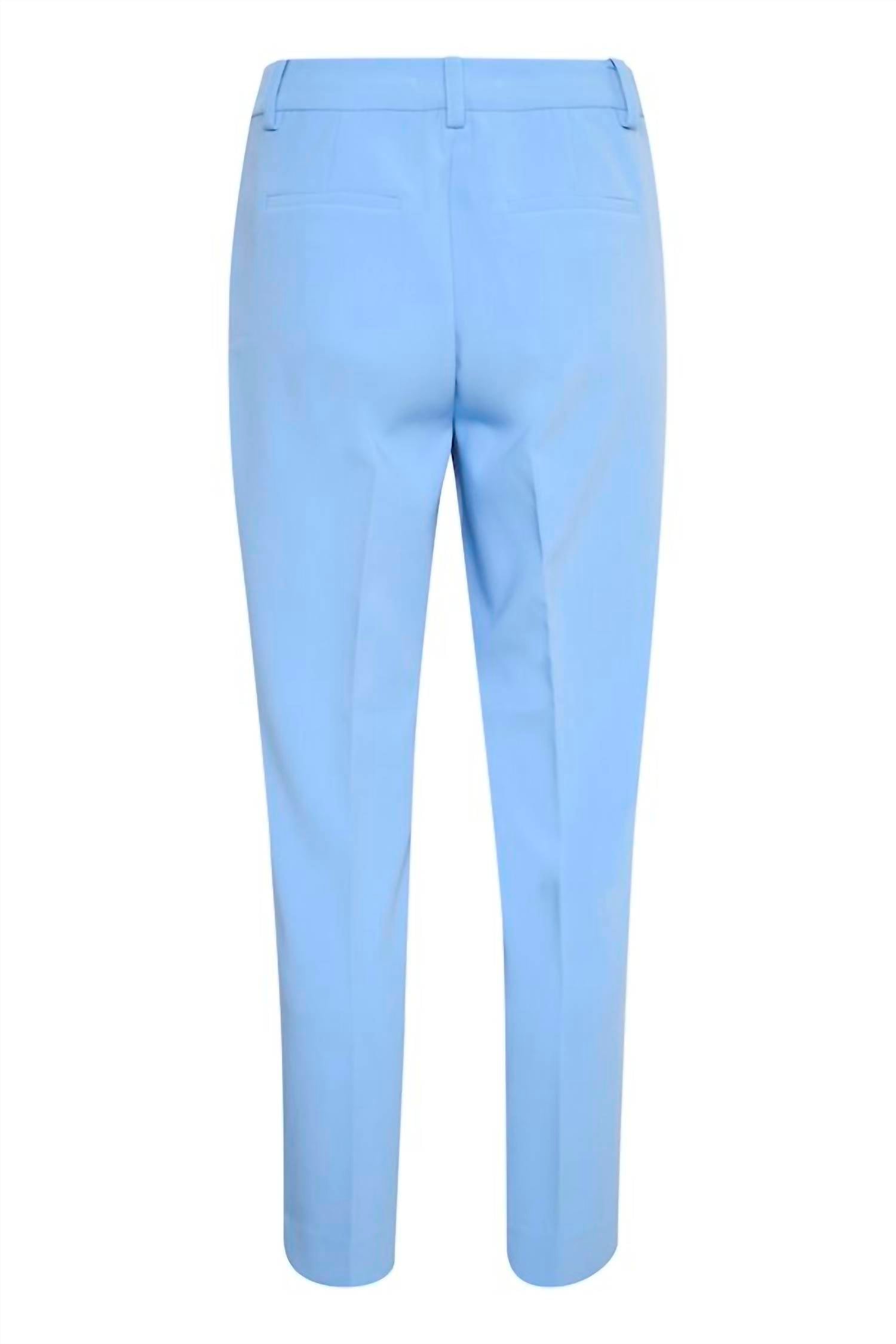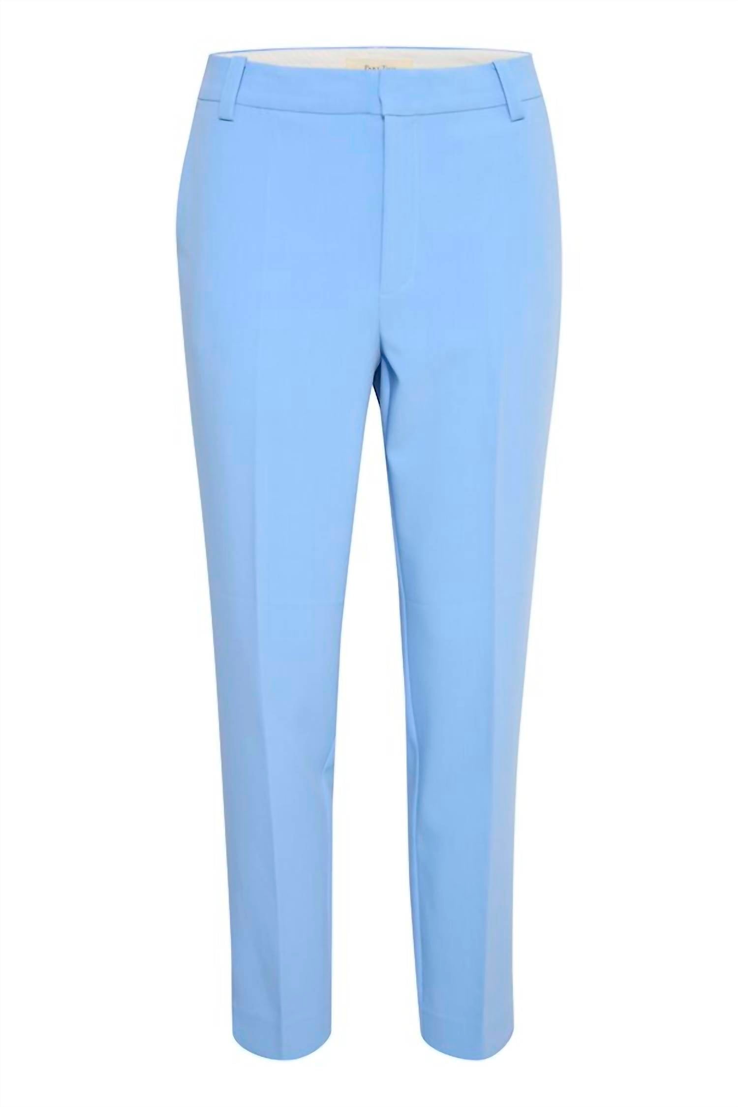 Elevate your everyday style with the Urbana Trouser by Part Two, crafted for versatility beyond the office. Designed with a high-rise waist, these trousers boast a straight leg cut and a flattering ankle-length hem. Made from 51% Recycled Polyester, 27% Polyester, 18% Viscose, and 4% Elastane, they offer comfort and sustainability. Originating in solid blue, they feature a zip fly and hook closure with practical front slash and back welt pockets. Care for these elegant trousers with a gentle 30-degree wash, cold iron, and they are suitable for dry cleaning. Length: 70.5 cm for size 38. Model is 5'10" and wearing size 36.