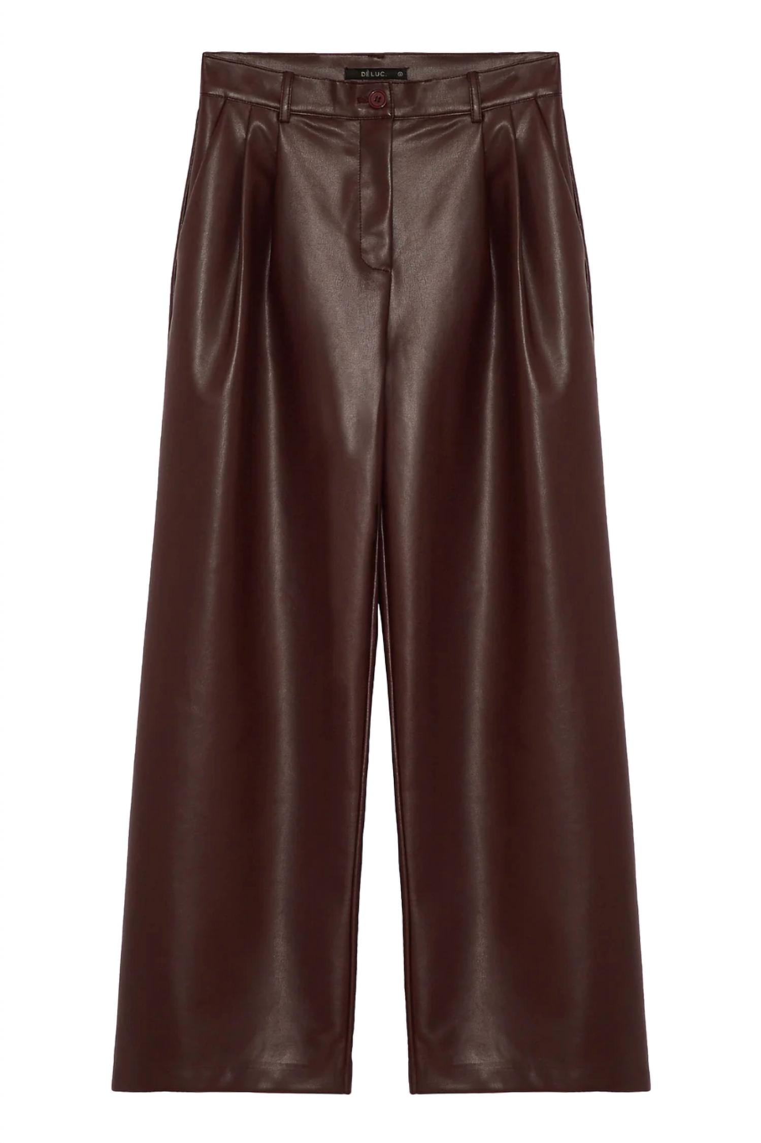 Featuring a high waist and wide leg design, faux leather pant. Front pleats. 100% PU.