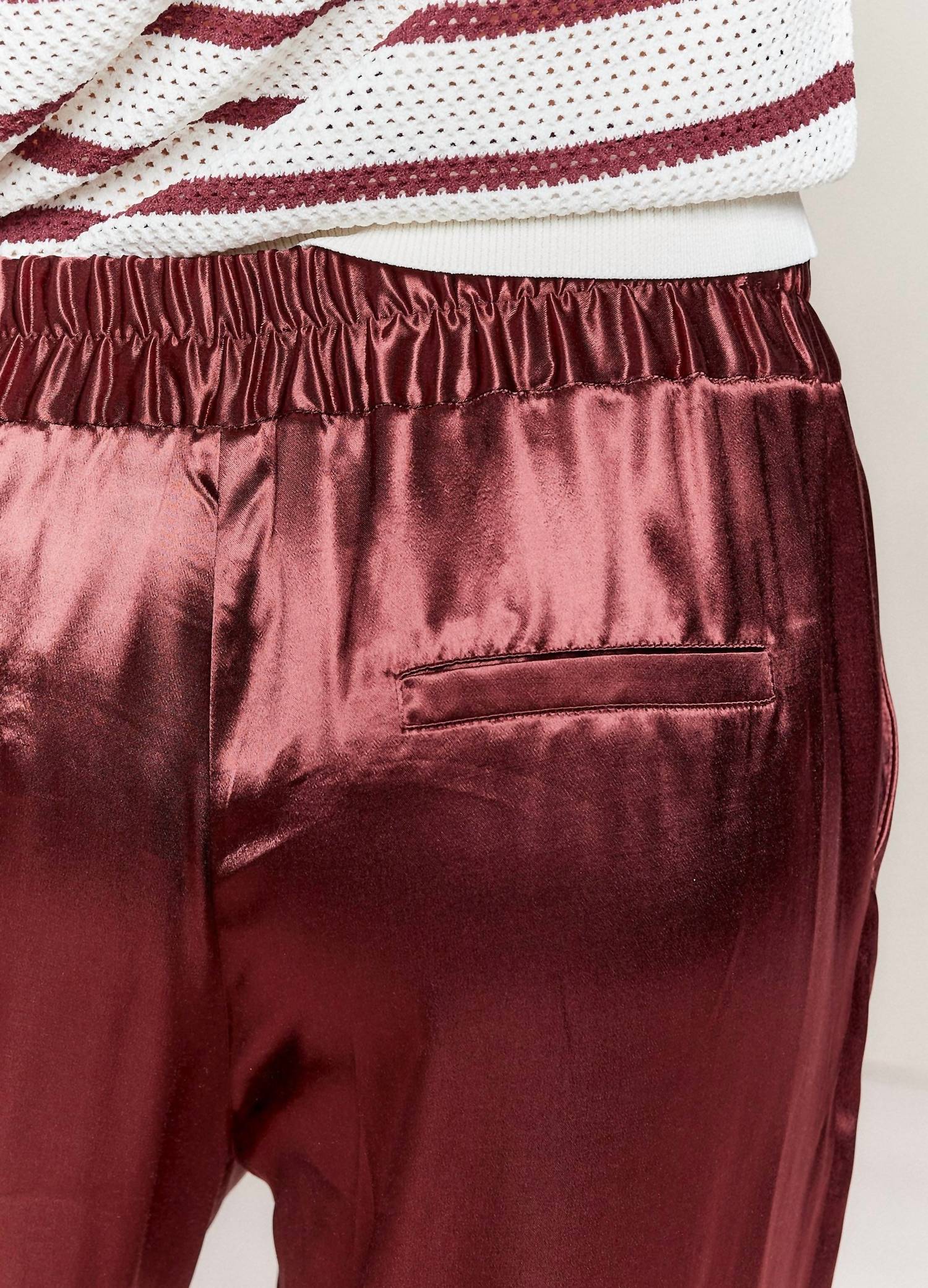 Elevate your wardrobe with the Satin Trousers by Summum, featuring a vibrant Red Grape hue for a touch of elegance. Crafted entirely from 100% viscose, these trousers offer a shiny, flowy silhouette that's perfect for any occasion. They include practical slit pockets at the front and strip pockets at the back for added convenience. Enjoy the comfort of an elasticated waist, making these solid pattern trousers a stylish and versatile choice for any outfit.