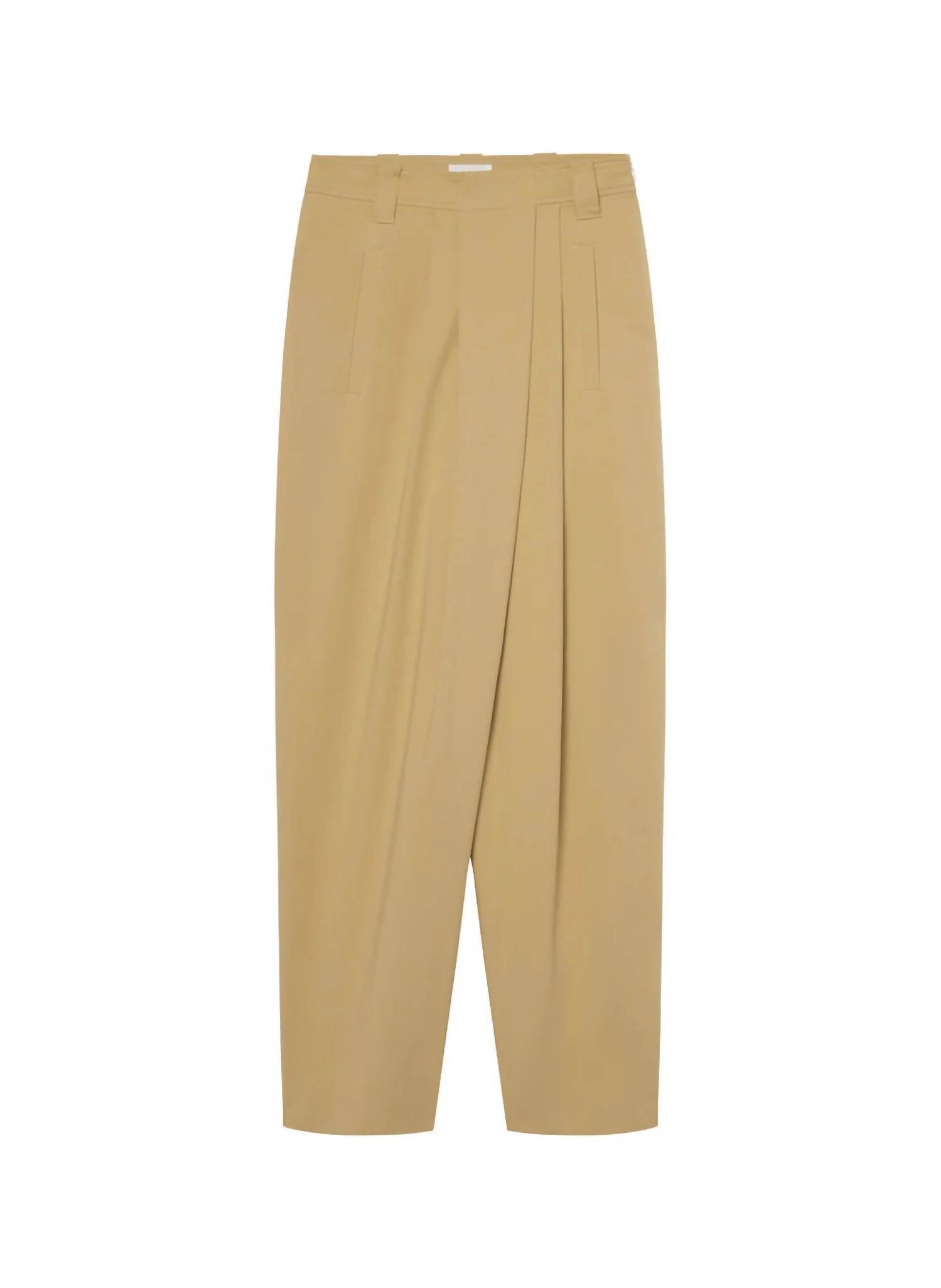 Introducing the Brody Pleated Pant by A.L.C., crafted from a luxurious cotton blend for ultimate comfort and style. This full-length pant features a high-rise waist and wide legs with front pleats, offering a relaxed fit in an elegant desert beige hue. Closure is via a zip, with key measurements for size 4 being a 13.25" rise and 31.5" inseam. Made from 95% cotton and 5% elastane, it provides a breathable feel, while care requires dry cleaning. Model is 5'10", wearing size 4 with bust 29", waist 23.5", and hips 35".