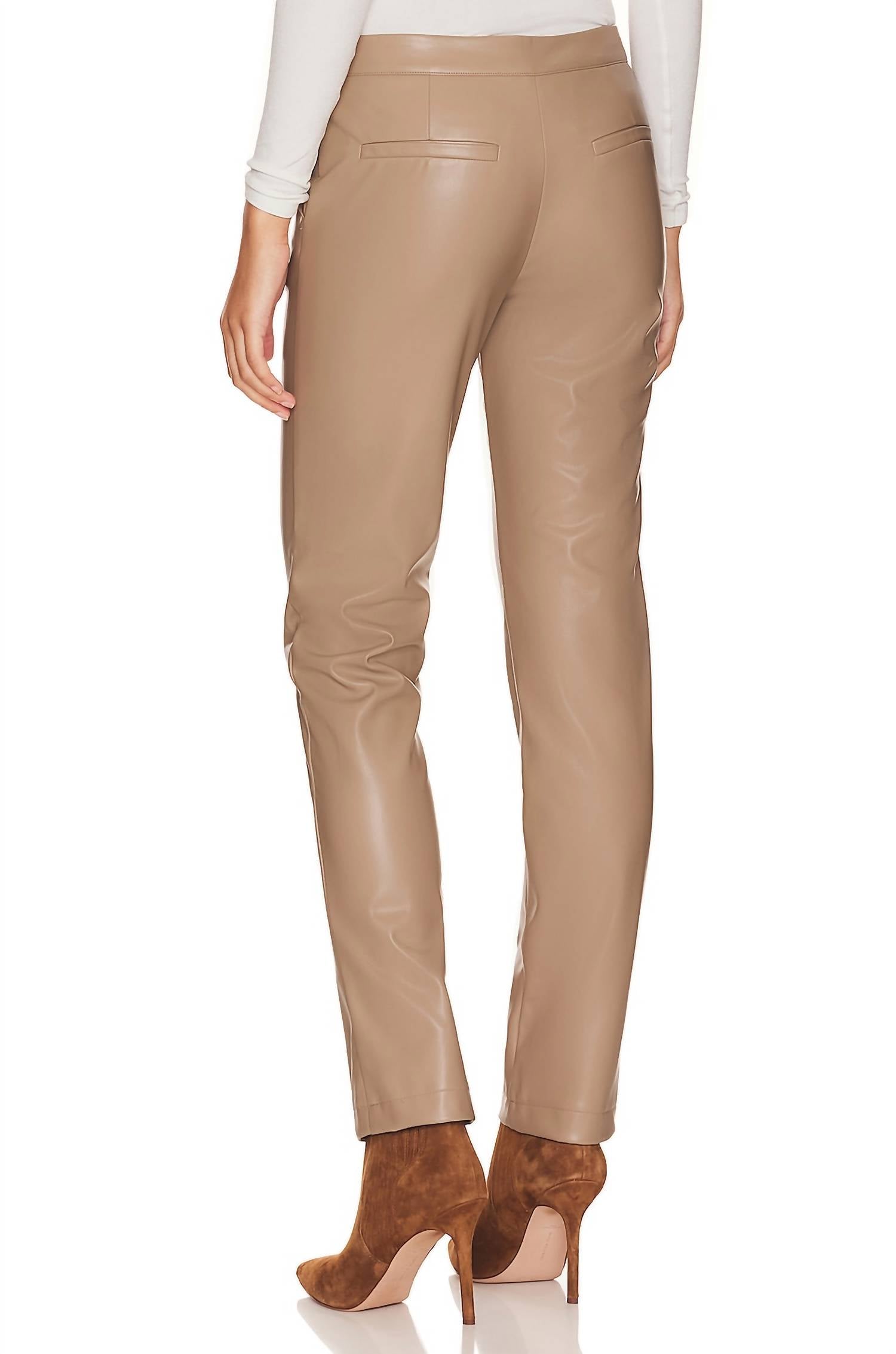 These edgy faux leather pants feature a trouser cut, ankle length, and side button waist tabs, creating a sleek and modern silhouette. The side pockets and back decorative pockets add a touch of functionality and style, while the zipper and hook and eye front closure ensure a secure fit. Crafted from a blend of 50% PU and 50% polyester, these pants offer a comfortable and durable wear. Hand wash cold to preserve their quality. The model, who is 5'11", is wearing a size S, with an inseam of 30 inches, a rise of 10 inches, and a leg opening of 14 inches.