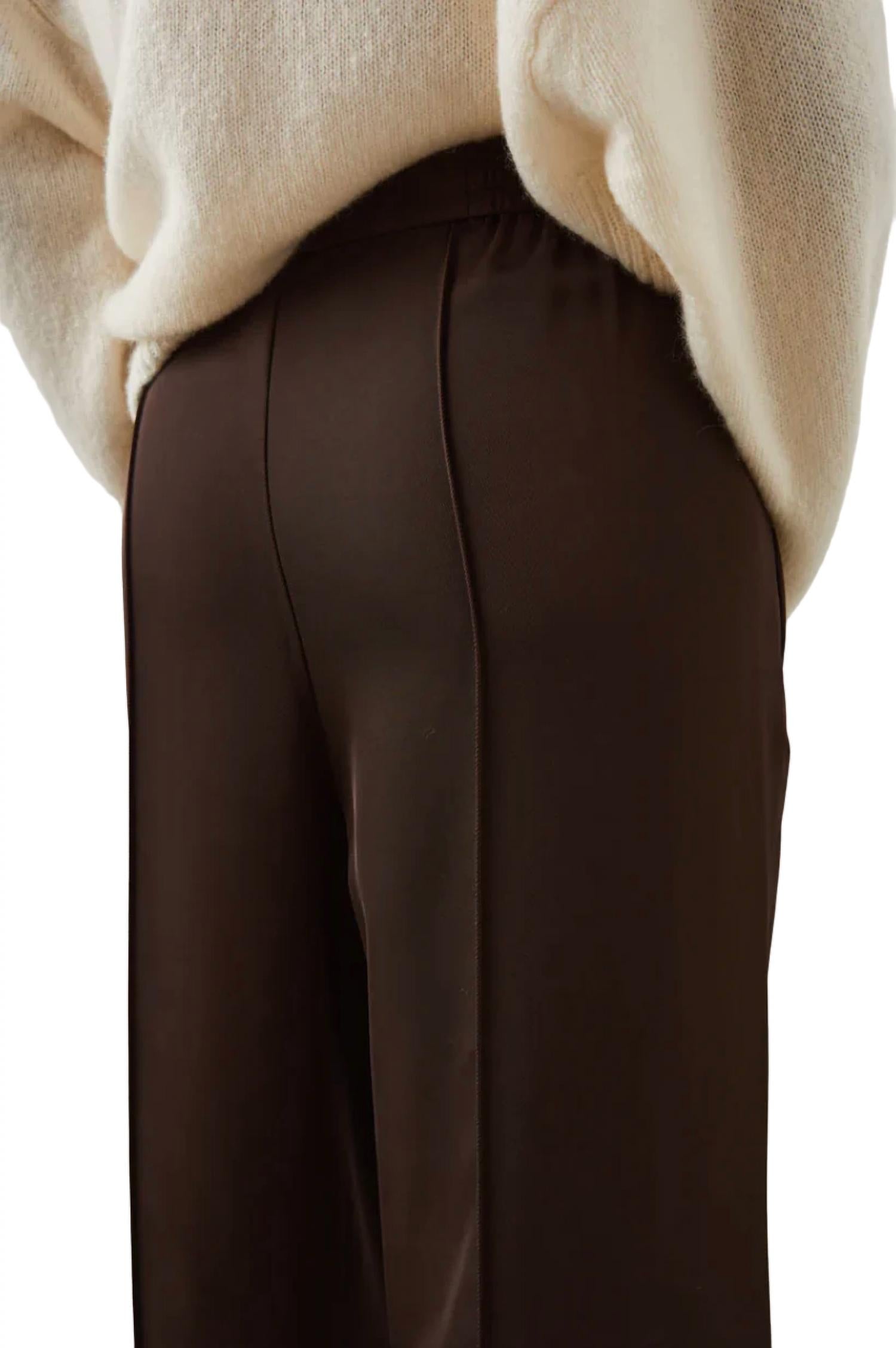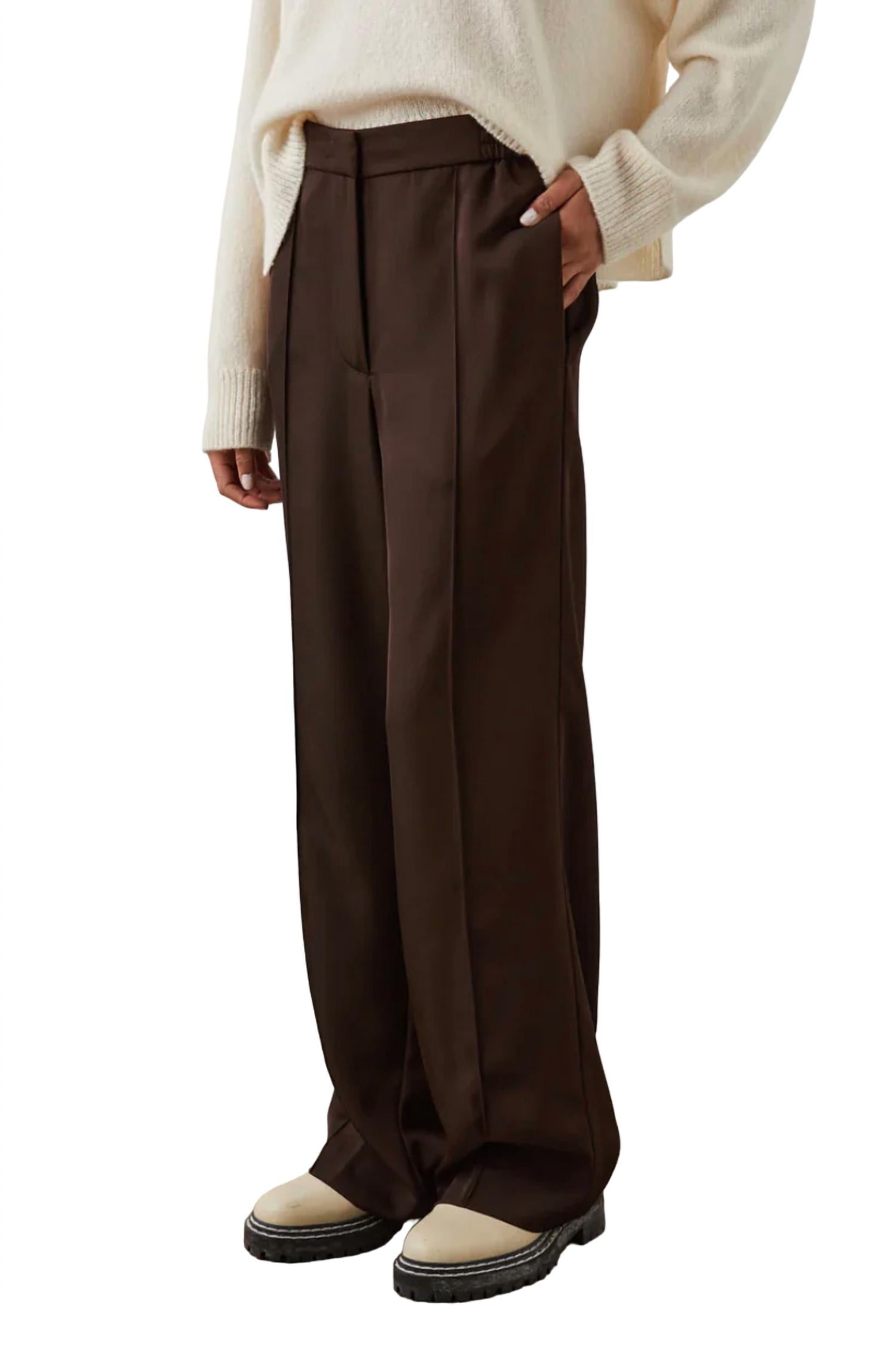 With vertical pleating and a straight silhouette, these chocolate brown pants are a staple. 100% Polyester. Imported. Recommend ordering true to size. Inseam Length: 31" (Measured from size 25). Front Rise Length: 12 1/4". Model is wearing size S. Dry clean only.