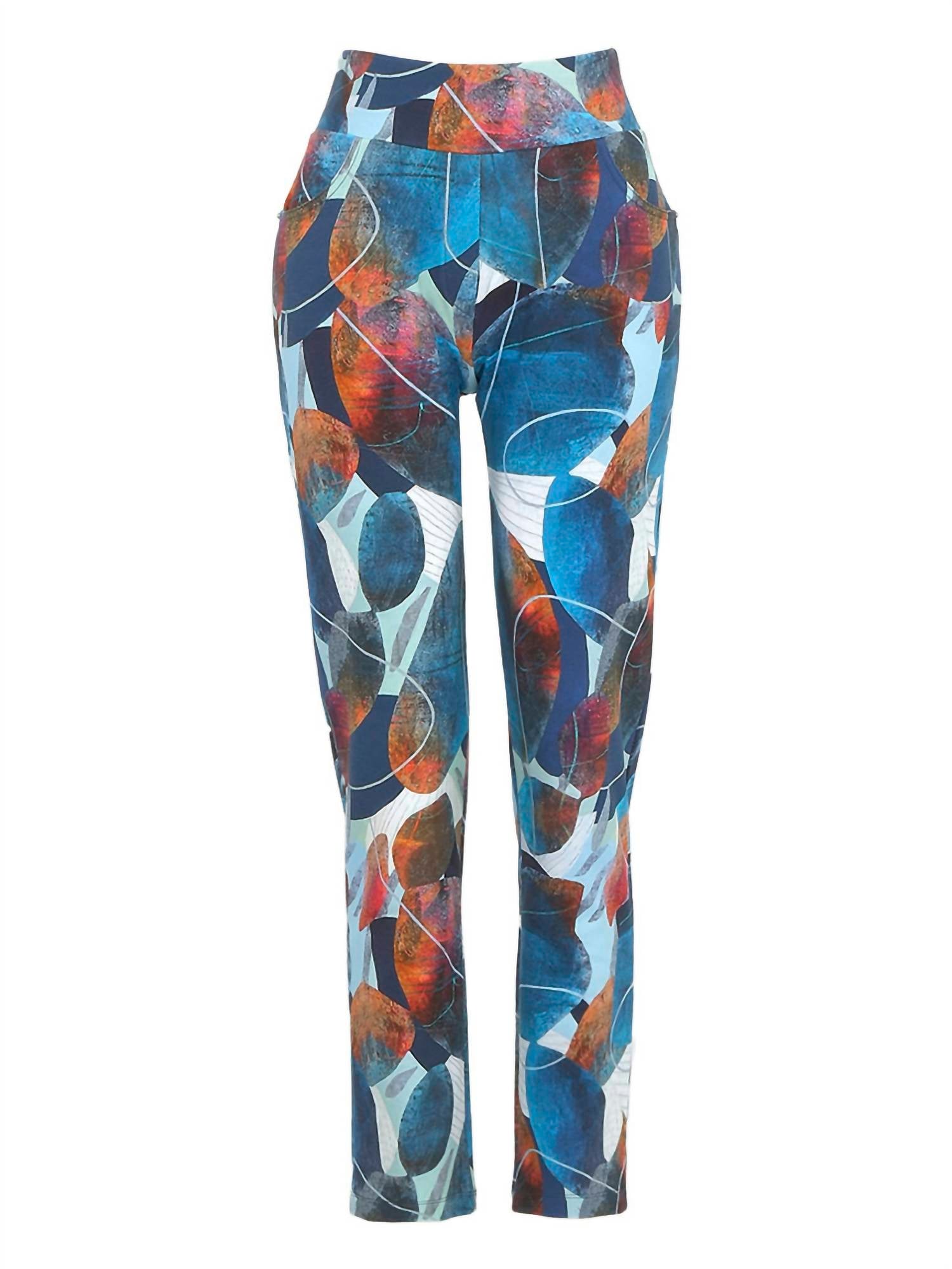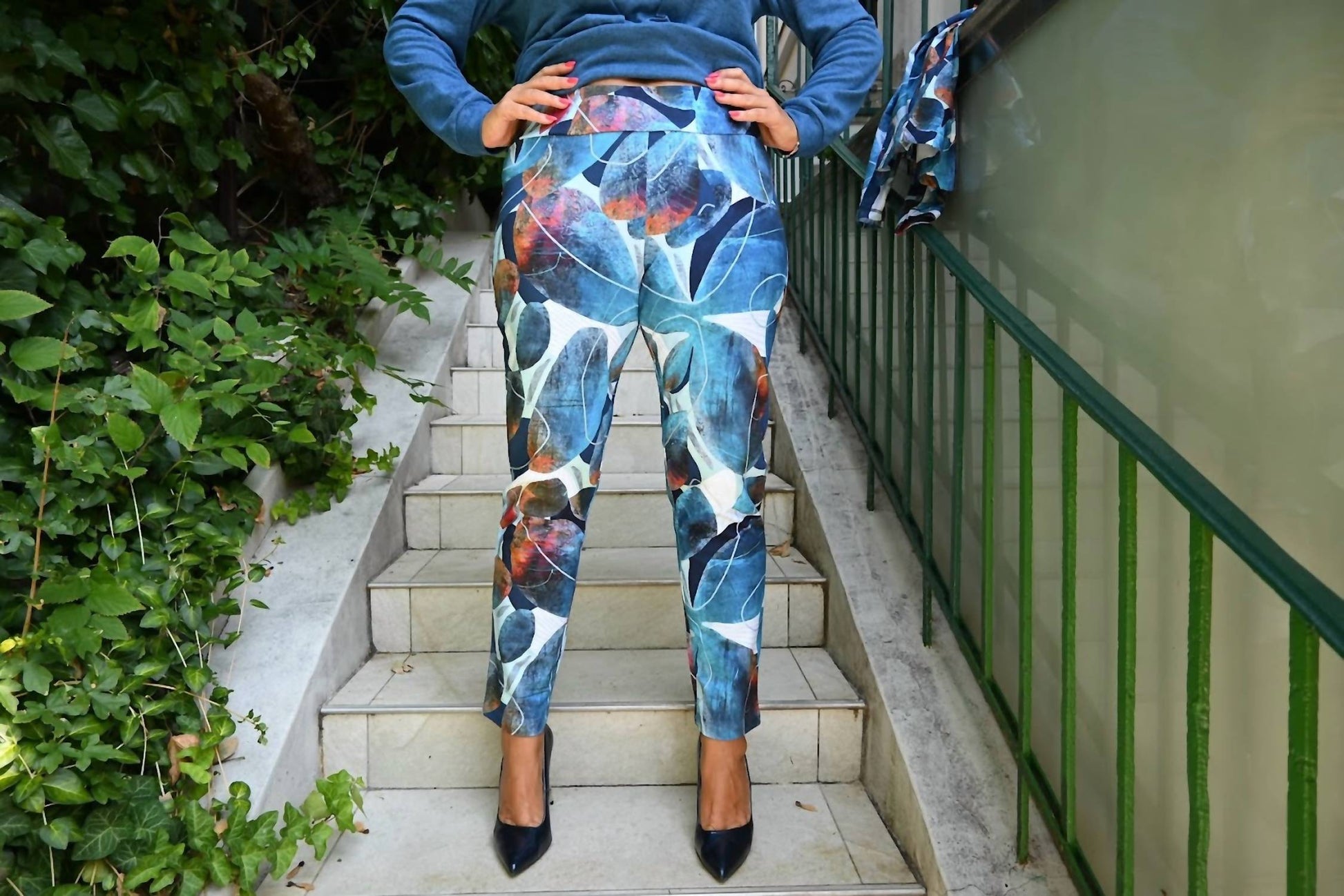 Introducing the Leaves Knit Trousers by Dolcezza, a perfect addition to your spring wardrobe with a boho chic flair. These patterned, high-rise blue trousers are tailored in a slim fit, featuring a convenient pull-on closure. Crafted from a comfortable cotton blend—75% cotton, 15% polyester, and 10% elastane—they are both stylish and practical with pockets. Easy to care for through machine wash, they make an ideal choice for your Easter vacation outfit.