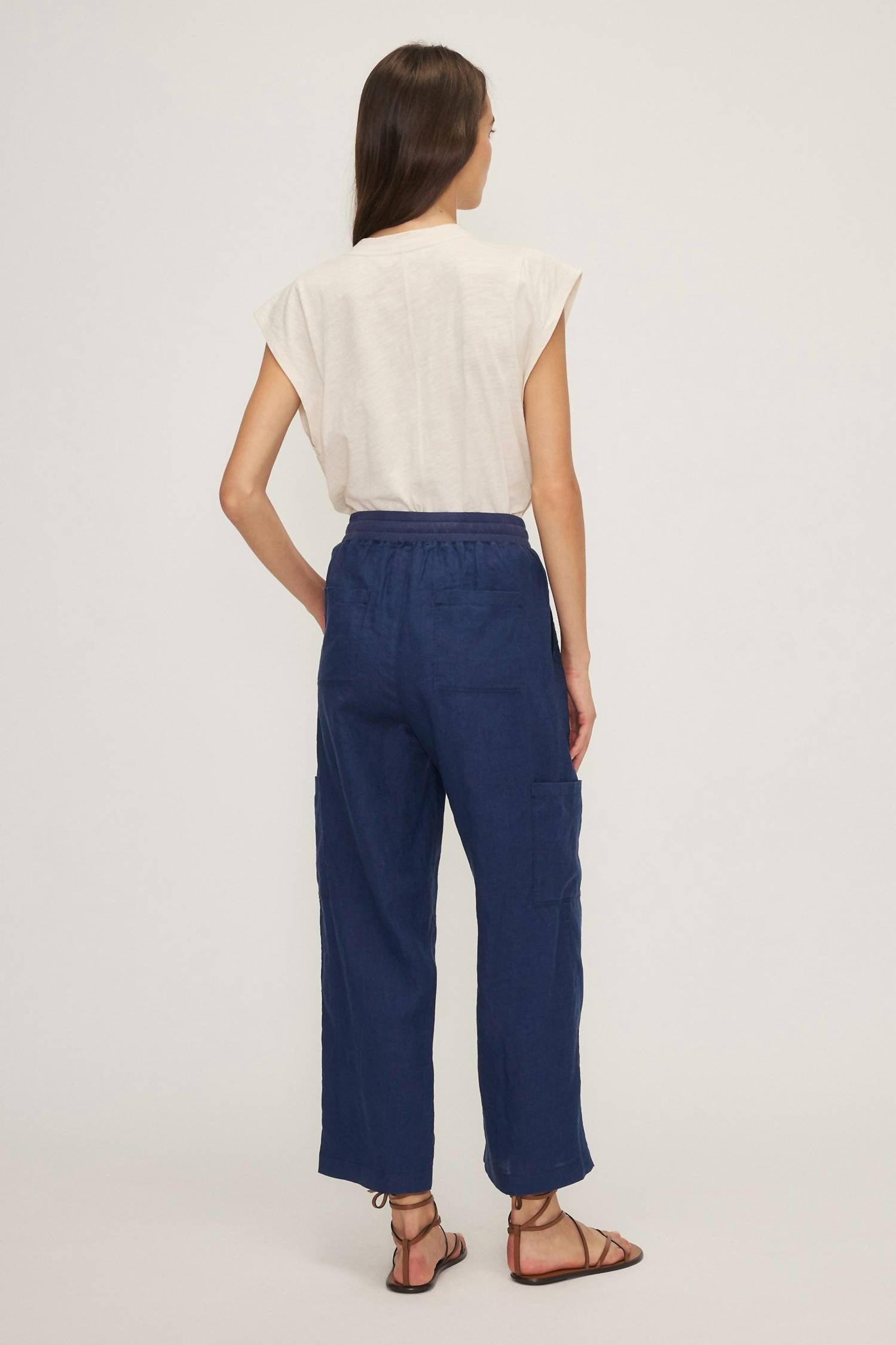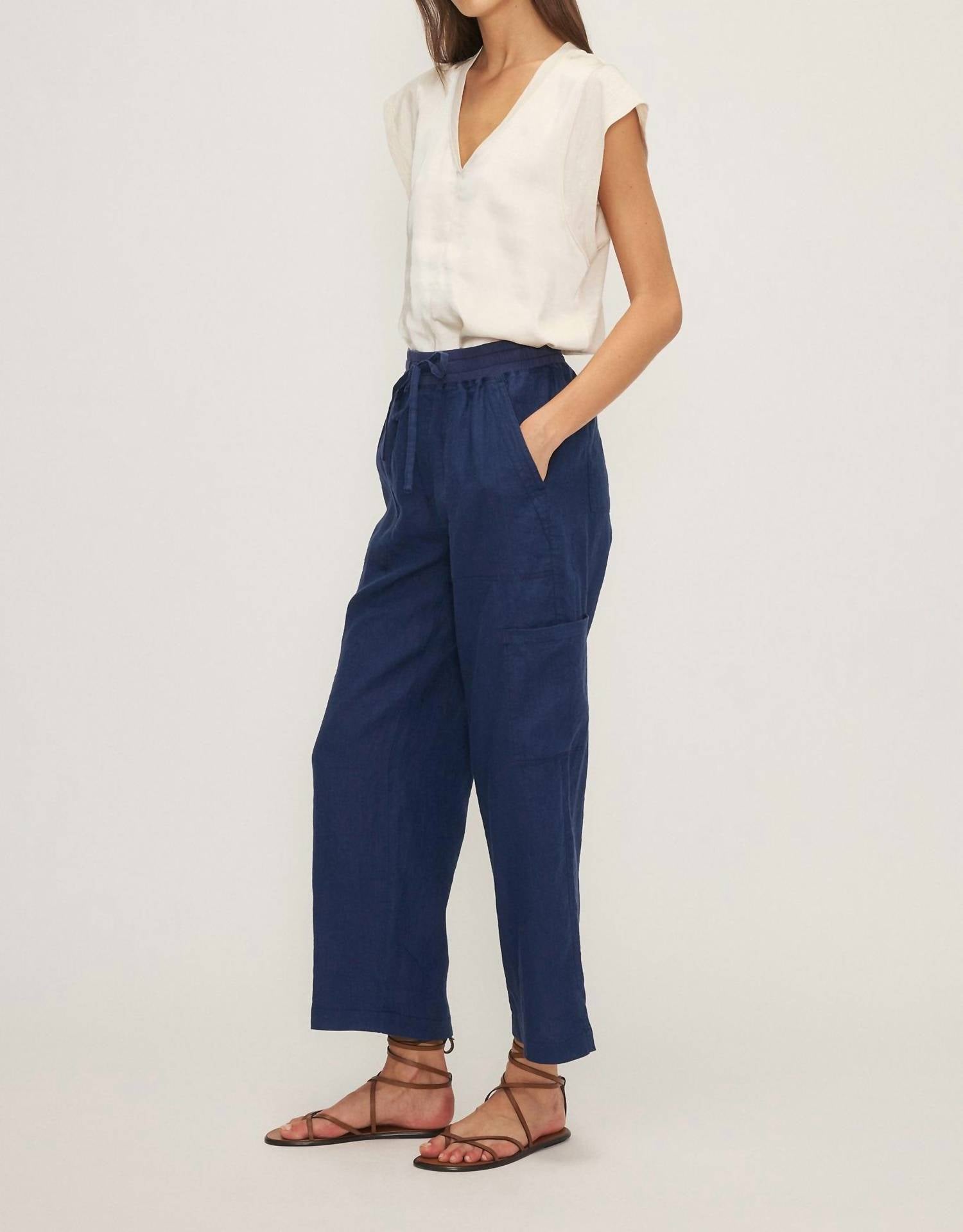 Introducing the James Linen Pants by MELISSA NEPTON in a sophisticated navy hue, perfect for a minimalist summer wardrobe. Crafted from breathable linen, these trousers feature a relaxed fit with a straight leg and convenient pockets. The solid design pairs easily with various tops, while the tie closure adds a touch of comfort and style. Care: Machine wash and lay flat to dry.