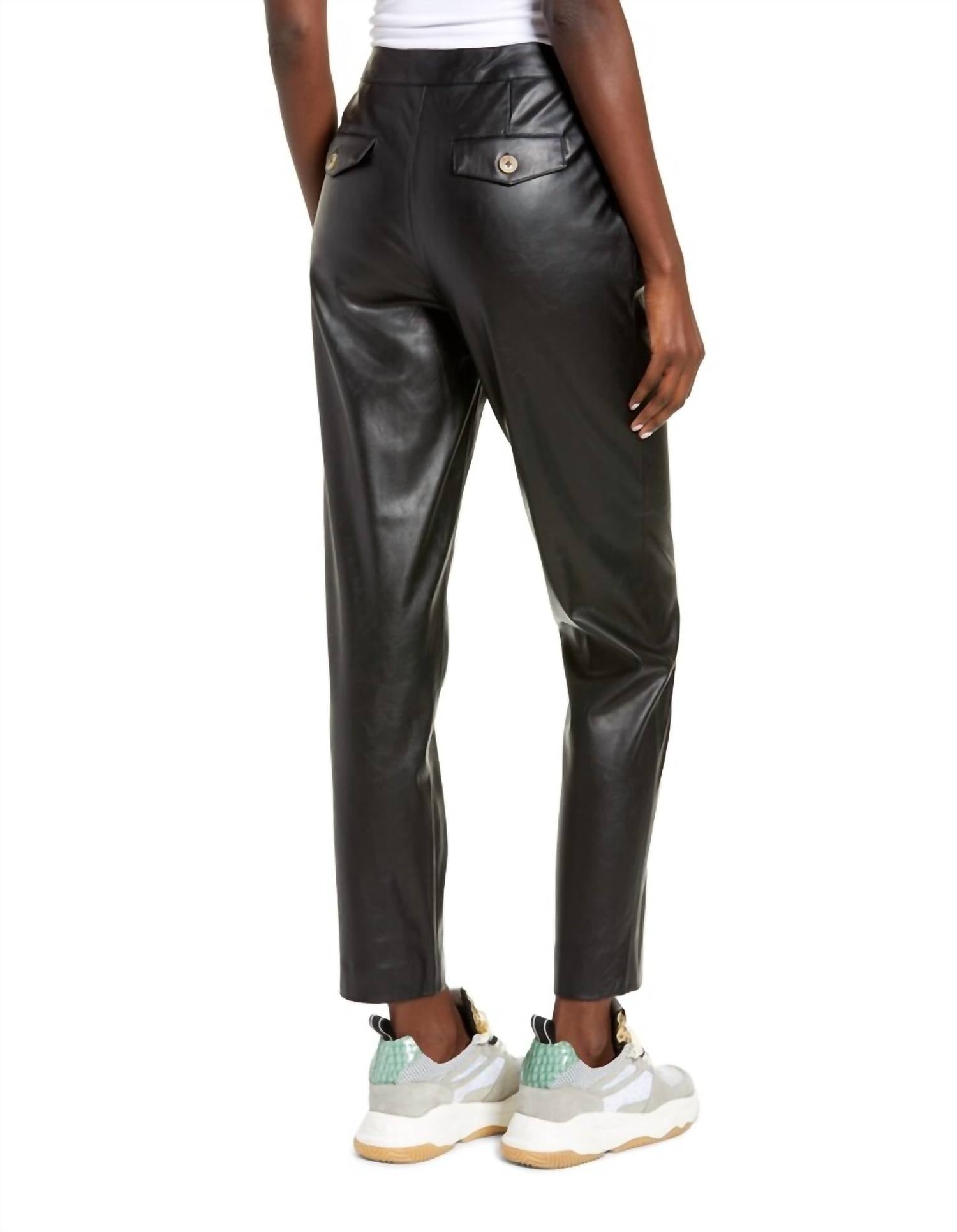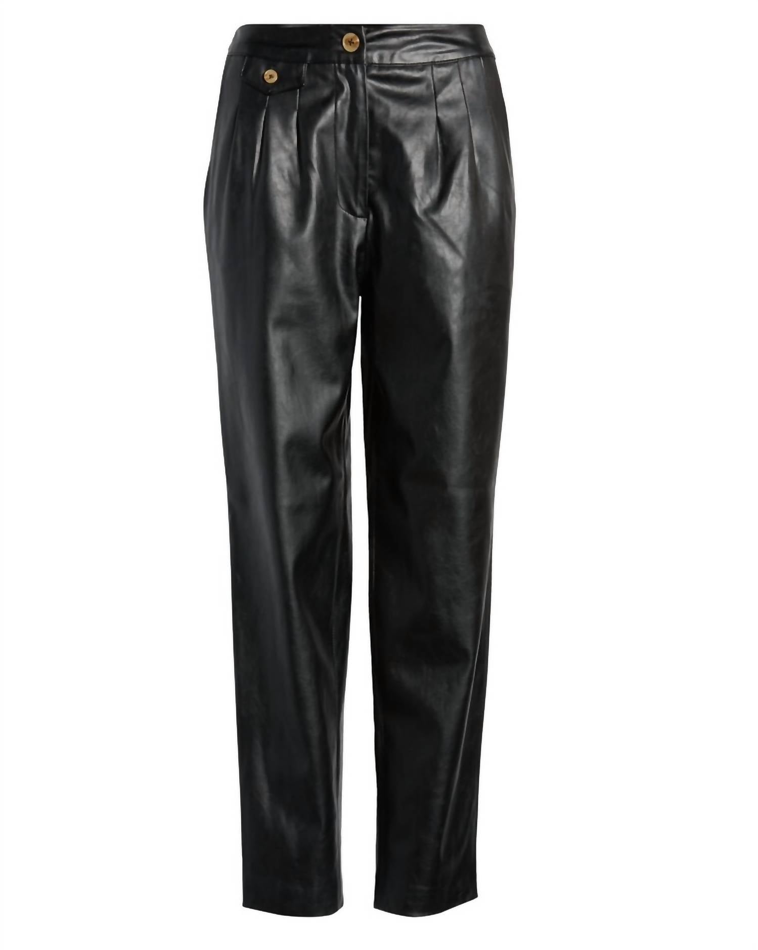 Detailed with traditional trouser elements, crafted from faux leather that mimics the luxurious feel of real leather. They feature a zip fly with button closure and a front button-flap coin pocket for added functionality. The composition is 50% polyurethane and 50% polyester. For care, spot cleaning is recommended. The pants have a 27" inseam, a 12" leg opening, a 13 1/2" front rise, and a 15 1/2" back rise.