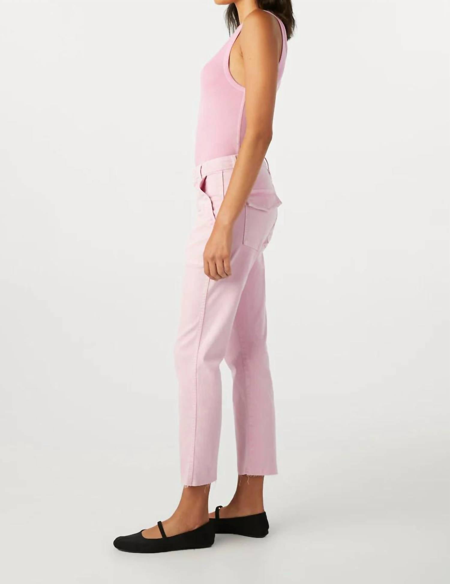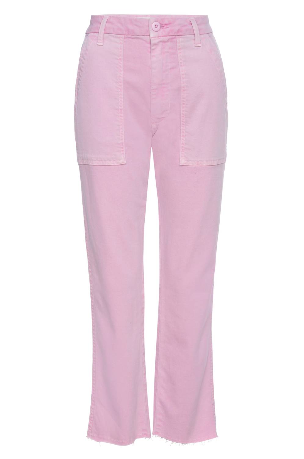Meet the Easy Army Trouser by AMO, a stylish women's pant in a chic Light Peony shade, crafted from a comfortable Cotton Blend. These trousers feature a slightly relaxed, cropped straight leg with an 11.5-inch rise and include practical back and front patch pockets. They are completed with a convenient zip closure, enhancing their utilitarian charm. Care for these trousers is straightforward with machine wash and tumble dry instructions.