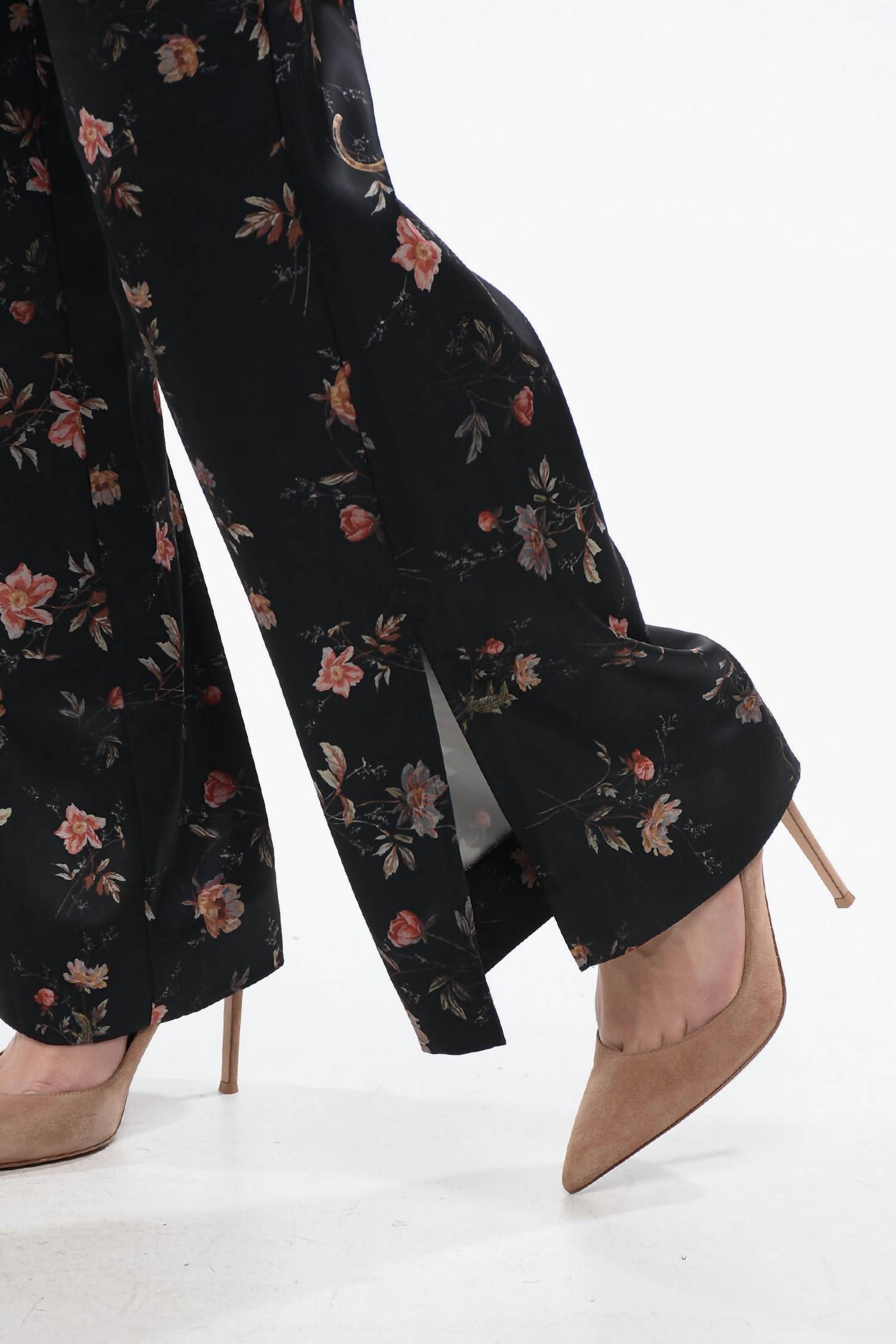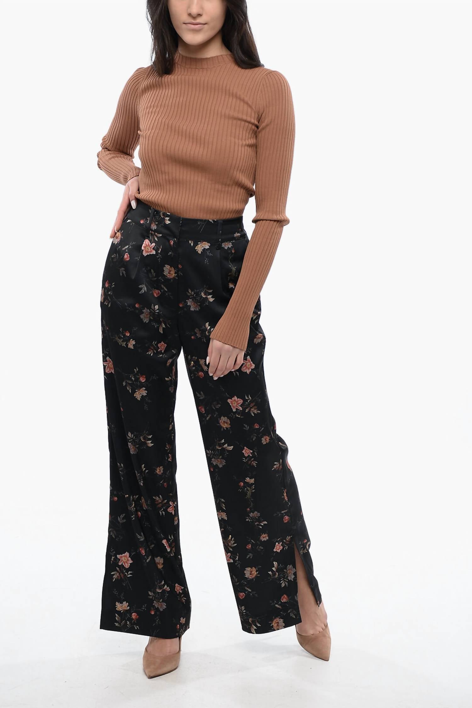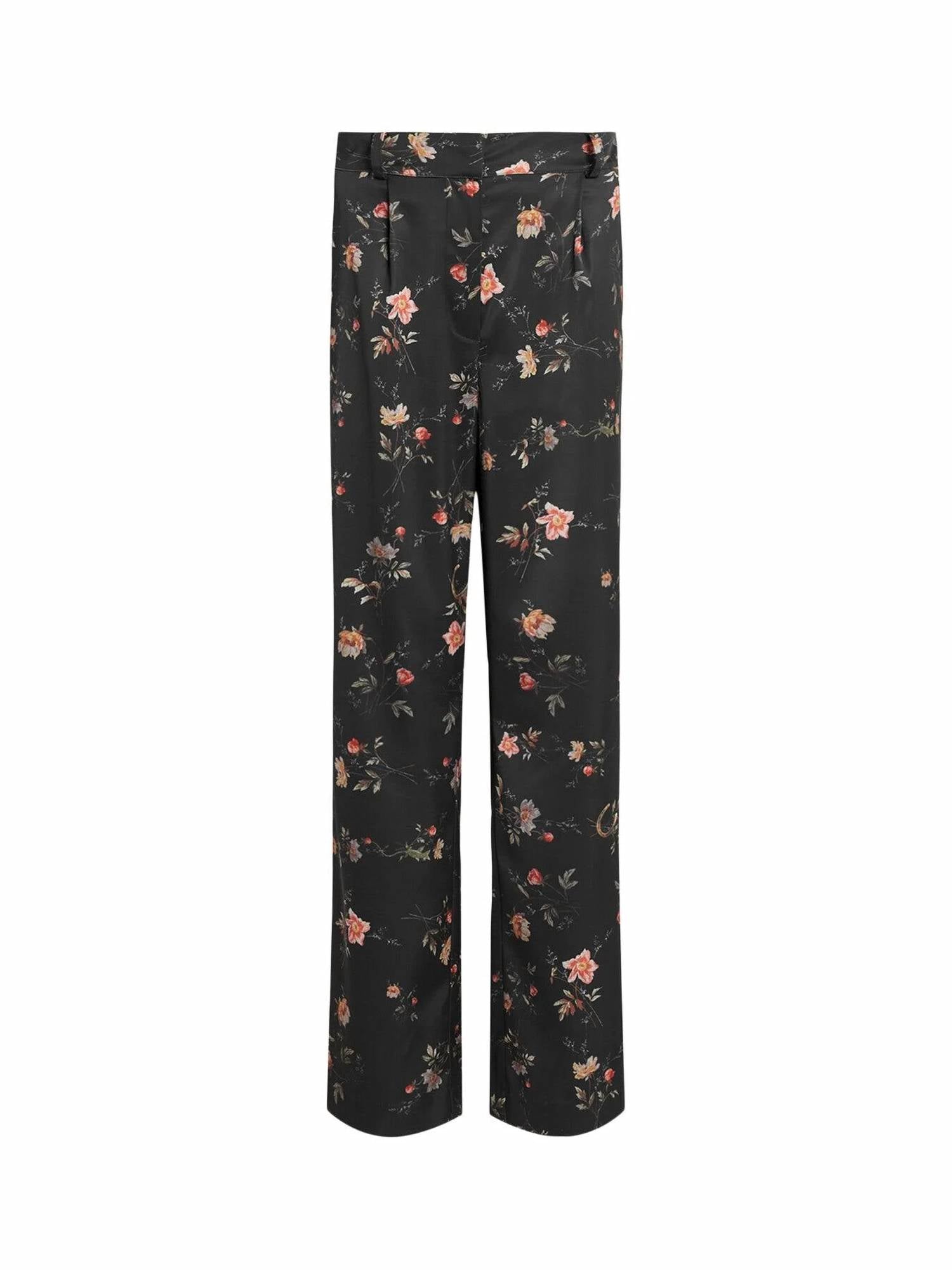 Elevate your evening attire with the Louisa Tana Trousers by AllSaints, featuring a striking black and floral print that embodies Flower Fever Spring-Summer elegance. Crafted from satin with a stretch composition of 96% Polyester and 4% Elastane, these trousers boast a high-rise waistline and pleats for a classic silhouette. The design includes flared legs, four pockets, and multiple closure options such as zip, hook-and-eye, and hidden closures for a flawless finish. Ideal for evening events or workwear, these trousers perfectly merge style with practicality.