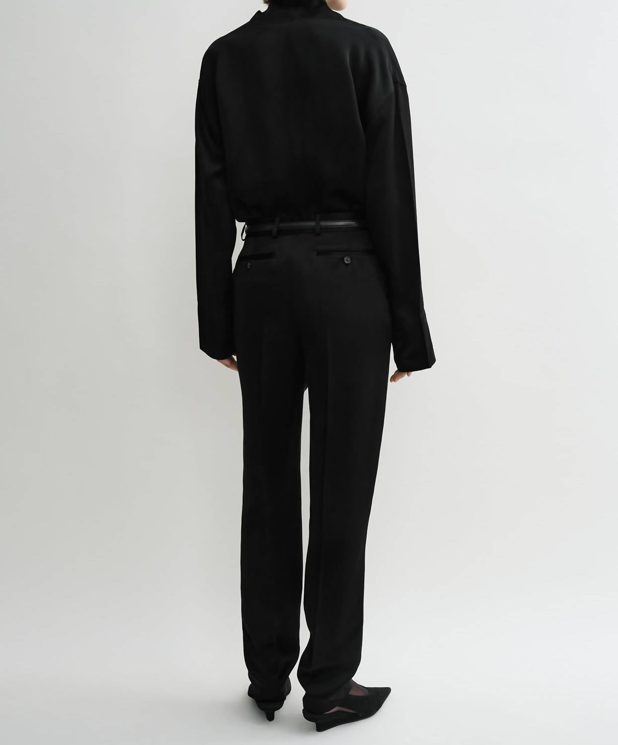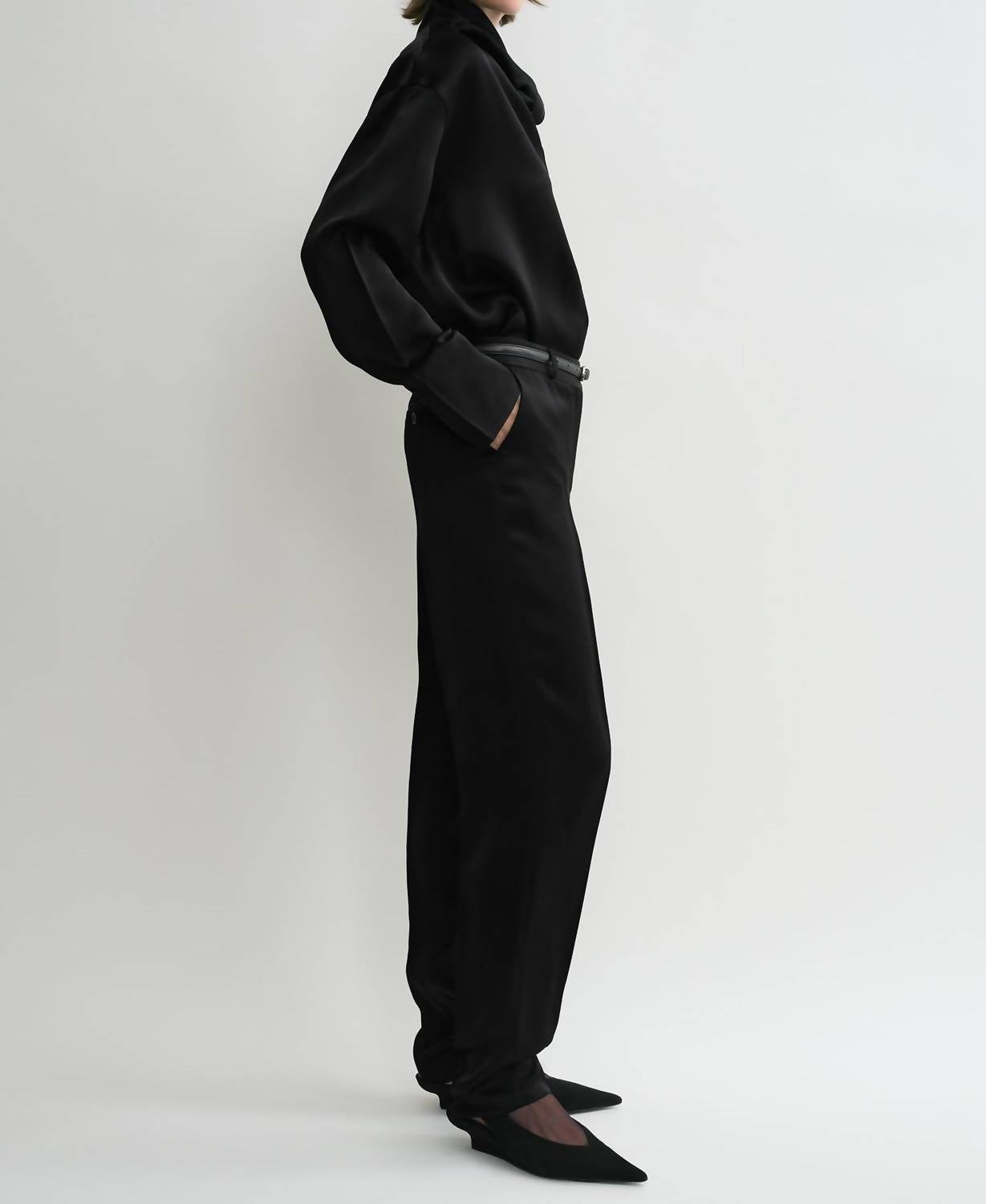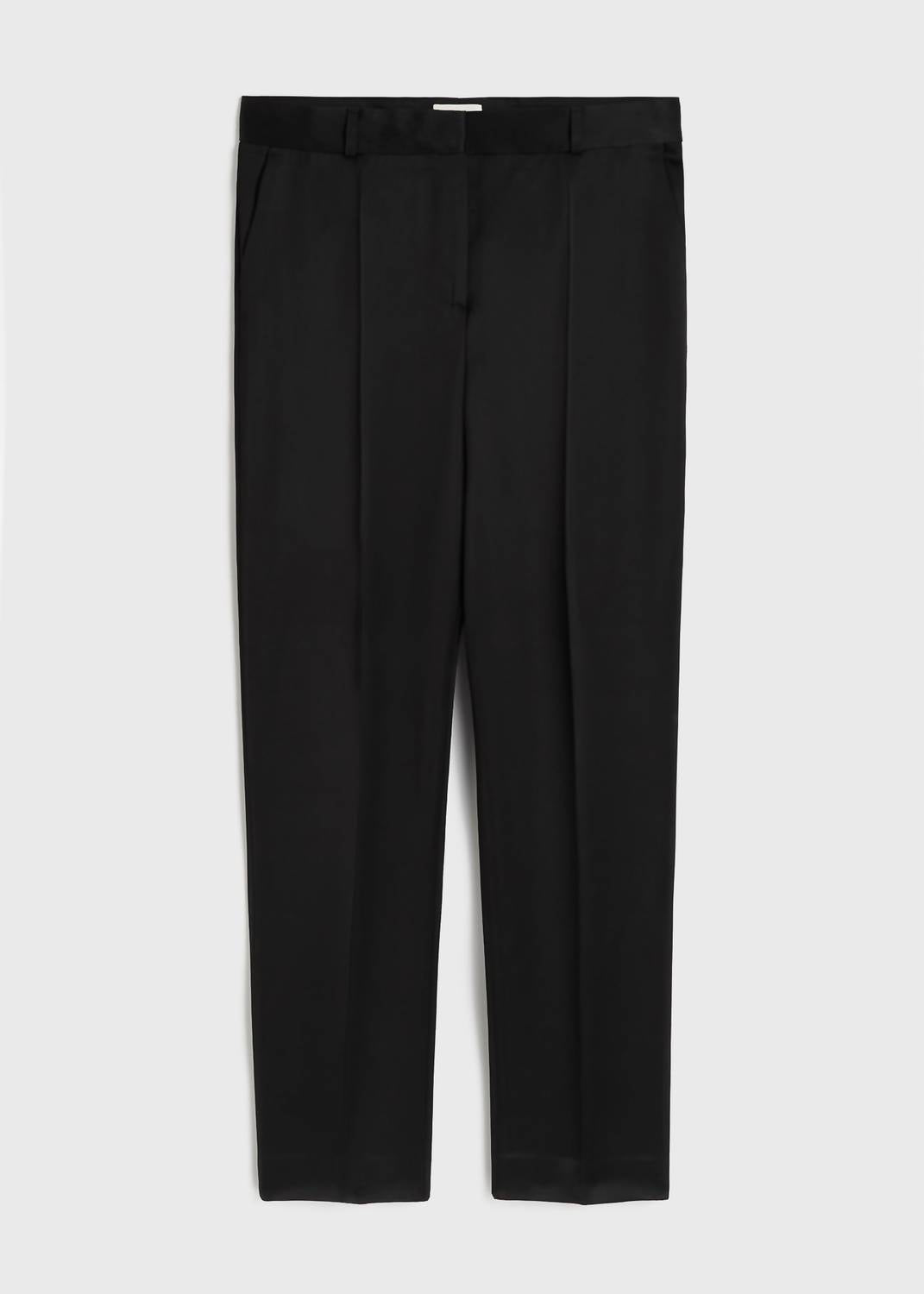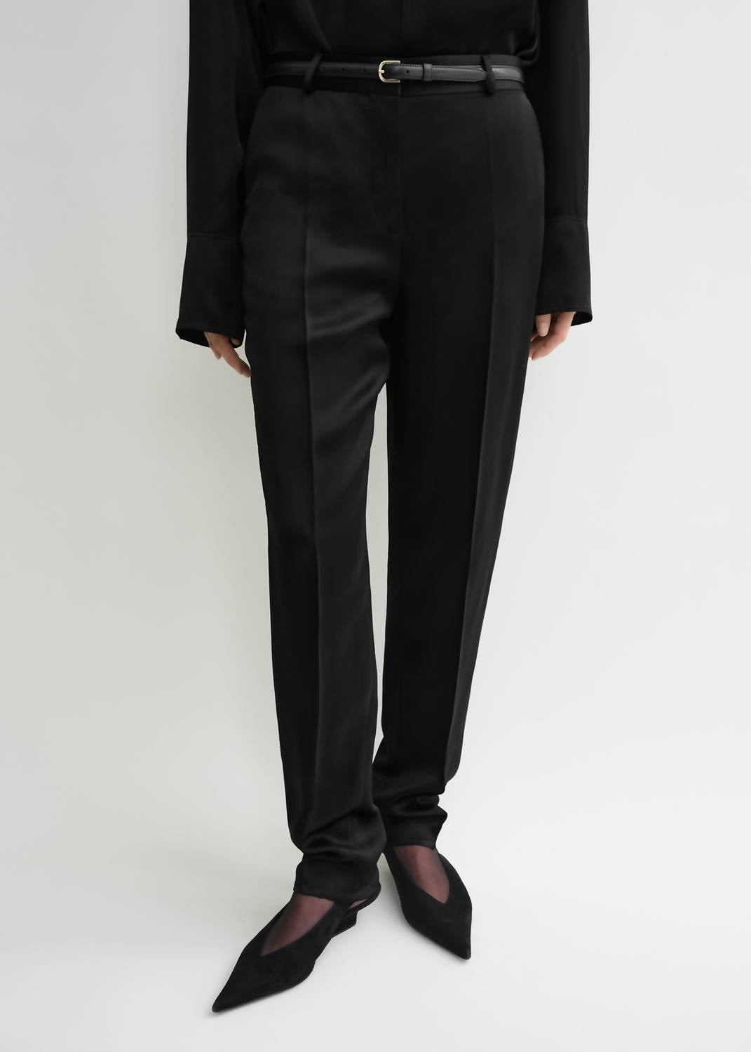 Introducing the Low Waist Satin Trousers by TOTEME, a sophisticated addition to your workwear wardrobe. These trousers are expertly crafted from 100% mid-weight double-weave satin viscose, ensuring comfort and style with a low, hip-hugging waistband and straight, press-creased legs that taper subtly toward the ankles. The design includes practical belt loops, side and back pockets, and a zip closure for convenience. Care instructions recommend a 30°C machine wash.