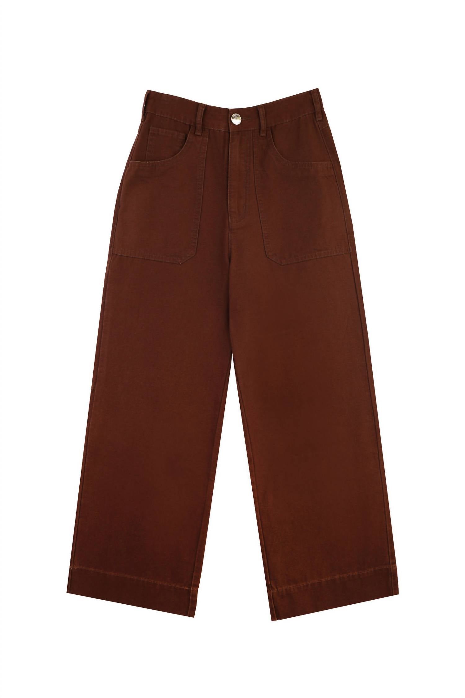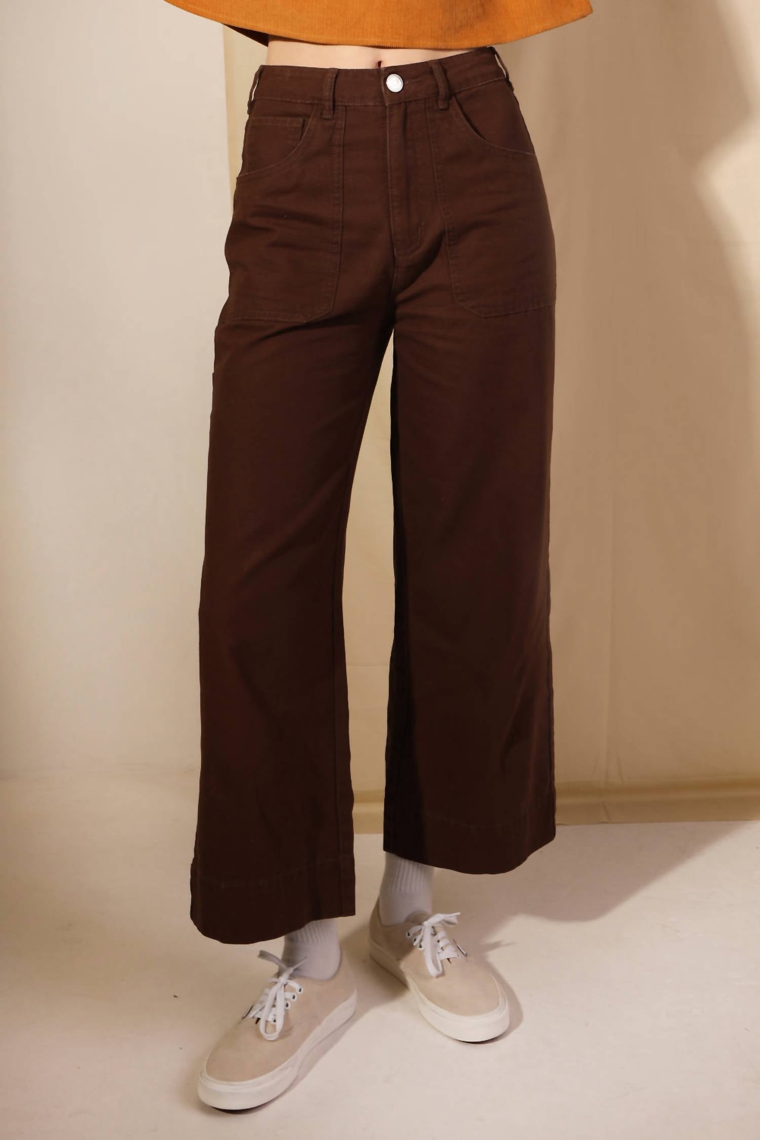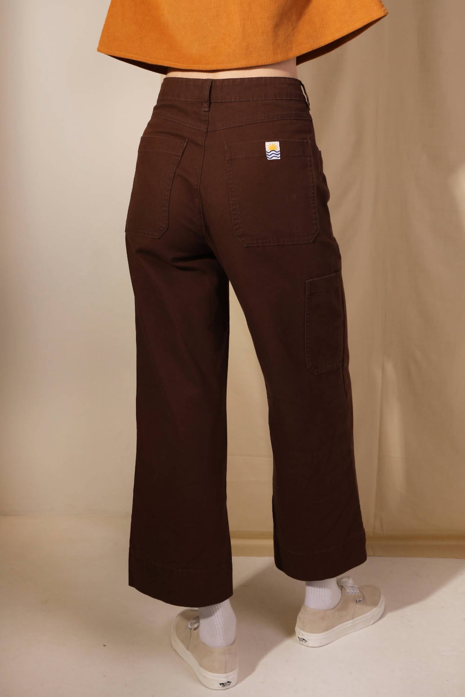 Elevate your casual wardrobe with the Brown Carpenter Trousers by L.F. Markey, designed for a women’s relaxed fit. These high-rise trousers, crafted from 100% cotton, feature a straight leg style with a durable button closure and a functional five-pocket design. Perfect for spring occasions like music festivals, these solid-patterned trousers channel a 90s fashion vibe, making them ideal for pairing with a casual tee or the matching Chore Coat. Care for these trousers by machine washing them in your routine, ensuring they remain a staple in your seasonal wardrobe. Model is wearing a size 4.