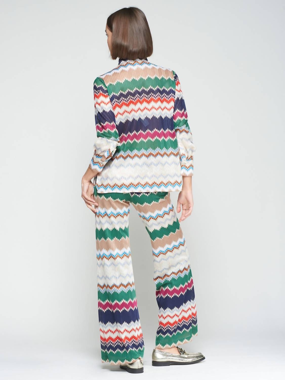 Introducing the Venus Herringbone Lurex Jacquard Trouser by Vilagallo, a standout piece in Verde Rosa crafted for style and sophistication. Featuring a full-length, multicolor zigzag pattern with luxe lurex threads, these trousers boast a high-rise waist and a relaxed fit through the slightly flared, wide leg. Composition: 70% Polyester, 30% Lurex. Closure: Pull-on style. Perfect for your next travel adventure or Thanksgiving gathering, embodying a touch of 90s fashion.