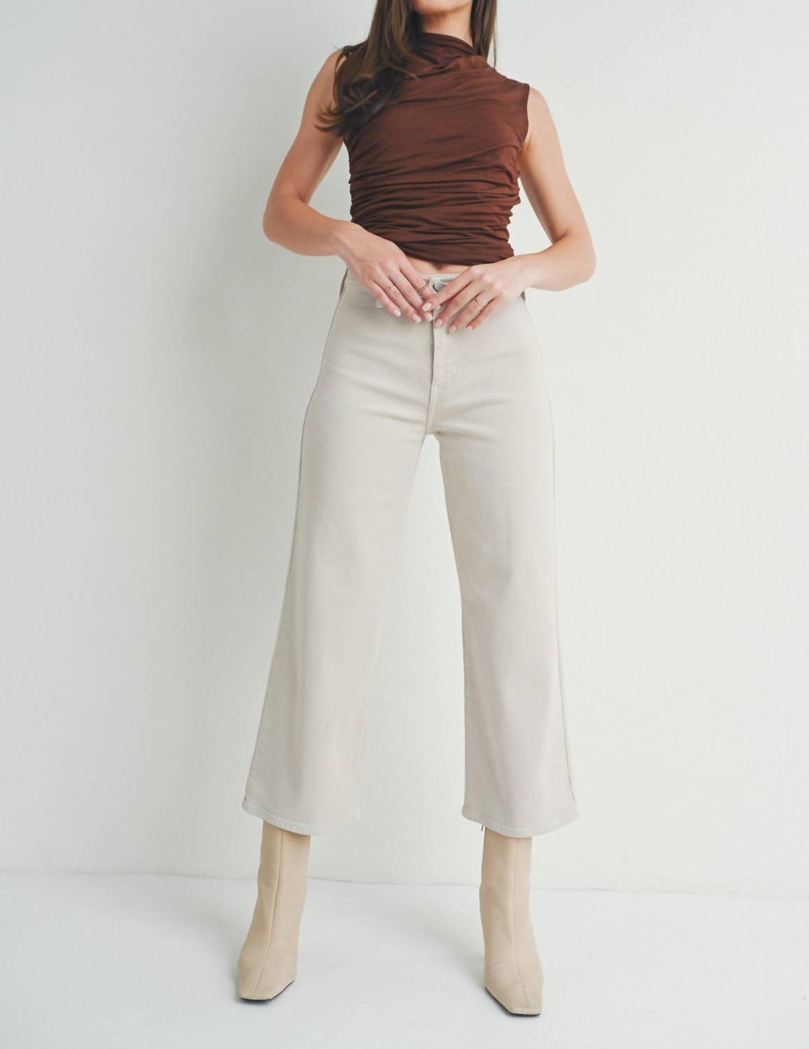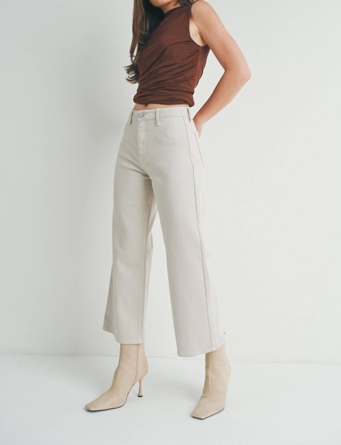 Elevate your wardrobe with the Michaela Wide Leg Denim Trouser from JUST BLACK DENIM, designed in a sophisticated cream hue. These high-rise trousers feature a relaxed fit and wide-leg silhouette, making them perfect for a holiday party or any stylish occasion. Crafted from a comfortable 98% Cotton, 2% Spandex, they come with a button closure and back pockets, offering both style and utility. With an 11" rise and a 27" inseam, these USA-made trousers require machine washing and should be laid flat to dry.