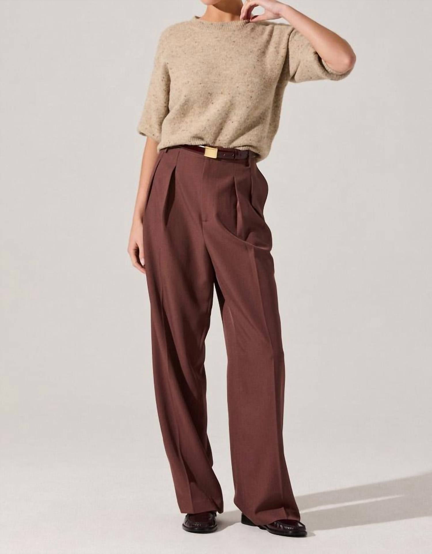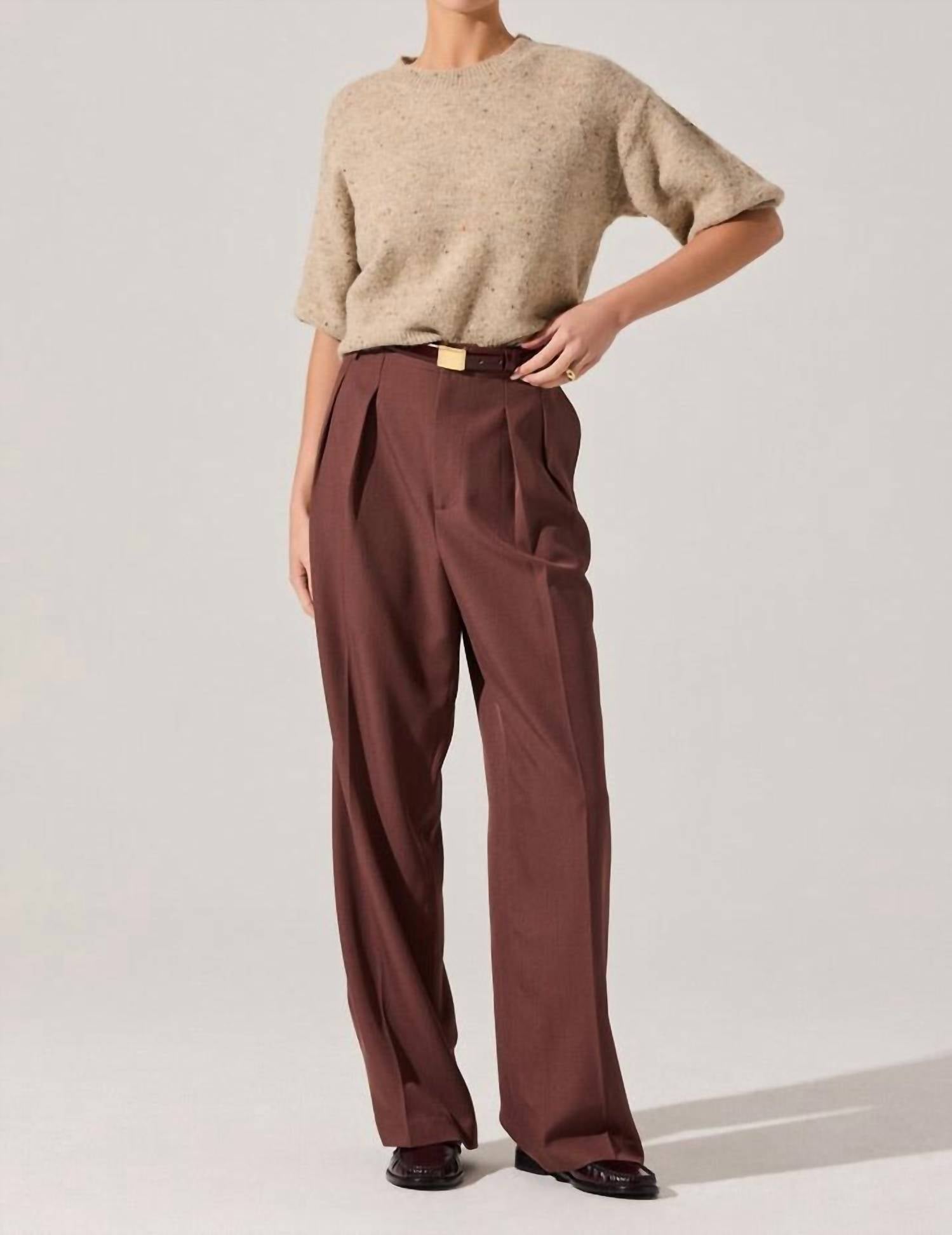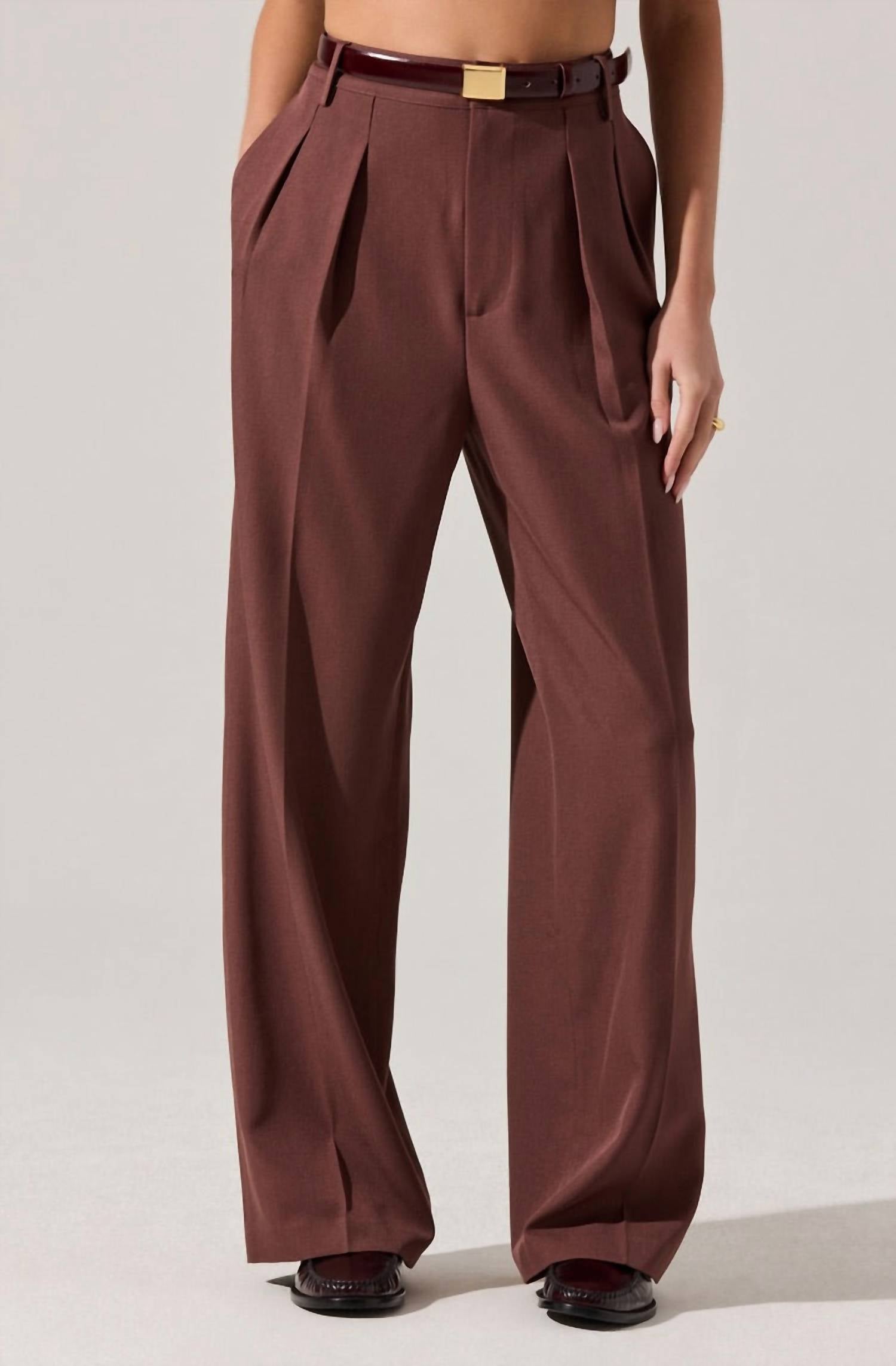 Meet the Faria Straight Leg Pant by ASTR, your ideal choice for business casual attire, now in a rich Plum Brown. These pants feature a high rise and regular fit, with functional belt loops and pockets to enhance practicality. The tailored design is composed of 96% Polyester and 4% Elastane with a zip closure, perfect for pairing with lightweight sweaters and delicate tops. To maintain its refined structure, machine wash and line dry are recommended.