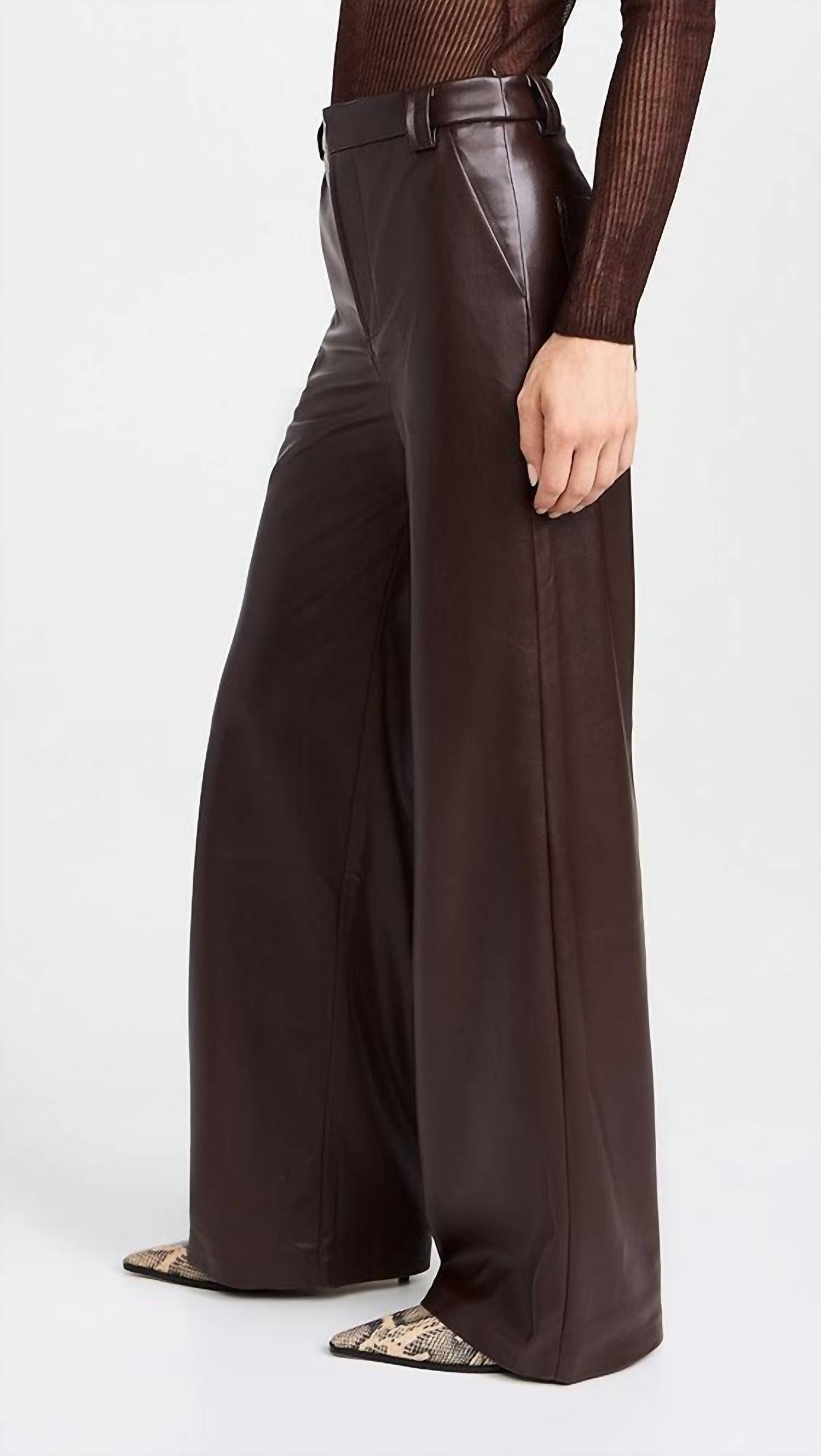 Elevate your fall wardrobe with the Women's The Mia Vegan Leather Trouser by Joe's Jeans in a chic Coffee Bean hue. These high-rise trousers feature a trendy wide-leg silhouette and are crafted from 100% vegan leather with polyester backing, ensuring a butter-soft feel. Designed with clean trouser detailing and pockets, they offer both style and functionality. For care, hand wash inside out, spot clean when needed, and dry flat to maintain fabric quality.