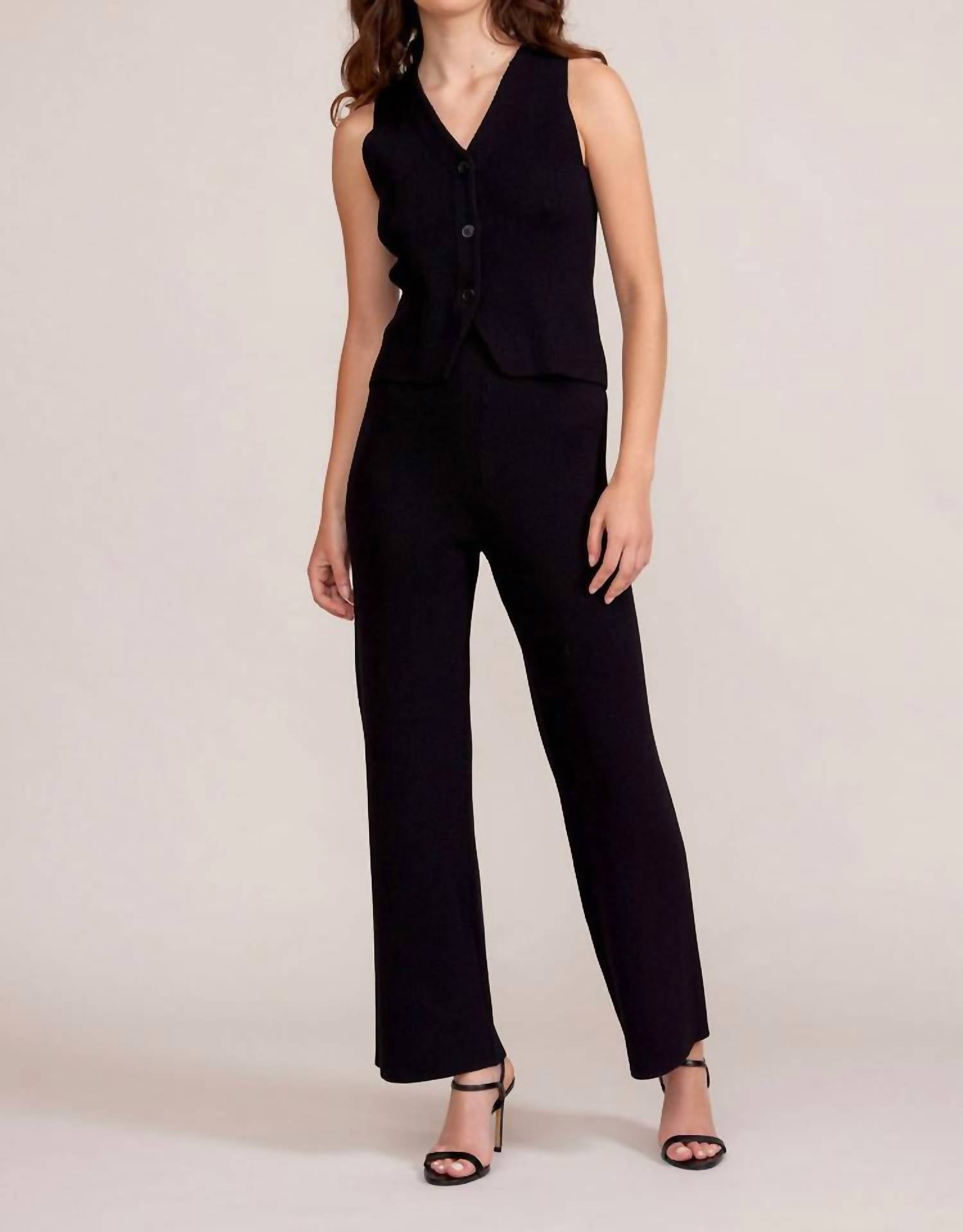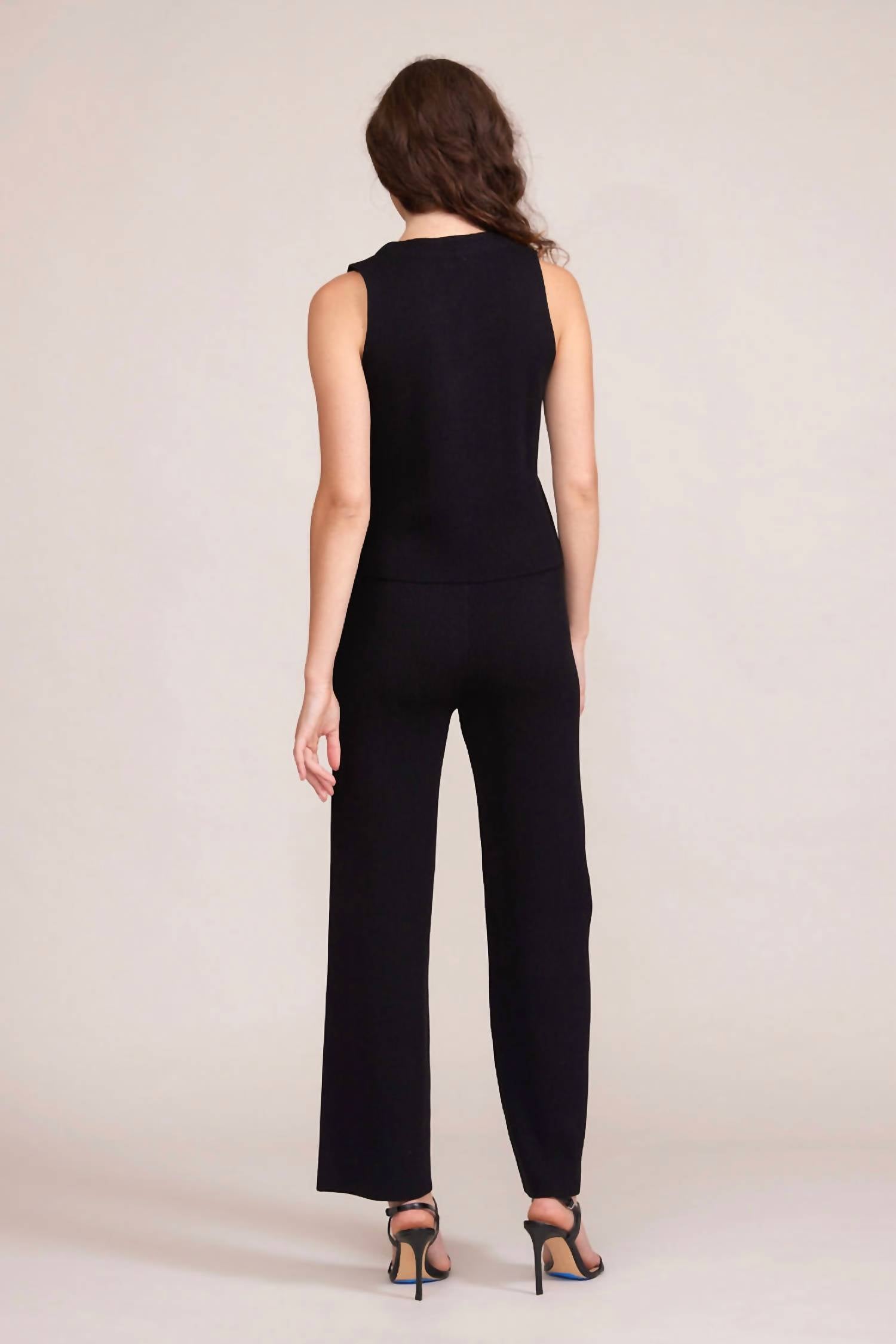 Elevate your comfort with the Grayson Knit Pant by LUCY PARIS, an ideal choice when you want the coziness of sweatpants with a polished look. Featuring a straight leg and pull-on closure, this black trouser is crafted from 71% Rayon, 17% Polyester, and 12% Nylon, offering a minimalist style perfect for the fall season. These solid, pocketless pants are tailored for a back-to-school occasion or even a thoughtful Mother's Day gift. Care: Hand wash for long-lasting wear. Model is wearing a size small.