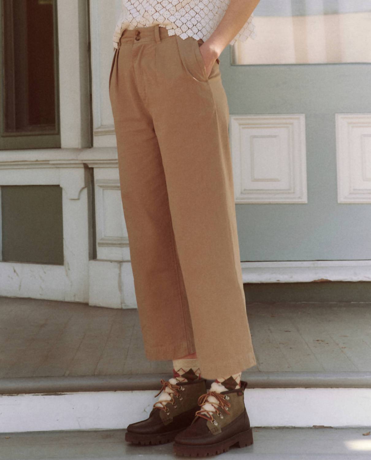100% Cotton. These tailored trousers feature a timeless cut and nod to vintage menswear details like its double waist pleats, welt pockets with curved flaps, and button fly. Mid-rise and straight-leg design. Machine Wash Cold. Imported. Model is 5’10” wearing size 26.