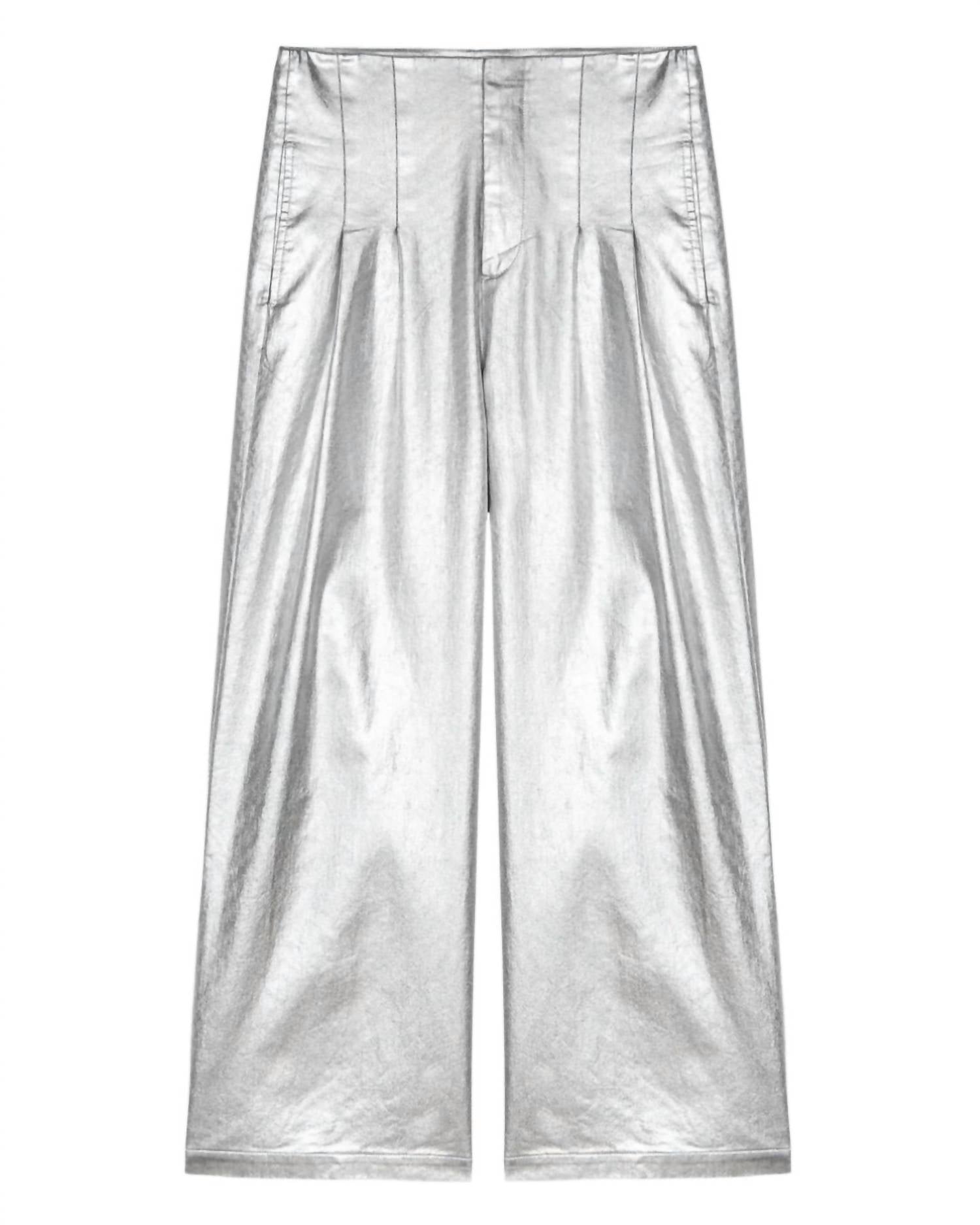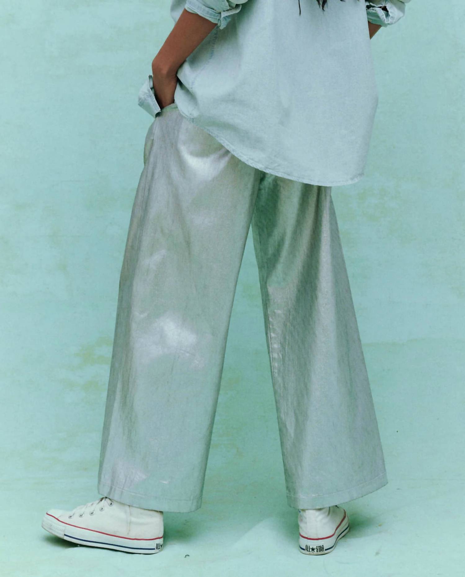 Introducing the Sculpted Trouser by THE GREAT., a statement piece in metallic silver perfect for elevating your fall wardrobe. These trousers feature a comfortable mid-rise and a relaxed fit with wide-leg styling, finished with a chic zip closure. Crafted from 100% cotton, they strike a balance between a luxurious exterior and a soft interior, complete with side seam pockets for practicality. Care for these imported trousers by machine washing in cold water and tumble drying on low.