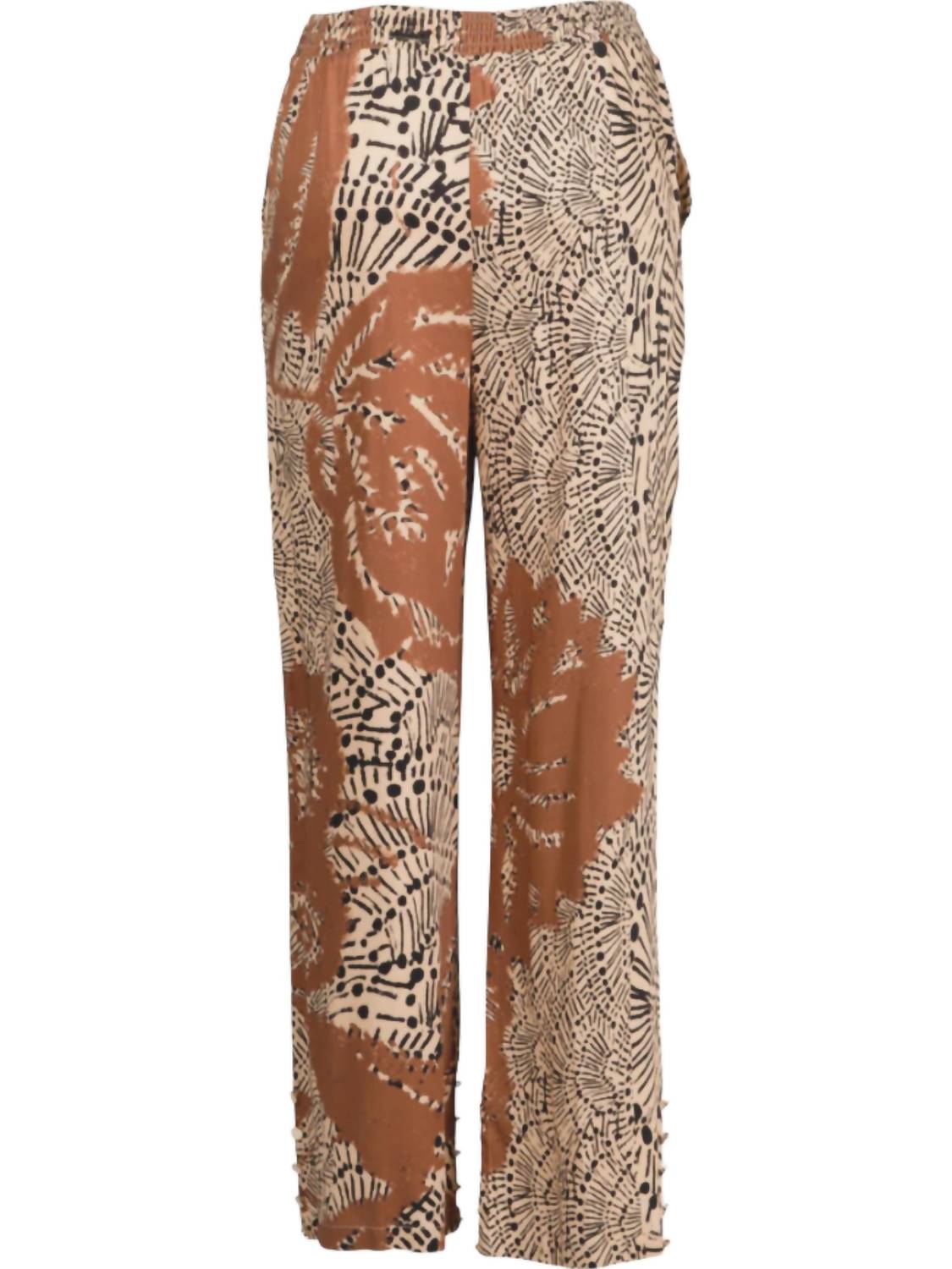 Delicate apricot hue. Crafted from soft, breathable viscose. Patterned pants seamlessly blend comfort with style. Designed with a high waist rise. Flattering fit that accentuates your silhouette. Straight leg cut. Open for a wide-leg look or button them up for a more edgy appeal to the pants. Subtle yet eye-catching pattern. Practical pockets and a pull-on closure. As functional as they are fashionable.
