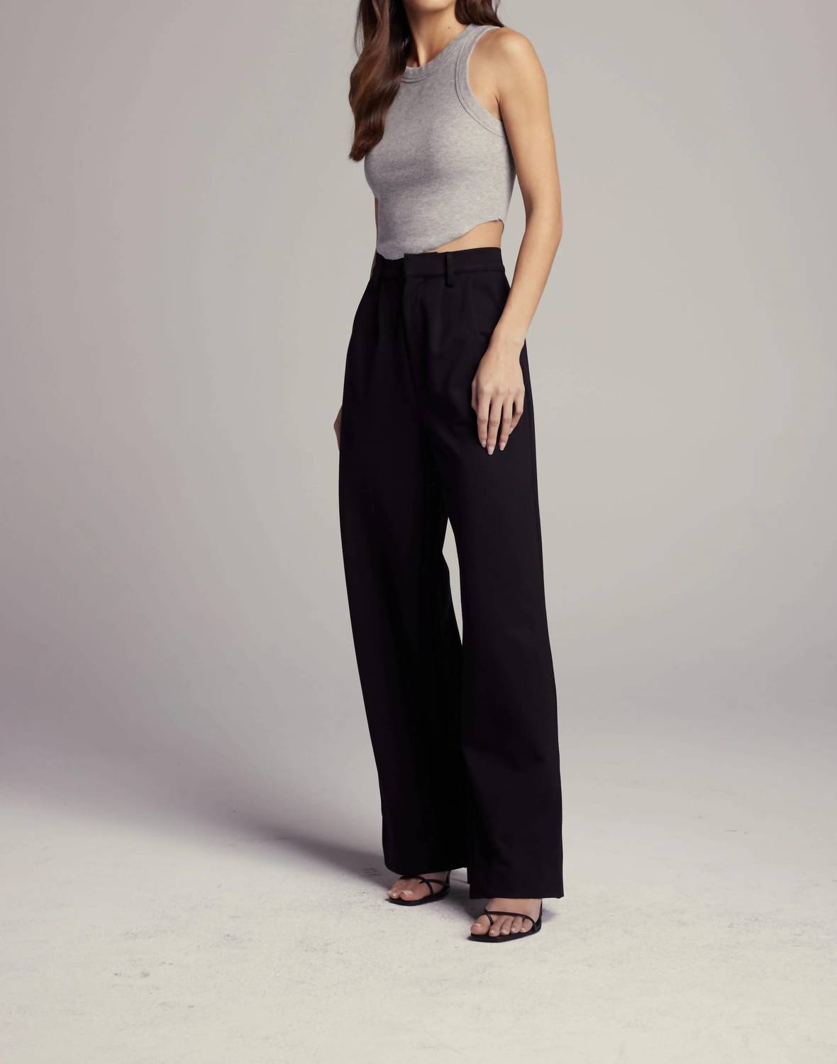 Elevate your wardrobe with the Gentry Wide Leg Trousers by Sundays, crafted in a solid Black Polyester blend featuring 90% polyester and 10% spandex for a relaxed fit. These high-rise trousers showcase a wide leg and straight leg style with pleats around the waistband, belt loops, and a convenient hook and eye closure. They are designed to infuse a sophisticated flair into any outfit, whether for a New Year's Eve celebration or a casual spring dinner party. Easy care instructions allow for a machine wash cold and tumble dry low.