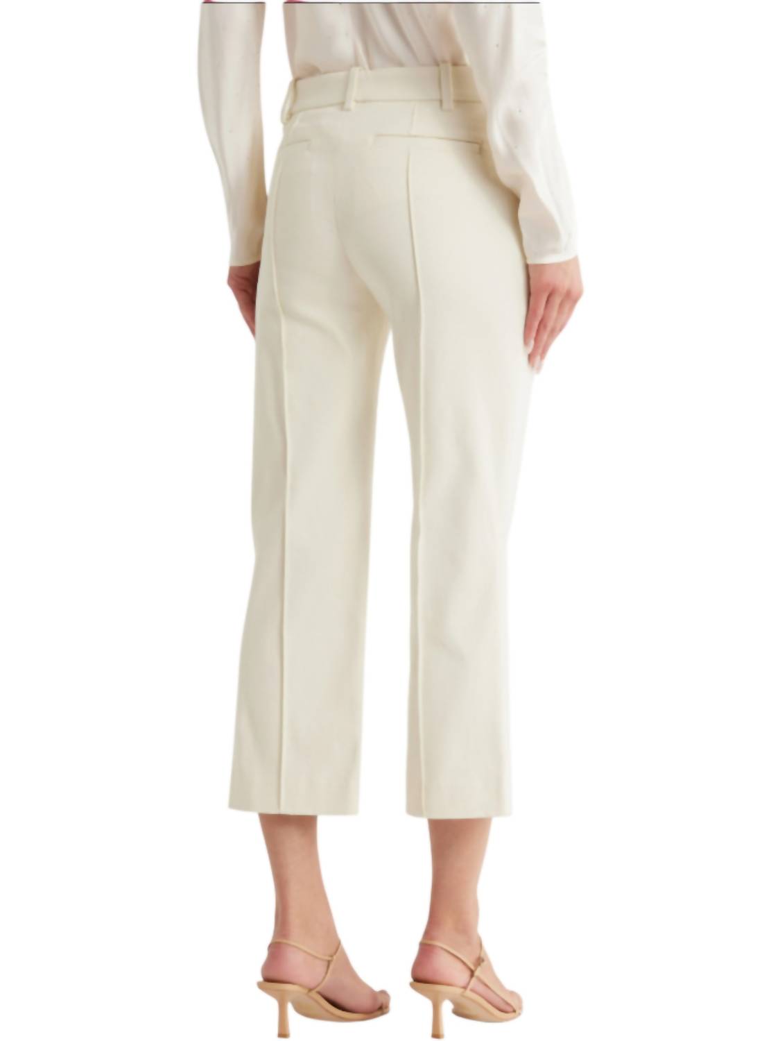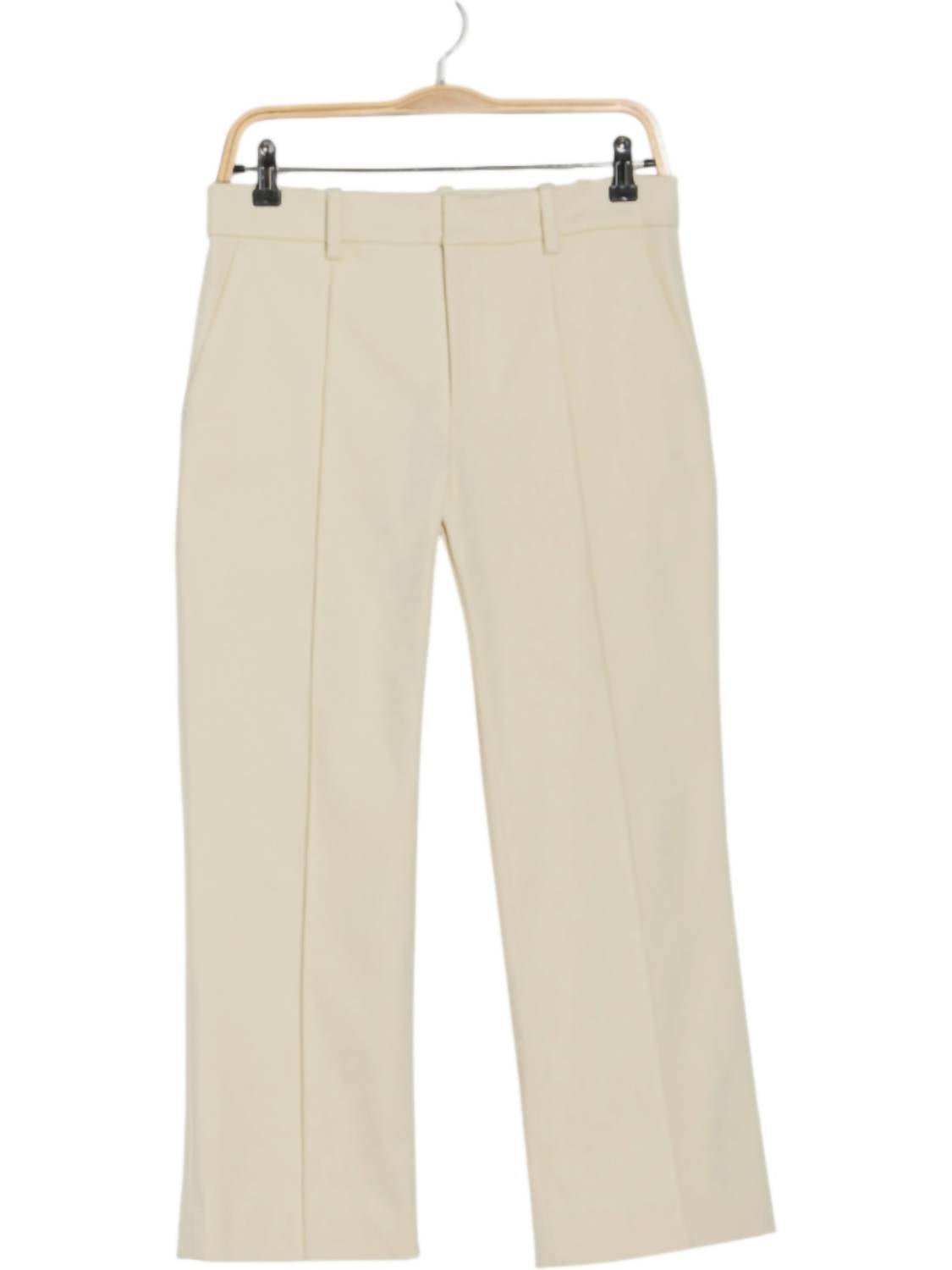 Crafted in a solid bone hue perfect for the modern woman's work-to-weekend transition. High-rise trousers feature a polished pintucked front with a sophisticated zip fly and hook-and-eye closure. With a composition of 98% cotton and 2% elastane. Offer comfort without compromising on style. Front slant pockets add practicality. Dry clean care ensures longevity.