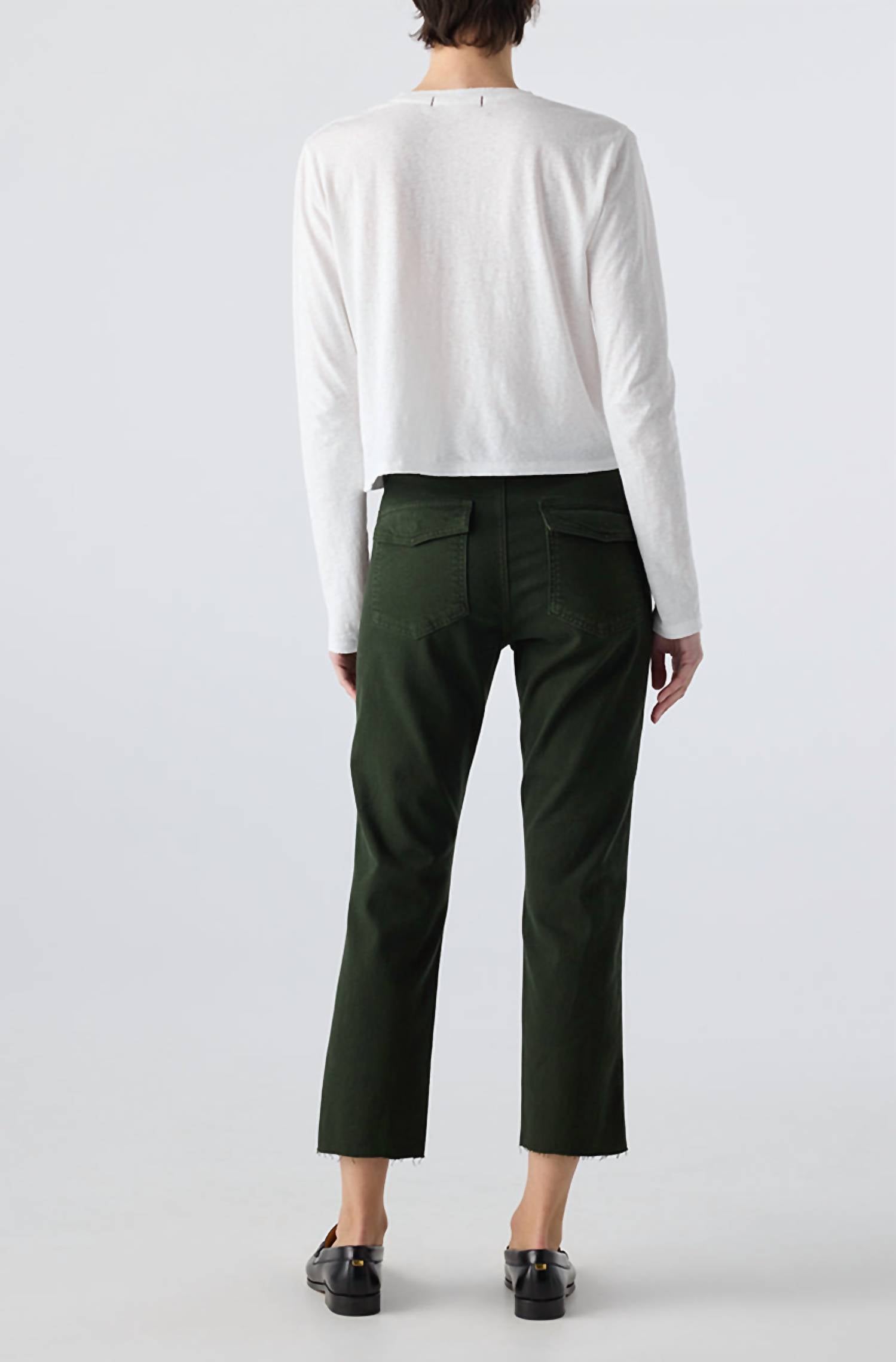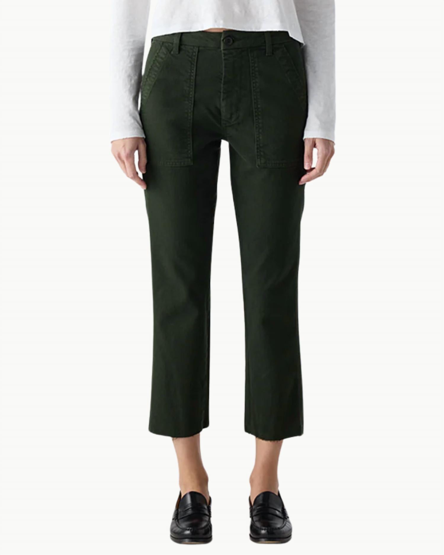 Discover the Easy Army Trouser by AMO, a contemporary take on classic army pants in a stylish Mosswood hue. These women's trousers boast a comfortable regular fit with a slightly dropped crotch, high rise, and cropped straight leg for a relaxed, modern silhouette. Crafted from a cotton blend of 70% Cotton, 29% Lyocell, and 1% Lycra, they feature utilitarian front and back patch pockets for added edge, and a zip closure with a raw hem for a vintage touch. Perfect for travel, these pants offer a 25 1/2" inseam with an 11 1/2" front rise, 15 1/2" back rise, and 14 3/4" leg opening.