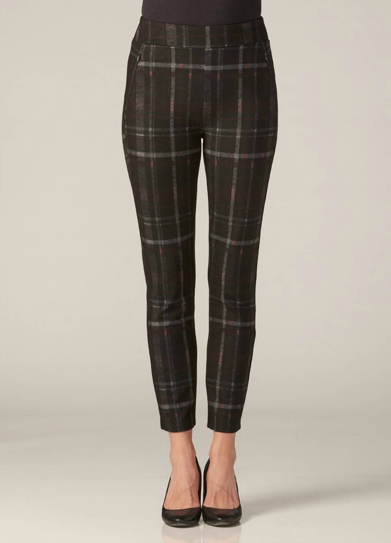 Introducing the Brit Slim Fit Pants by Charlie Paige, a stylish blend of comfort and sophistication in a striking Black and Red Plaid. These high-rise skinny trousers feature a slimming flat front silhouette with innovative seaming, enhanced by two front zipper pockets for practicality. Crafted from 61% Polyester, 35% Rayon, and 4% Spandex, the pull-on closure ensures ease and comfort. Machine wash gently and lay flat to dry.