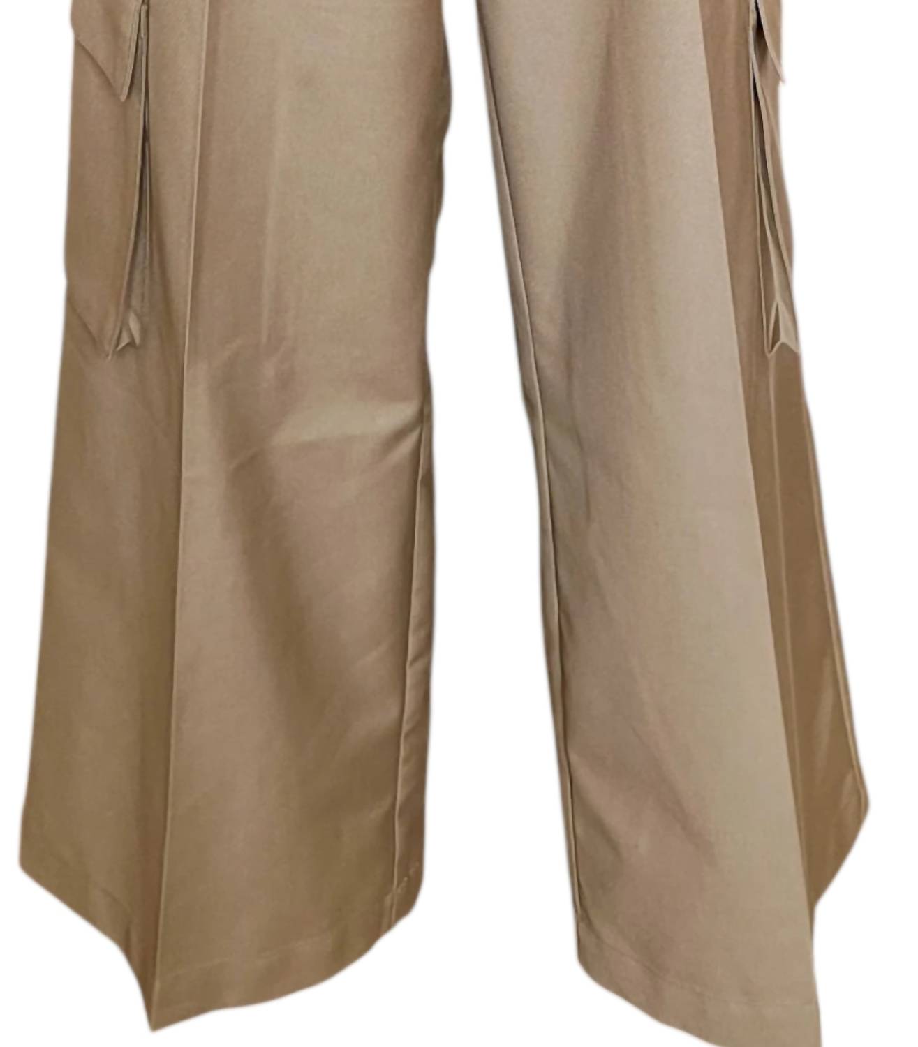 Elevate your wardrobe with the Gwen Cargo Trousers by CRESCENT, crafted from a durable blend of 65% polyester, 30% rayon, and 5% spandex. These relaxed-fit, beige trousers feature a stylish wide leg and a practical mid-rise waist, perfect for a range of occasions, from thanksgiving dinners to dinner parties. Designed with convenient mid-leg flap pockets on both sides, they close with a front button and hidden zipper, complemented by button-secured belt loops for added functionality. Please refer to the attached sizing chart as these trousers are true to size.