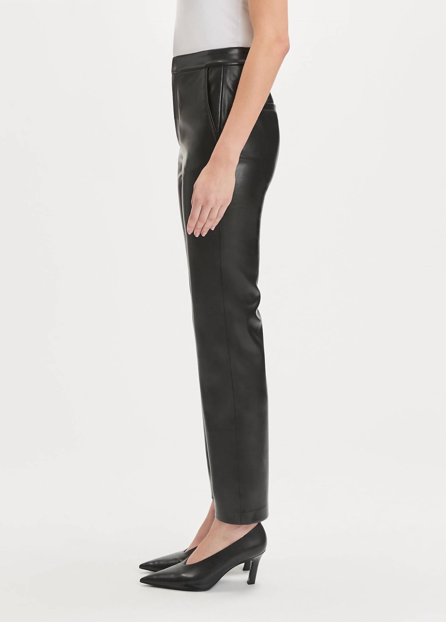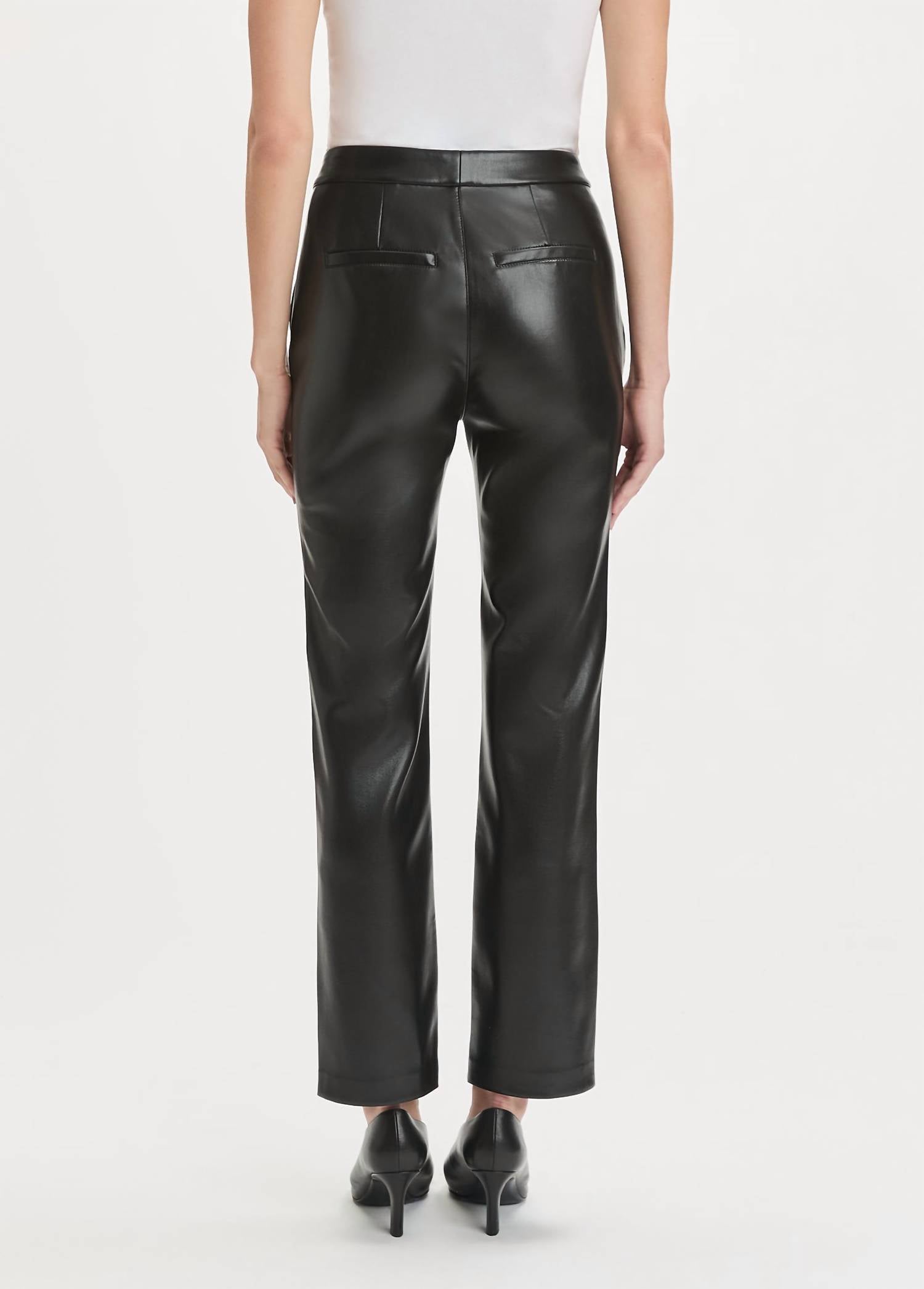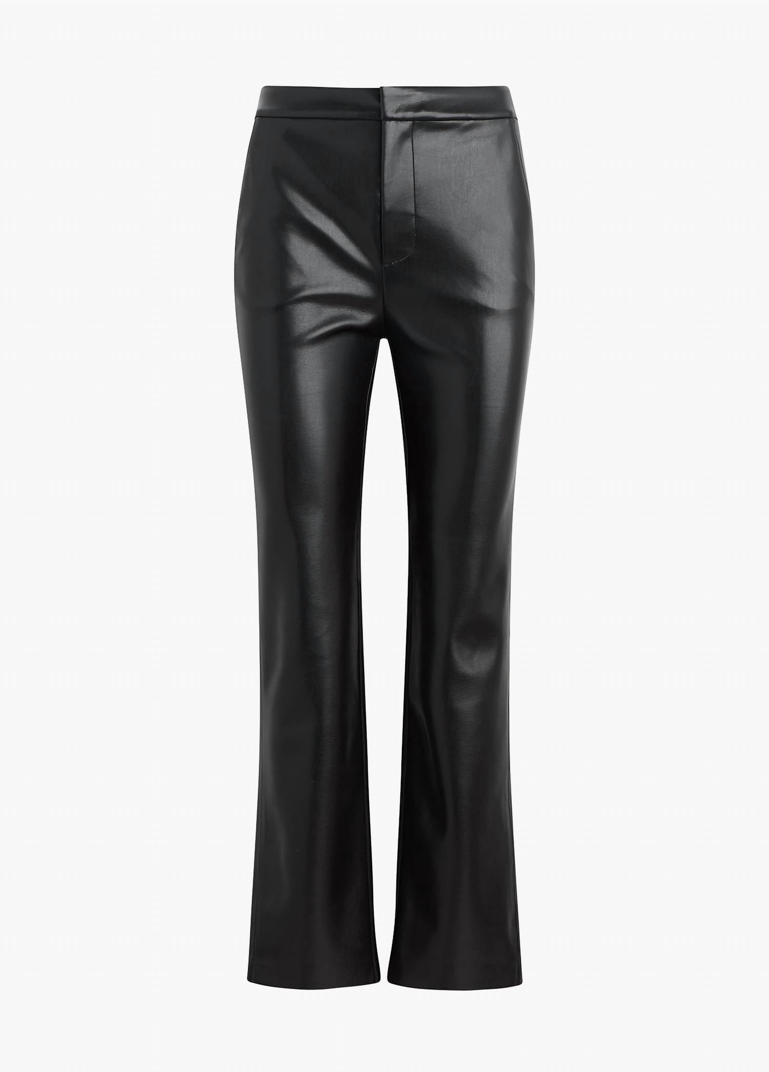 Elevate your wardrobe with the Carla Mid Rise Trouser by Favorite Daughter, designed in a chic Raven hue. Crafted from glossy 100% Polyurethane, these vegan leather trousers offer a slim-fit silhouette with a flared leg. Featuring a flattering 10.5" mid-rise and 29" inseam, they include slant front pockets, back welt pockets, and a minimalist waistband. Closure: Hook and eye closure. Care: Dry clean only. Perfect for a workwear to travel transition.