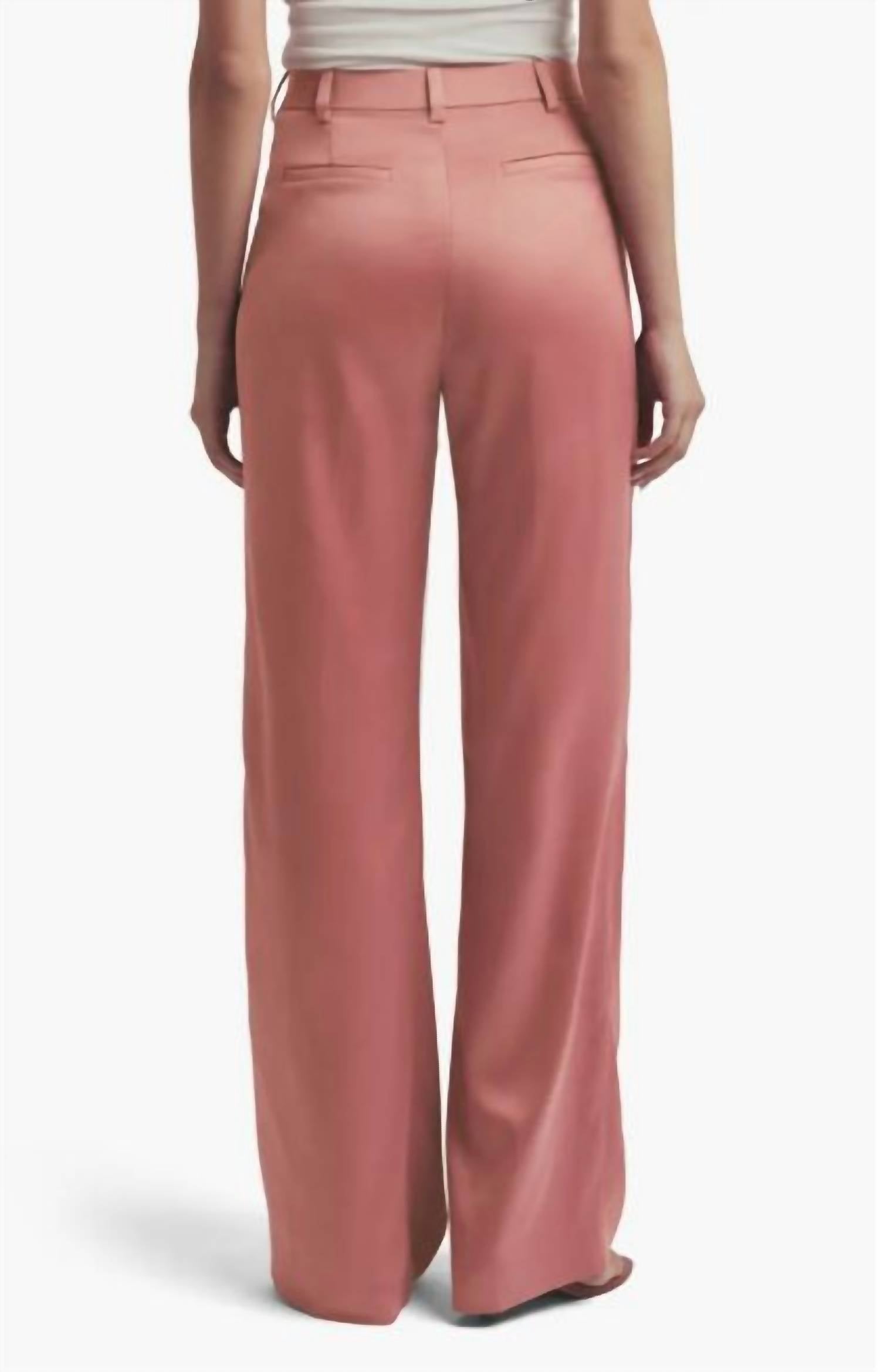 Slinky satin and a pleated waist add a luxe drape to wide-legged pants rendered in a subtle dusty rose shade. There is a front zip fly with hook-and-bar closure, front slant pockets, and back welt pockets.