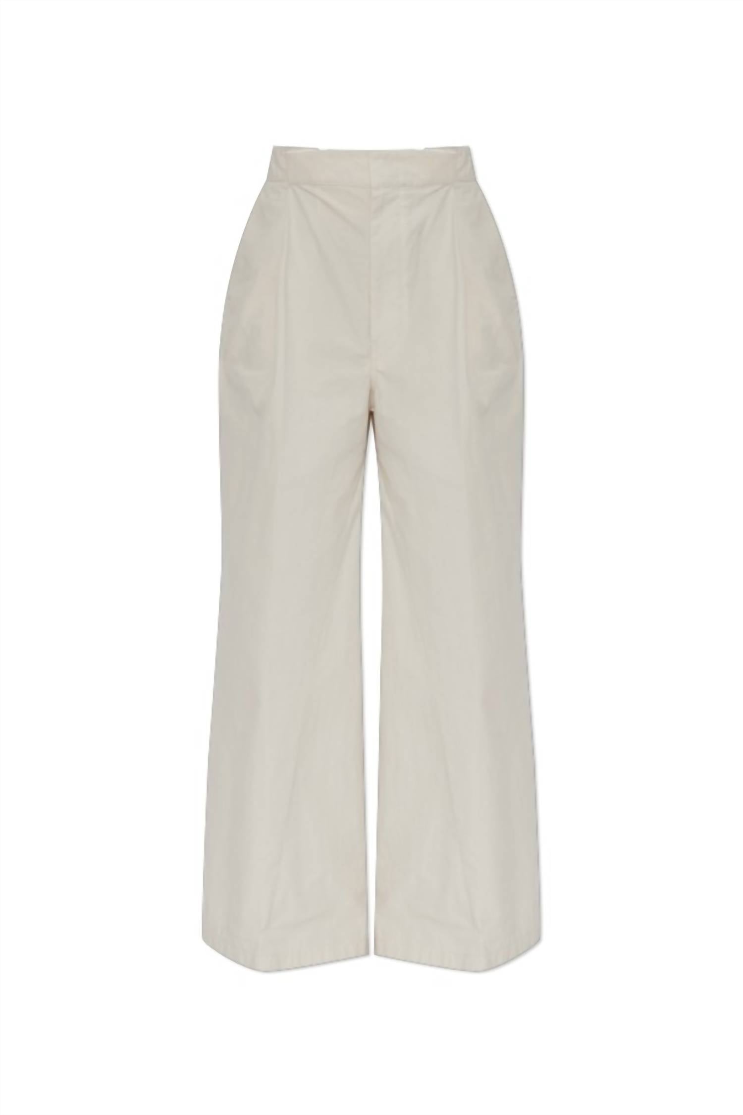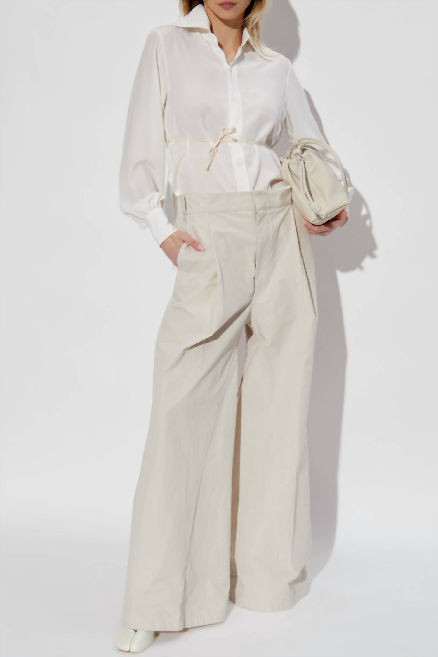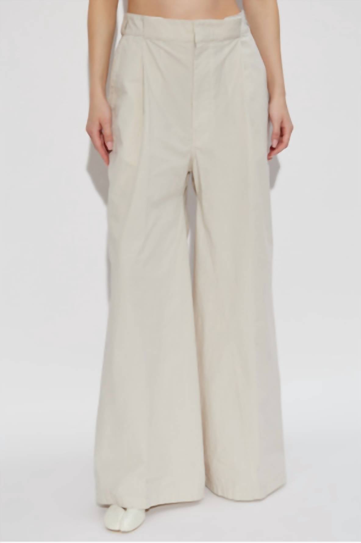 Sophisticated addition to any wardrobe with their elegant stone hue. Crafted from a premium blend of cotton and polyamide. Promise both comfort and lasting wear. High-rise, wide-leg design features front pleats, rear darts, and belt loops, complemented by practical side pockets and a hook and eye closure for seamless styling. Ideal for a dinner party or workwear, offer a chic and universal appeal suitable for the fall season.