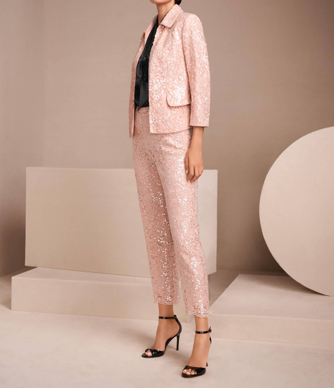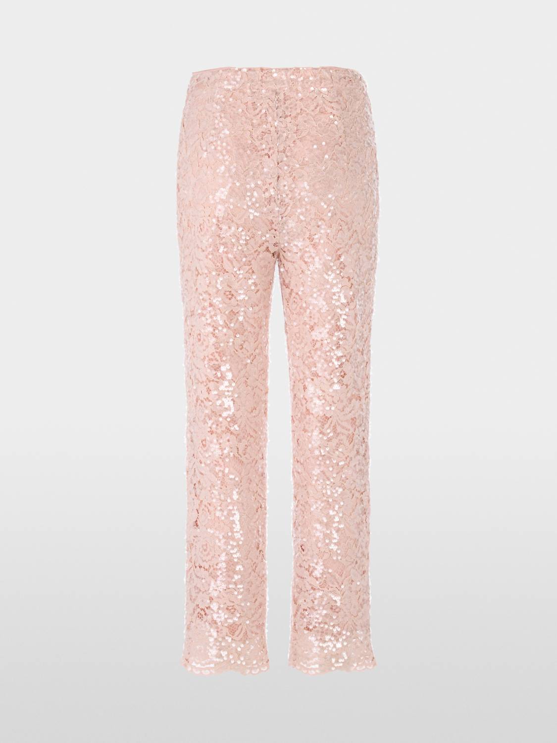Experience elegance with Marc Cain's Fria Sequined And Lace Trousers, designed in a stunning pink hue perfect for any dinner party or New Year's Eve celebration. These trousers boast a high-rise waist and a straight, slightly cropped 28-inch leg length, featuring a textured design with dazzling sequins for a touch of luxury. The comfort of the elasticated back complements the sleek, pull-on style, while the lined interior ensures complete opacity. Crafted from 73% Polyamide and 27% Viscose, they promise a relaxed fit. Care for these special trousers with a gentle hand wash and avoid tumble drying or ironing to maintain their pristine appearance.