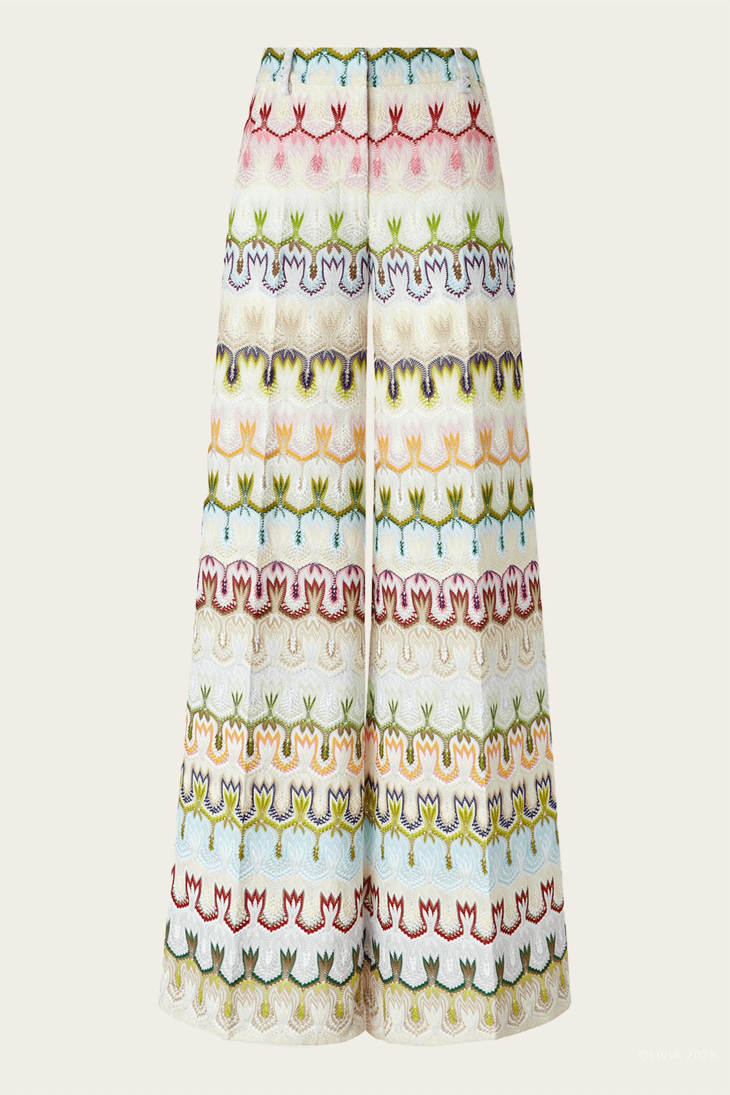 Pattern Wide-Leg Trousers by Missoni offer a sophisticated flair for any dinner party with their elegant high-rise fit. Featuring an abstract floral pattern in multicolor derived from a blend of 76% rayon and 24% cotton, and reinforced with a 100% polyester lining, these trousers are expertly crafted in Italy. The wide-leg silhouette seamlessly combines contemporary design with classic lace workmanship, providing both stylish comfort and structure. Closure is secured with a zip, and care instructions include dry cleaning with tetrachloroethylene, steaming, and laying flat to dry.