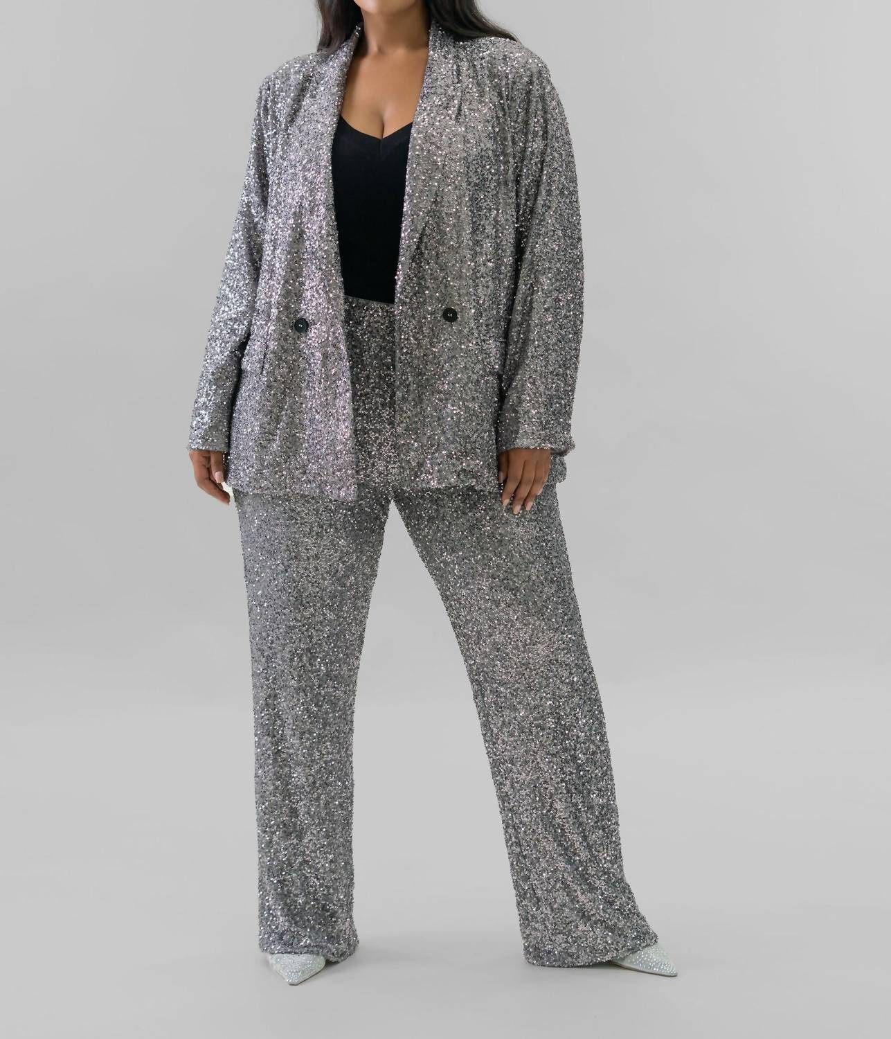 Introducing the Freddie Sequin Trousers by Never Fully Dressed, perfect for making a statement at any evening event. Crafted with a textured, sparkly embellishment in a chic gunmetal hue, these trousers are designed with a flared leg in a regular fit. They feature a convenient back zip closure and are fully lined for comfort. This standout piece is designed with a maximalist flair, guaranteed to turn heads.