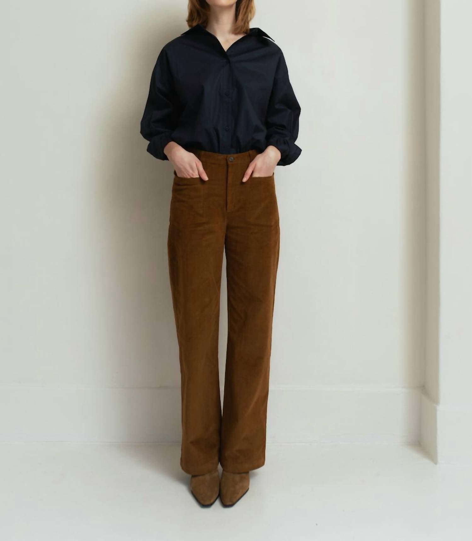 Discover the Wilma Corduroy Trouser by Paper Label, designed for modern elegance in a rich Tobacco shade. Crafted from a cotton blend with a slight stretch, these trousers feature a mid-rise, wide-leg fit with sleek front welt pockets and a button closure. Made from 98% cotton and 2% spandex, these trousers offer both structure and flexibility. Care instructions include washing inside out in cold water, avoiding bleach, and tumble drying on low; low-temperature ironing is recommended. With an inseam of 30.5 inches, they seamlessly blend polished style with casual versatility.