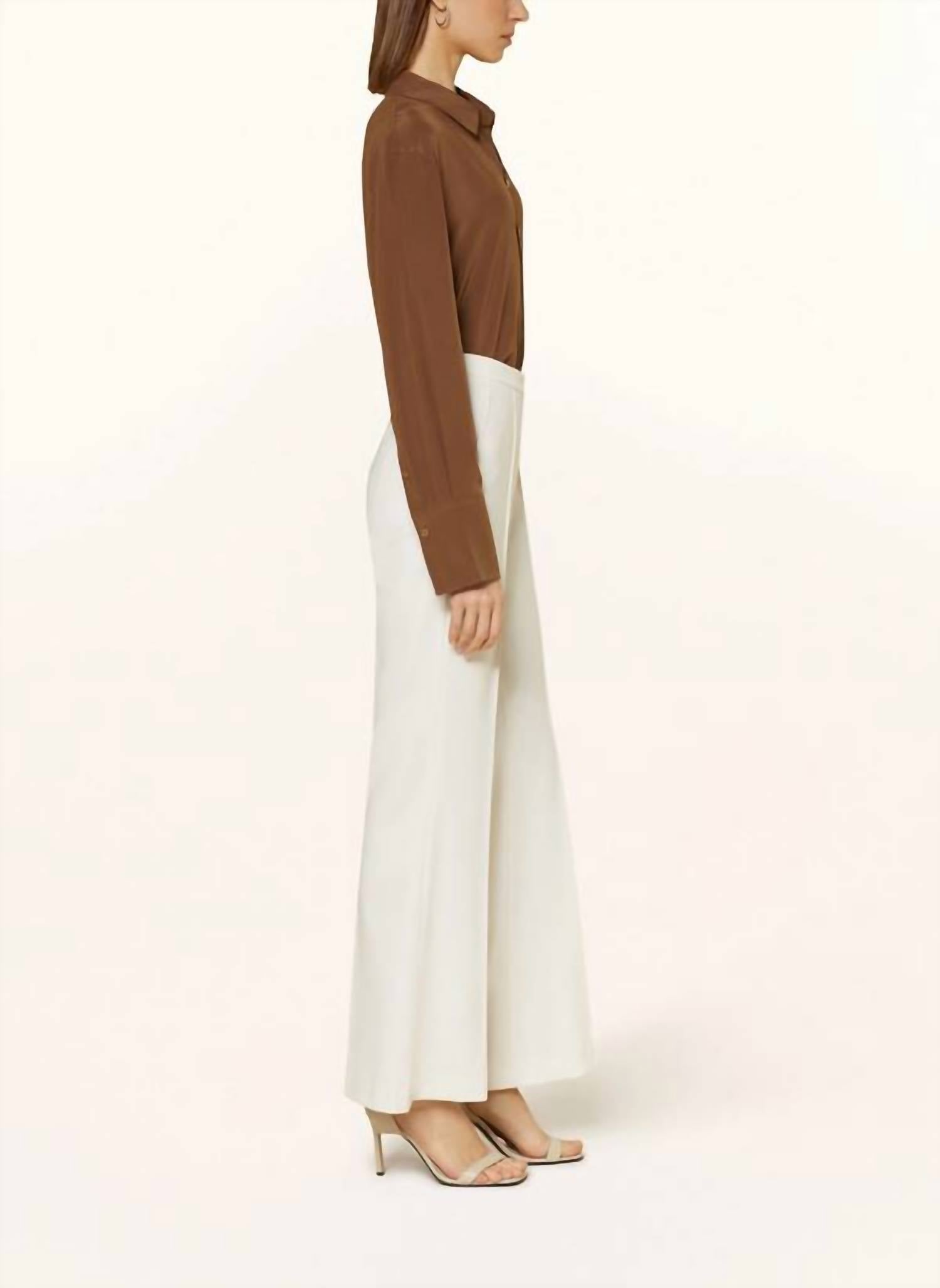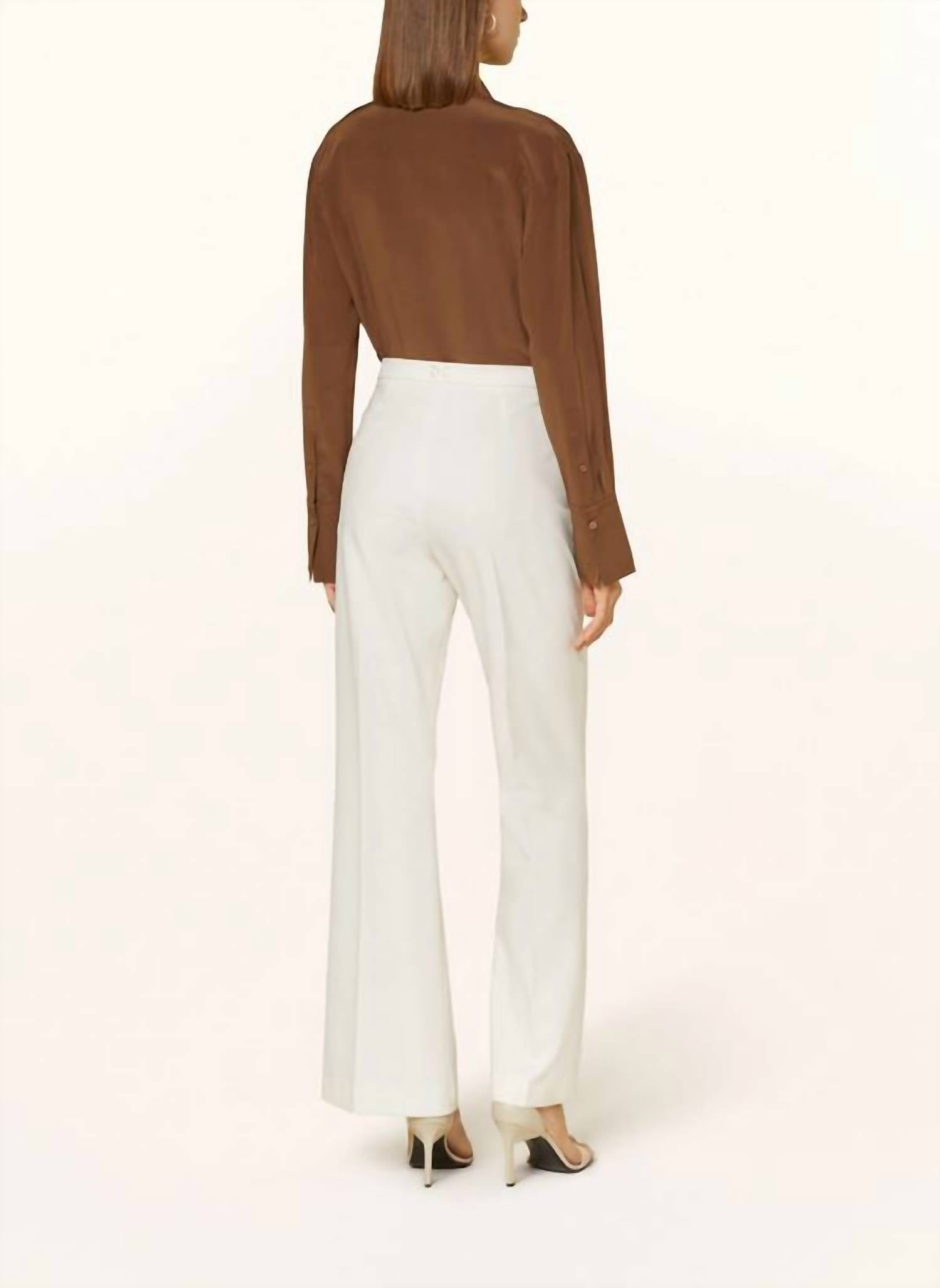 Doro Bootcut Trousers have a normal rise. They feature permanent creases, side pockets, and a logo detail on the back of the waistband. The trousers close with a button, hook, and zipper. Made from stretch fabric consisting of 67% polyester, 29% viscose, and 4% elastane, they offer comfort and flexibility. In size 36, the waist measures 78 cm, the front rise with waistband is 25 cm, and the inseam is 83 cm. Care instructions include washing at 30°C on an easy care cycle, no bleach or tumble drying, medium ironing, and professional dry cleaning with a normal process.