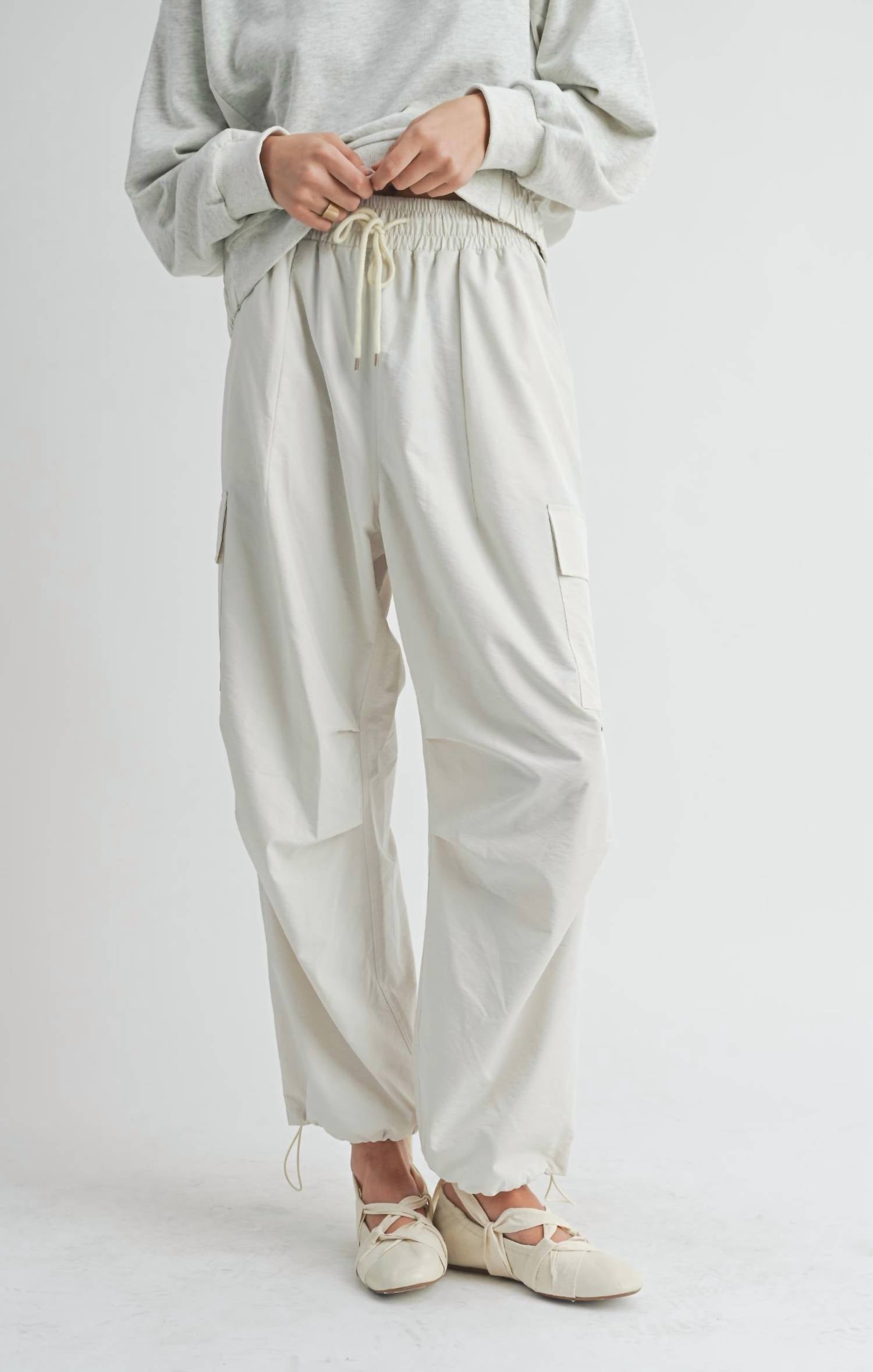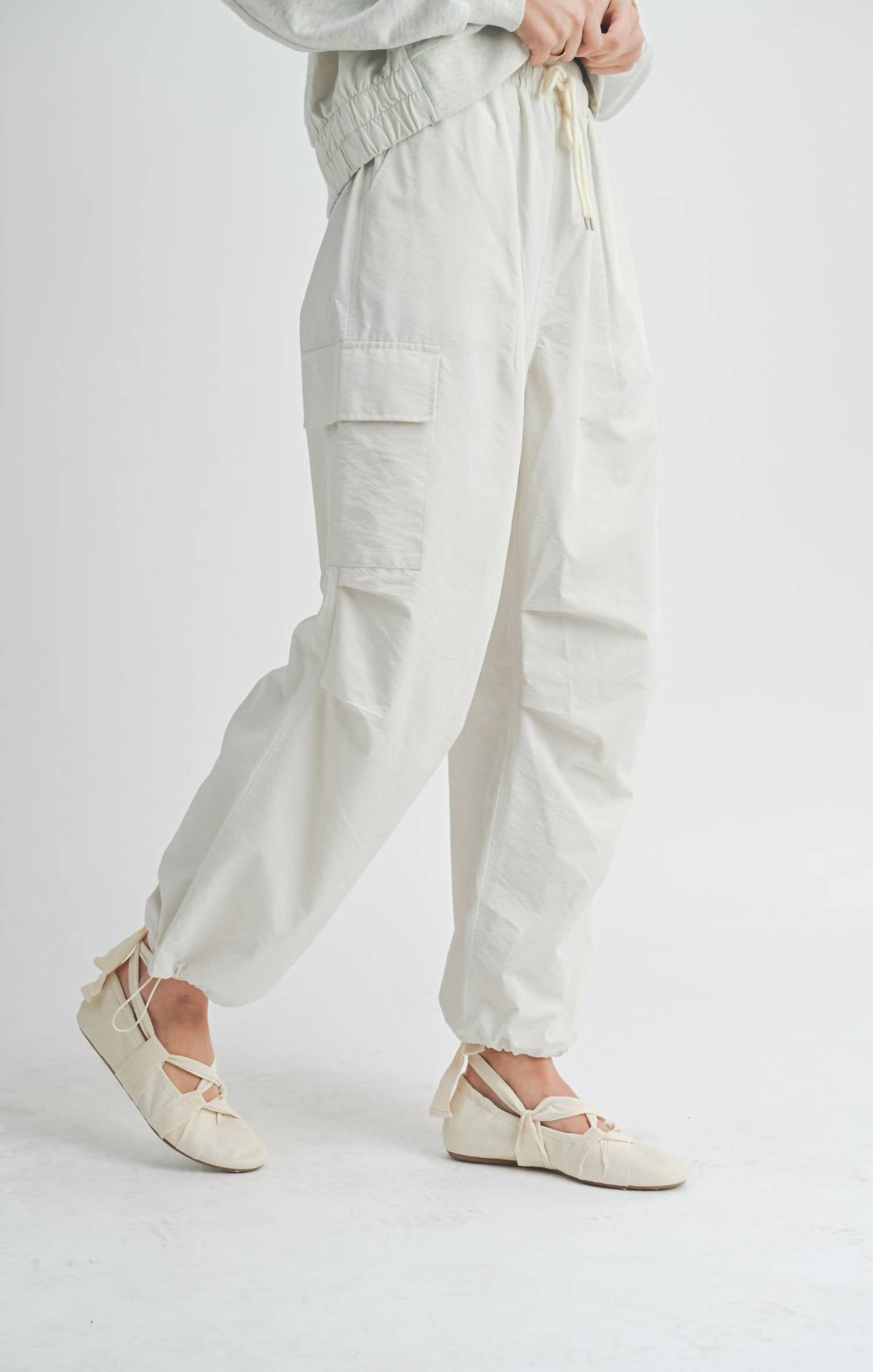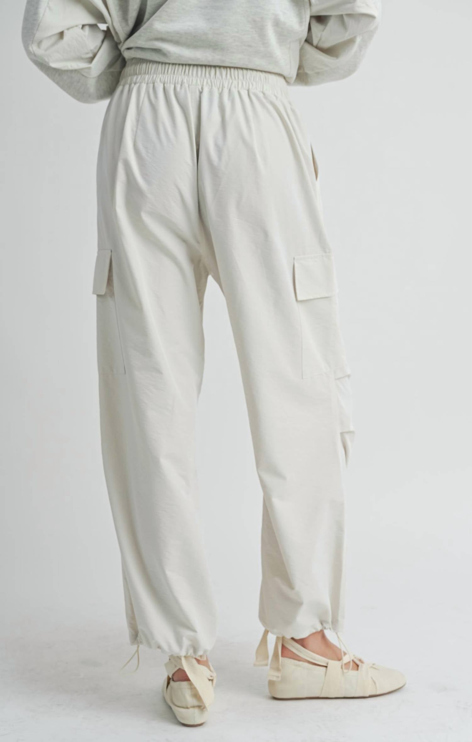 Introducing the Vita Elastic Waist Cargo Pants by Sadie & Sage, designed for both style and comfort in a chic ivory hue. These pants feature a wide leg style and are crafted from a durable blend of 70% polyester and 30% nylon. With practical side cargo pockets and an elastic waistband with a drawstring, they ensure a cozy fit, ideal for fitness or casual outings. Closure: Pull on. Perfect for spring occasions like Easter, these pants pair seamlessly with the coordinating Vita Crewneck for a complete look.