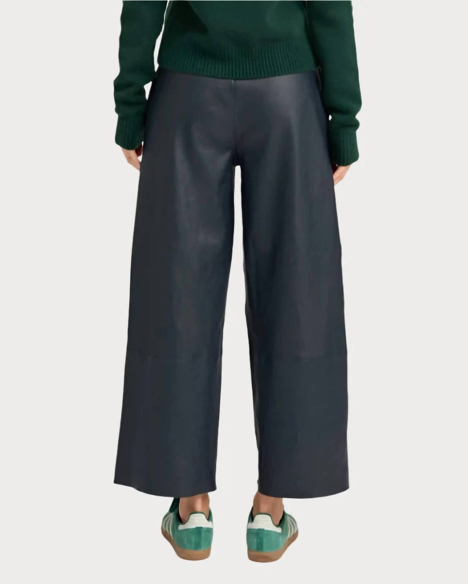 Introducing the Cropped Baggy Leather Pants by SPRWMN, perfect for blending style and comfort in a sleek midnight hue. Made from 100% French Lambskin and lined with cotton-Lycra, these trousers feature a wide-leg silhouette and a relaxed mid-rise fit. These pull-on pants boast functional side pockets and an athletic-inspired drawstring waist for a casual yet sophisticated look. Care for them with a leather specialist clean, and note that they fit true to size, with the lambskin softening over time.