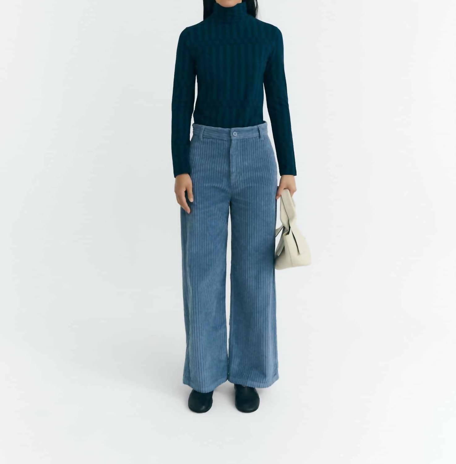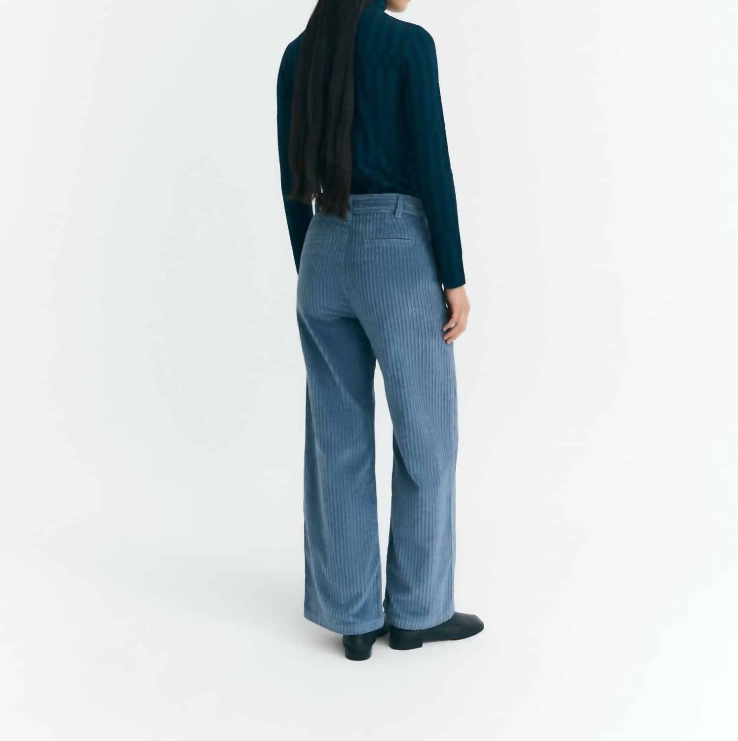 The Karina Cord Trousers by Thinking MU offer a sophisticated touch with their luxurious wide wale corduroy in a subtle blue-grey hue. Crafted from organic cotton, these high-rise trousers feature a straight leg silhouette and are made in India. They include a practical zip and button closure, complemented by functional side and back pockets, ensuring convenience. Designed for easy care, these trousers can be machine washed, making them a stylish and practical addition to any wardrobe.