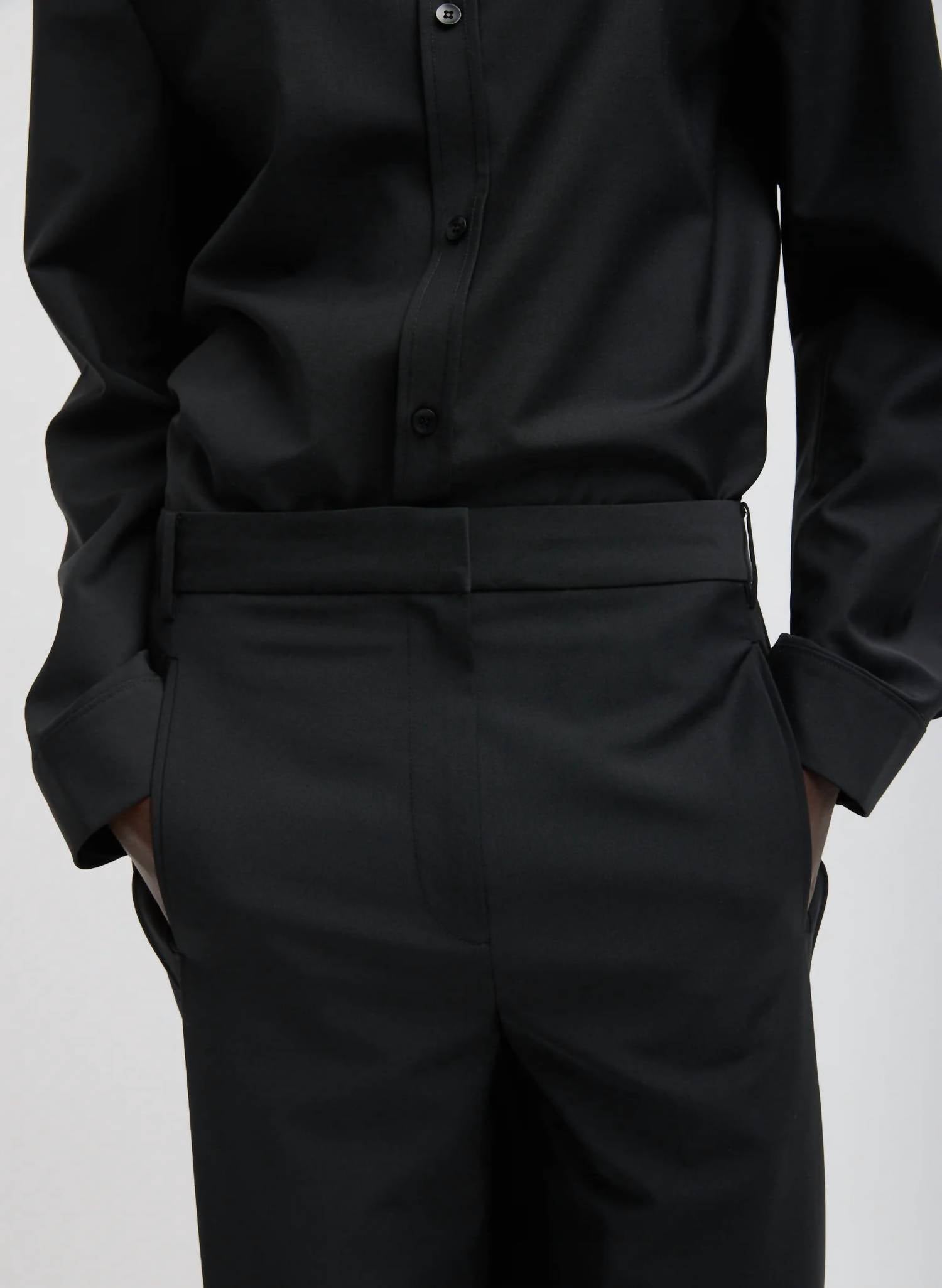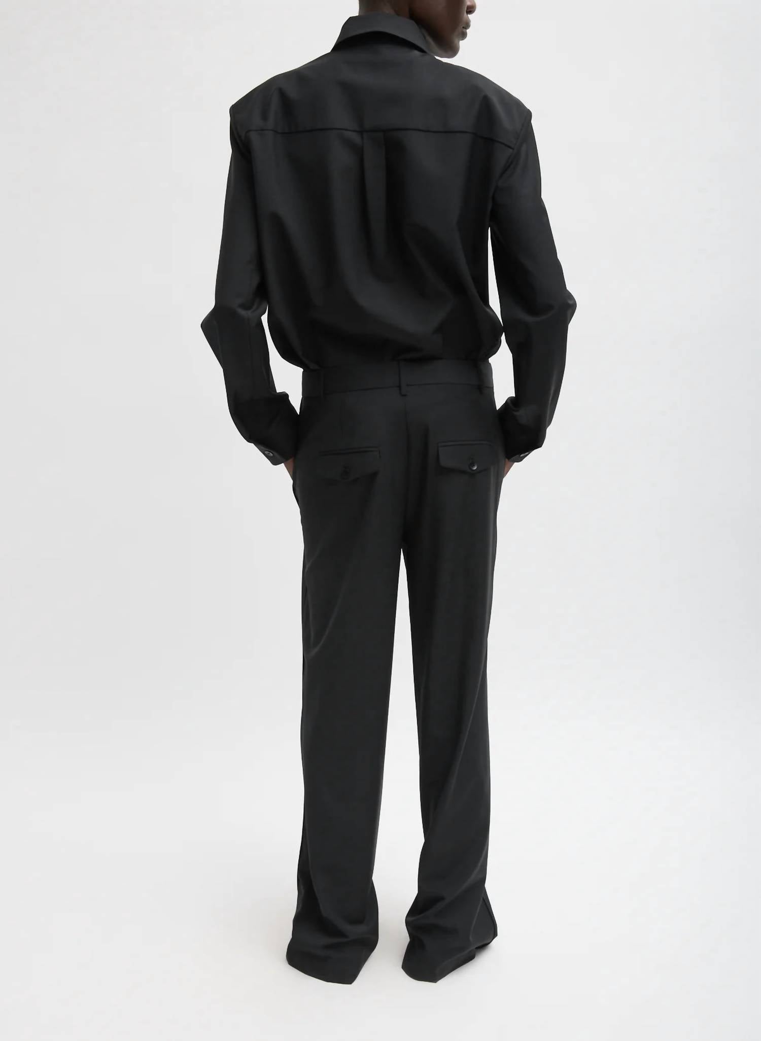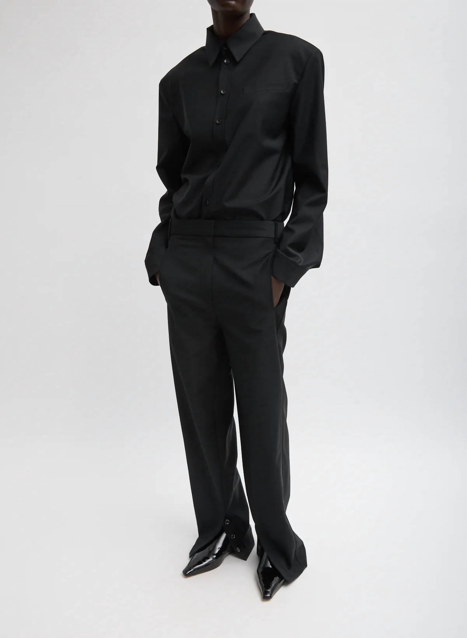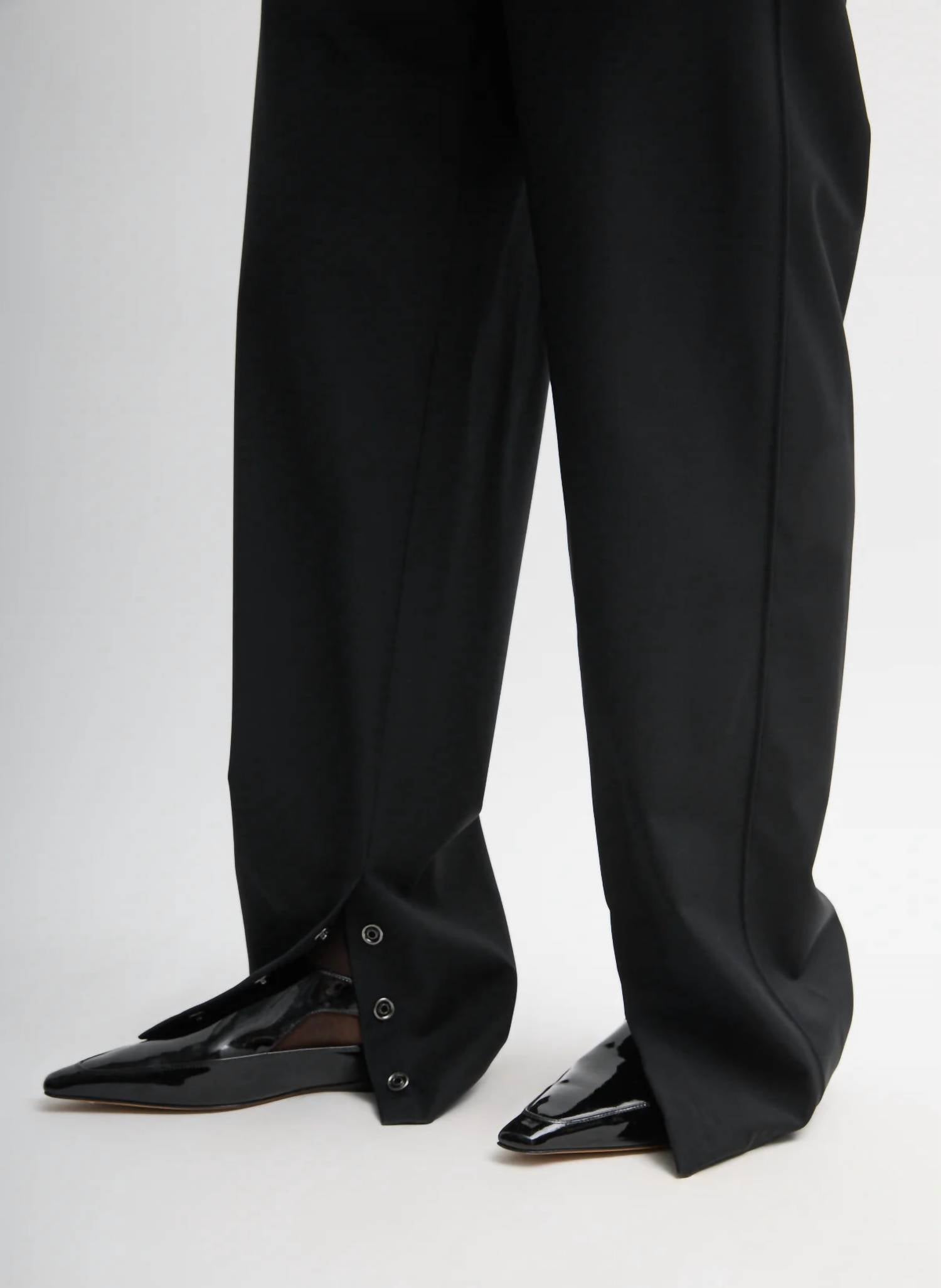 The Recycled Tropical Wool Jules Trouser by Tibi offers a sophisticated flair with its relaxed fit and black solid pattern, perfect for both workwear and dinner parties. Crafted from 53% polyester, 43% wool, and 4% elastane, this versatile piece features a flared leg style with functional pockets. The snap closure at the ankles allows you to seamlessly transition from a streamlined look to dramatic slits. Care instructions include machine wash for easy maintenance.
