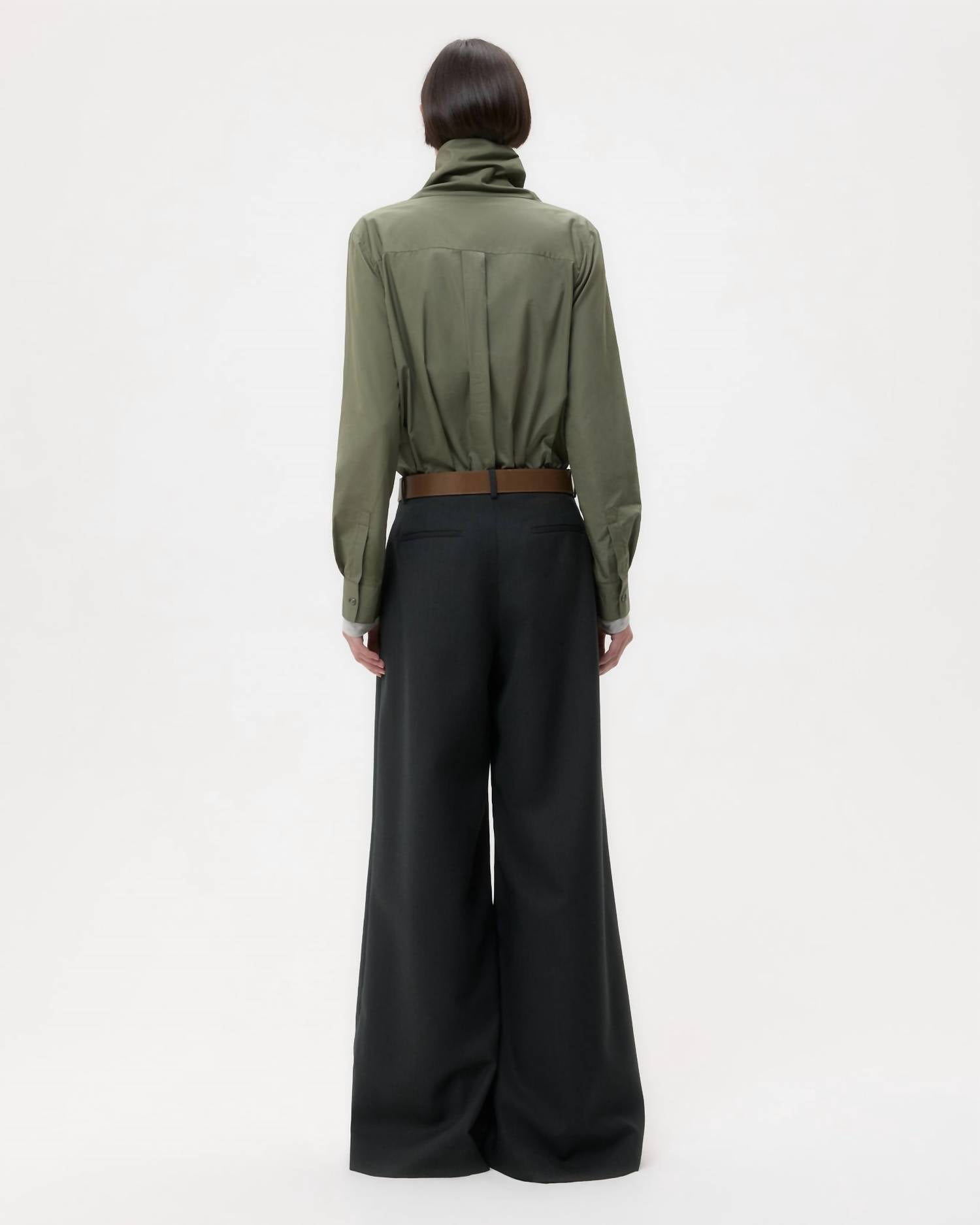 Introducing the Avery Wool Trouser by TWP, expertly crafted in structured wool suiting for a blend of style and comfort. These dark spruce trousers offer a mid-rise fit with a relaxed, wide-leg silhouette, featuring side pockets, back welt pockets, and belt loops for added functionality. The concealed zip and hook and eye closure ensure a streamlined look, perfect for an elegant dinner party or New Year's Eve celebration. Composition: 100% Wool. Care: Dry clean only.