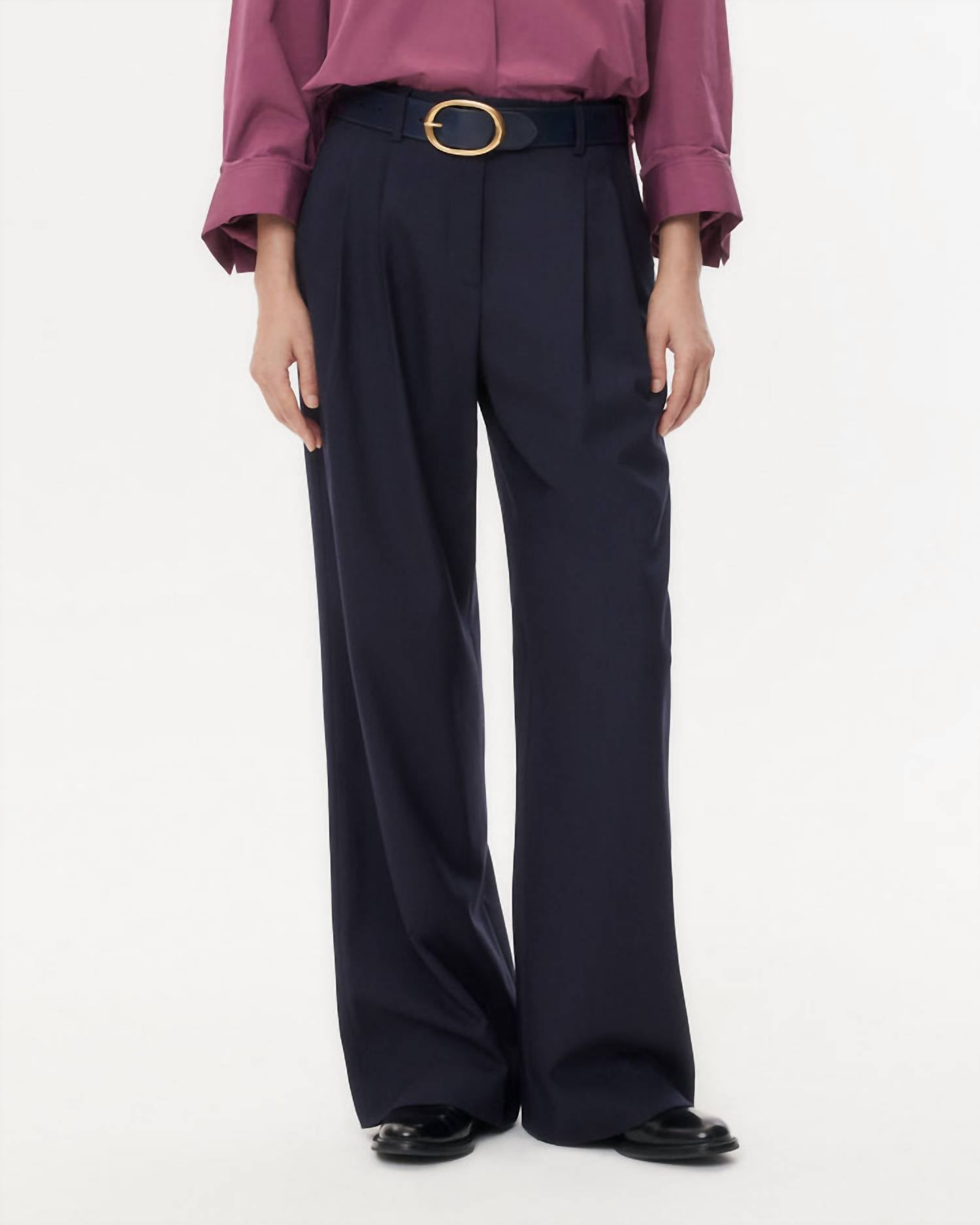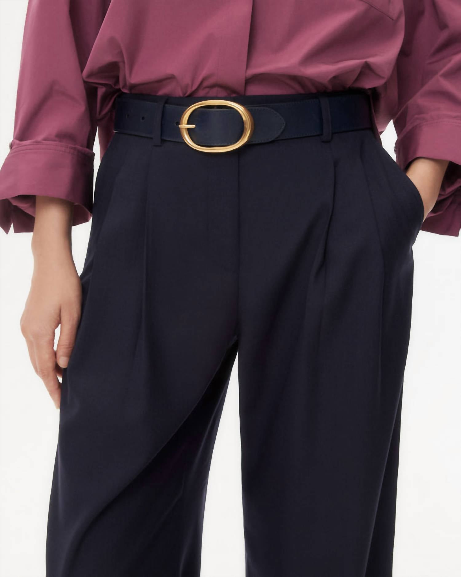 Elevate your workwear wardrobe with the Slim Sullivan Pants by TWP, meticulously crafted for style and comfort. Featuring a high-rise and wide-leg silhouette, these trousers offer a relaxed fit with front pleats, enhancing your ensemble's volume. Made from a refined wool blend comprising 98% wool and 2% elastane, they include functional belt loops, side pockets, and a concealed zip-fly with a hook-and-eye closure. Designed in a sophisticated Midnight shade, these trousers require dry cleaning to maintain their elegant appearance. Model is 5'10'' with 32.5'' bust and 34.5'' hips, wearing size 2.