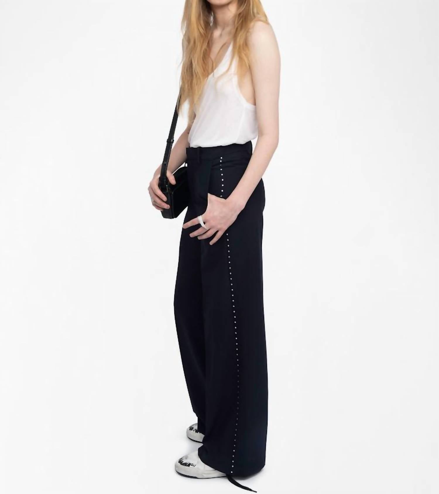 Introducing the Panol Pants by Zadig & Voltaire, designed for the modern woman who values both style and comfort. These wide-leg trousers offer a high waist for a flattering fit and feature Italian and welt pockets with sparkling rhinestone details for added flair. Made from a blend of 43% polyester with recycled fibers, 26% polyester, 23% viscose, and 8% elasthane, with a convenient zip closure. For care, either hand wash or machine wash on a 20°C delicate cycle, then air dry flat and iron inside out at up to 110°C. Model is 177 cm / 5'9" and is wearing a size S, which fits true to size.