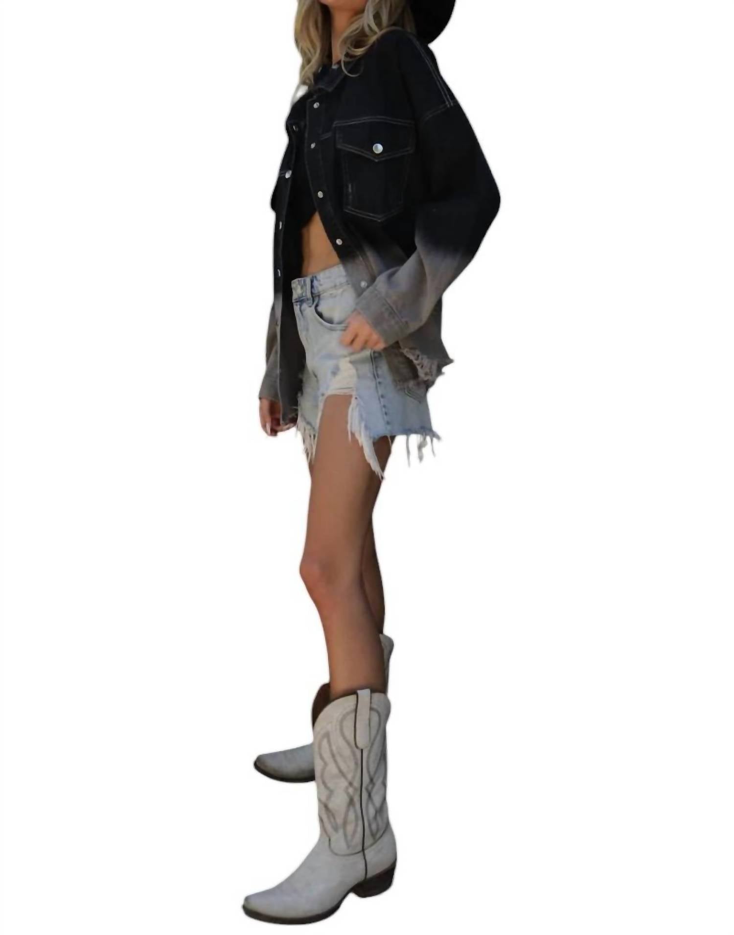 This Mya Rock & Roll Distress Ombre Denim Jacket features gold sequins on 100% cotton fabric, ombre-washed. With a button closure, front lapel pockets, and a distressed bottom hem, it combines edgy style with practicality.